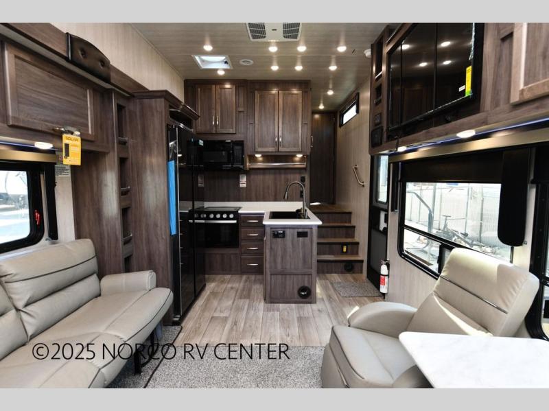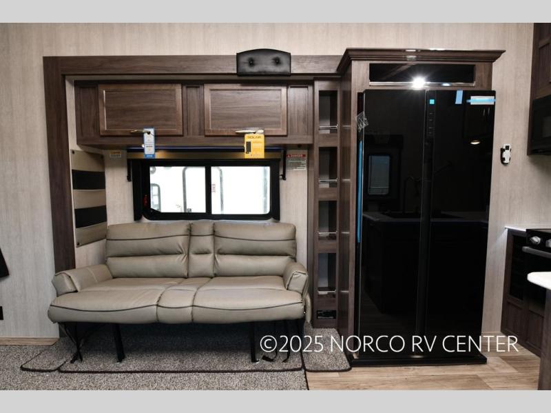 If you want to get away for the weekend with your toys, get away with this Vortex toy hauler. It has a 16' 4" garage to keep your ATVs and dirt bikes secure while you travel. You can accommodate a group of six for sleeping with the king-size bed, power queen bunk and sofas, and everyone will benefit from a hot meal prepared on the three-burner range in the kitchen. You can even keep your cold items fresh by storing them in the refrigerator. The dual-entry bathroom has a door within the main hallway, but it also has a private entrance that leads into the bedroom.