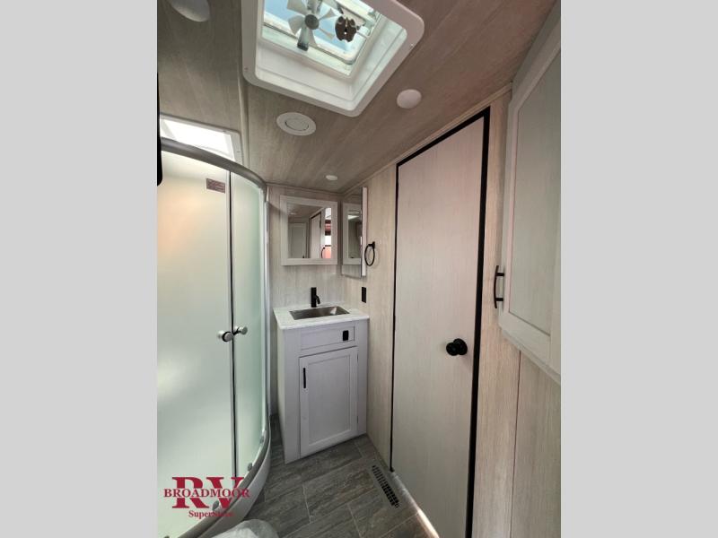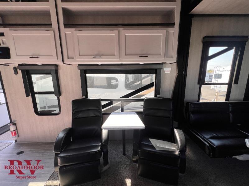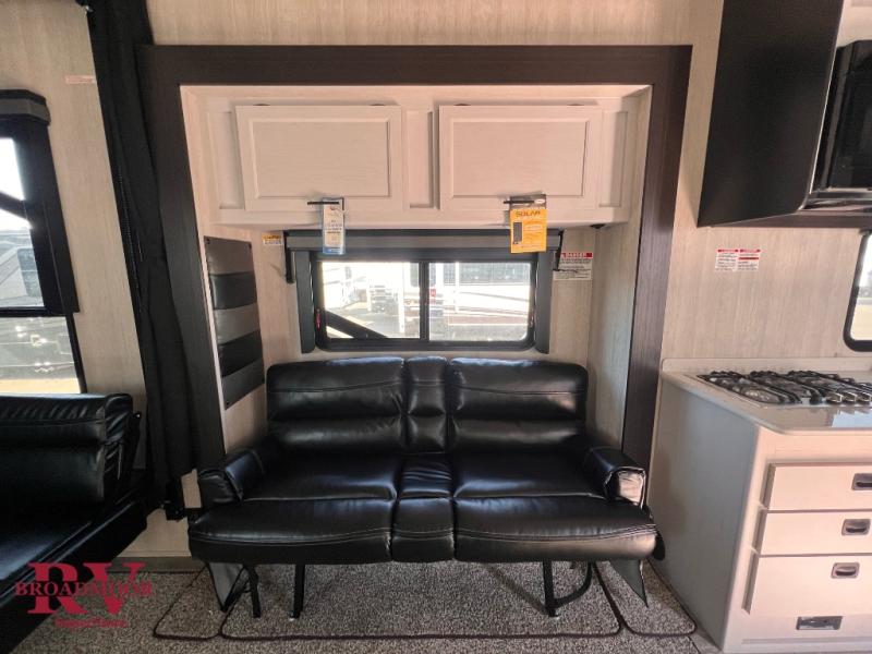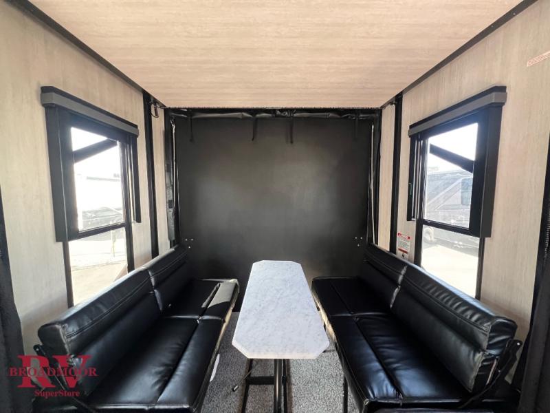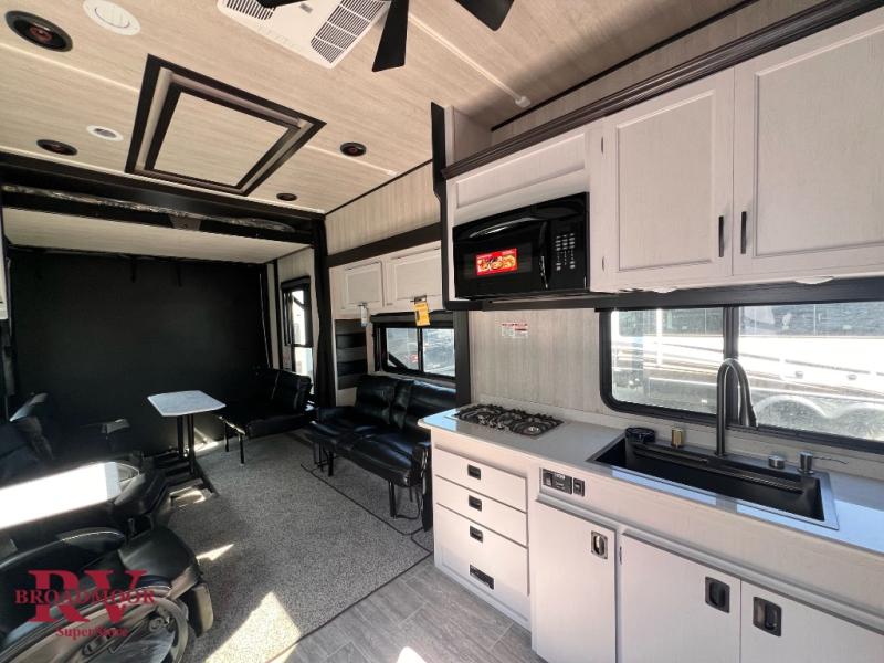 You'll want to add another day onto every trip you take with this Vortex toy hauler! Each night will be ultra comfortable as you stay in the front master suite. This space has a king-size bed with a nightstand and countertop on either side, a wardrobe slide, and a private entrance into the dual-entry bathroom. This means that you can discreetly slip into the shower each morning before heading out into the main living area, and the shower has a skylight above so that you can enjoy some sunshine while you get clean. The Bluetooth stereo can be used for some entertainment throughout the day, or you can simply turn on one of the two TVs.