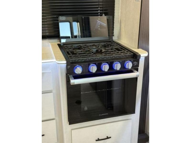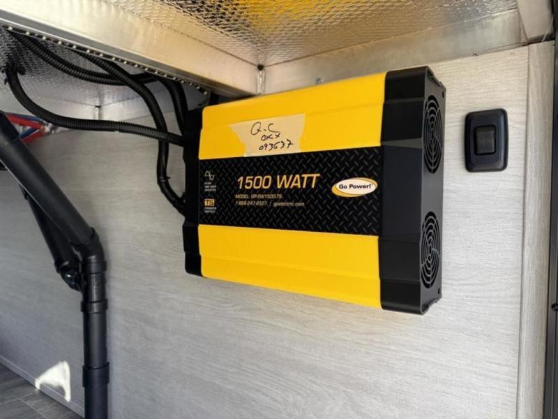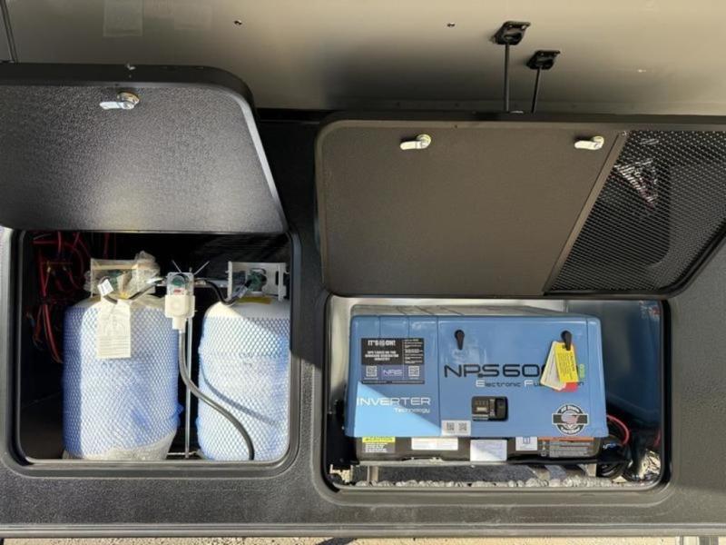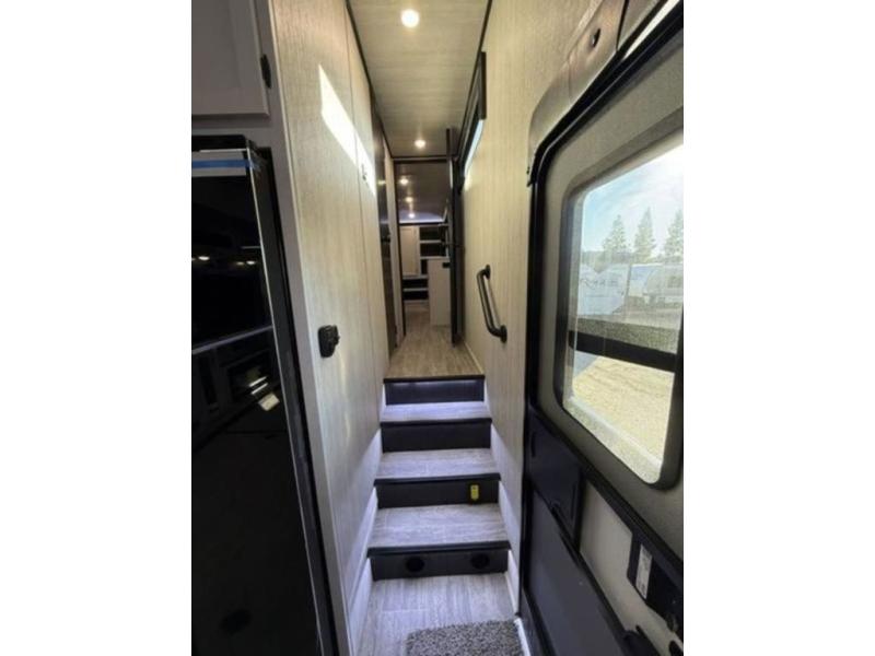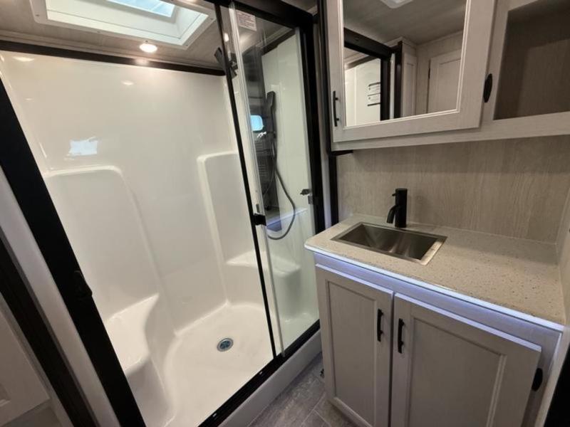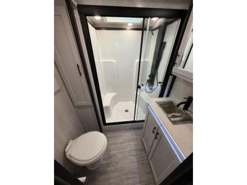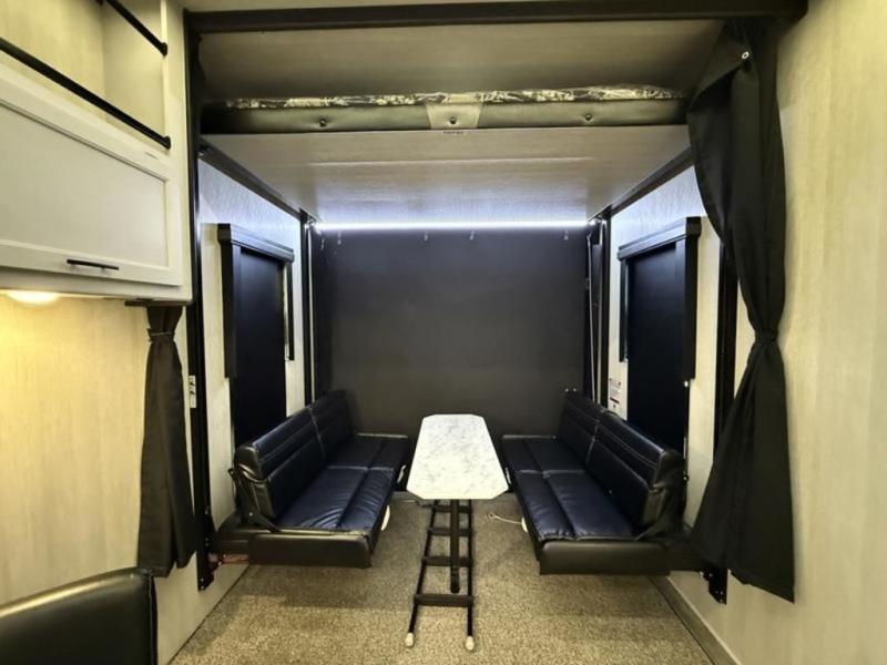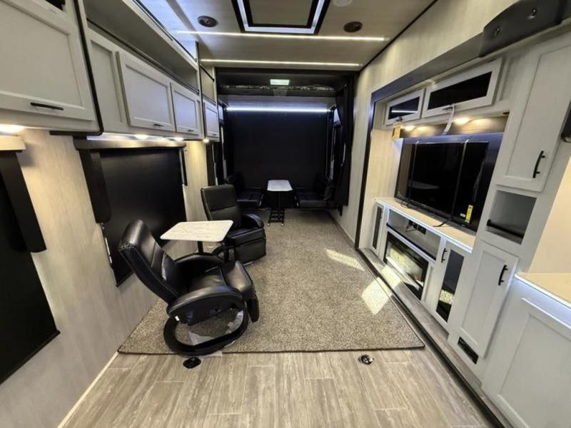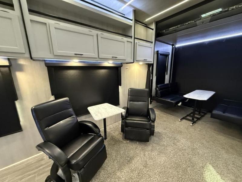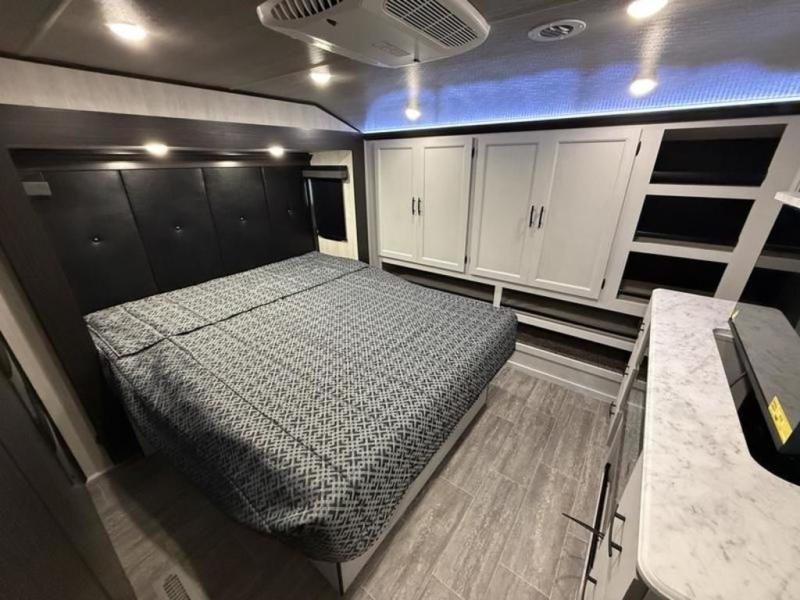 This fifth wheel is perfect for four! The rear bed provides a serene sleeping area, perfect for unwinding after a long day of adventure. The living room is a cozy retreat, featuring two swivel rocker chairs with tables for comfortable seating and relaxation, overhead storage for additional space for luggage and gear, and a TV for entertainment. Enjoy quality time with family and friends in this inviting area. The full bathroom provides a convenient and functional space for getting ready, perfect for daily use. The front bedroom is a peaceful sanctuary, providing a comfortable sleeping area for relaxation.