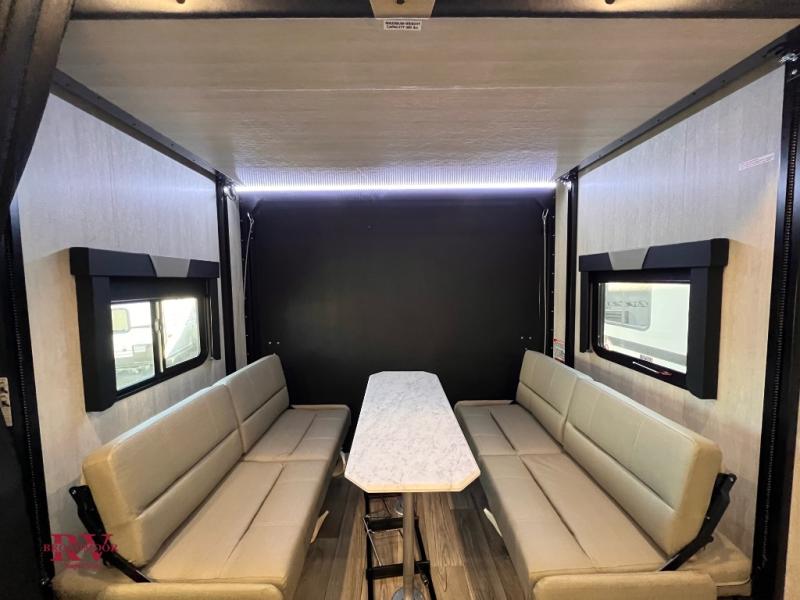 If you and your spouse enjoy hitting the trails while camping then this toy hauler is for you! The cargo area also has two chairs and a sofa with a table to relax on each night. Whip up your best meals on the three burner cooktop, and store leftovers in the refrigerator. The full-size bed with overhead storage will provide a great night's rest, and the full bath in the front corner will let you clean up each day!