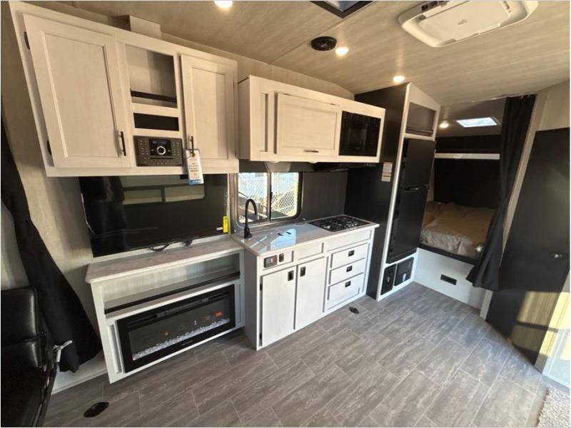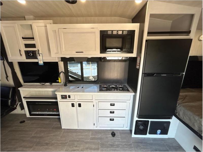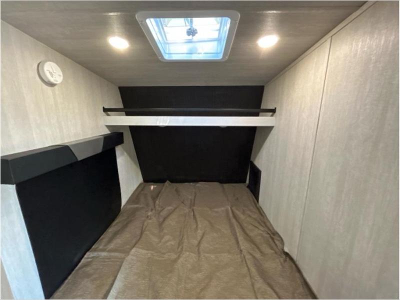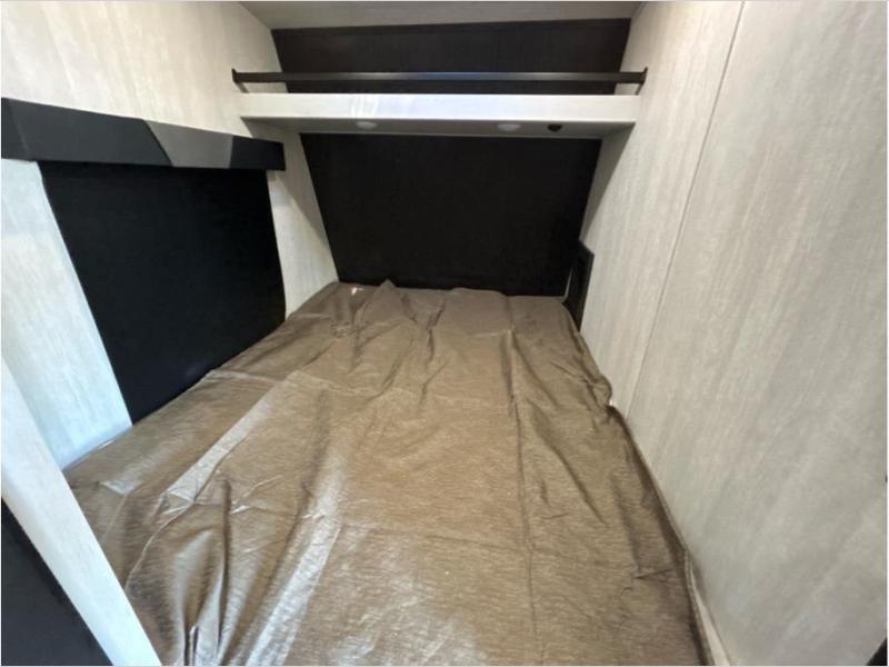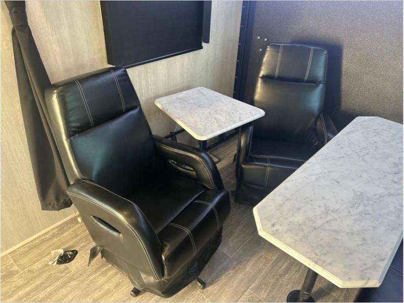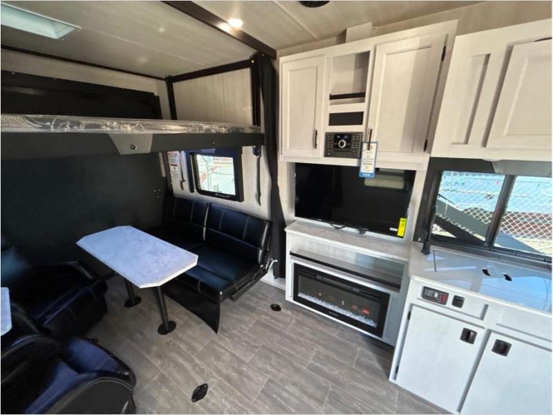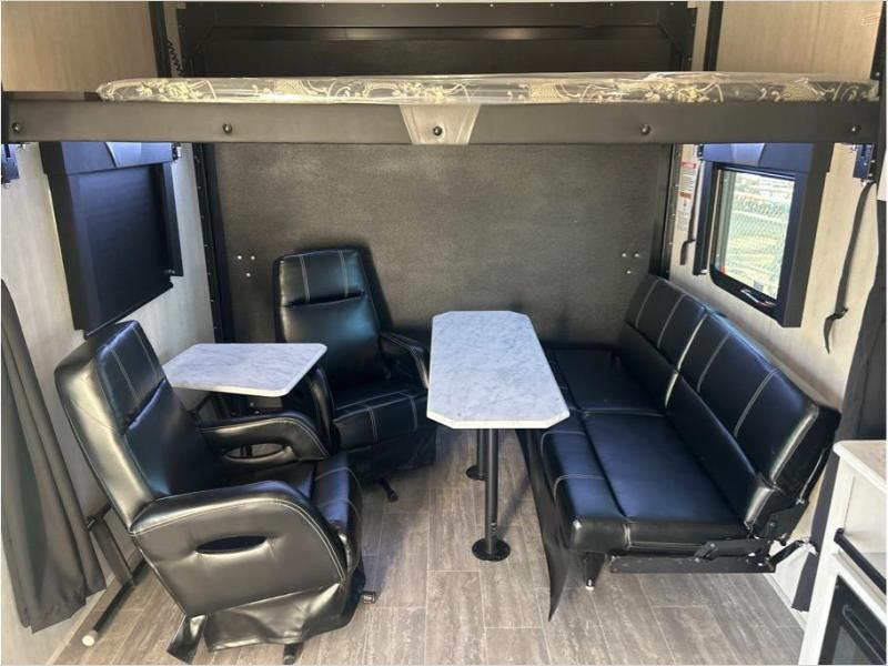 If you and your spouse enjoy hitting the trails while camping then this toy hauler is for you! The cargo area also has two chairs and a sofa with a table to relax on each night. Whip up your best meals on the three burner cooktop, and store leftovers in the refrigerator. The full-size bed with overhead storage will provide a great night's rest, and the full bath in the front corner will let you clean up each day!