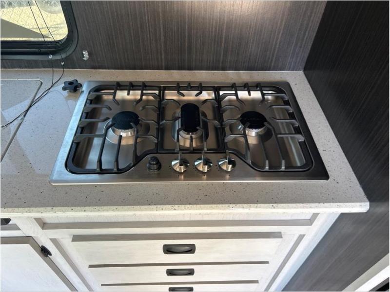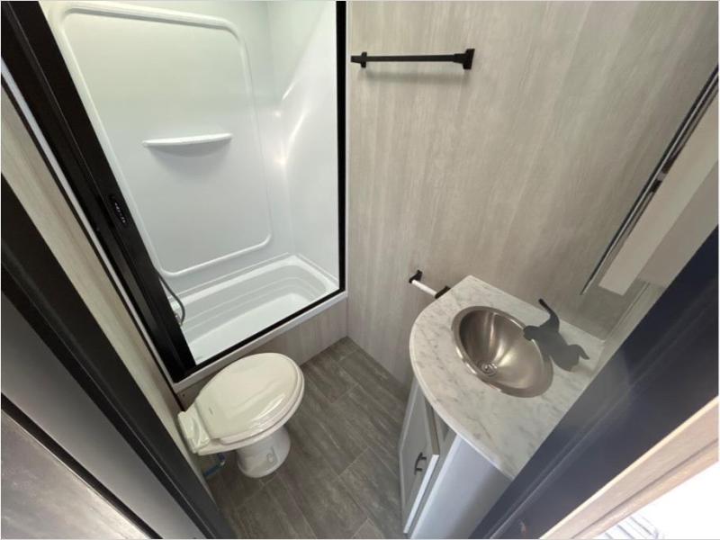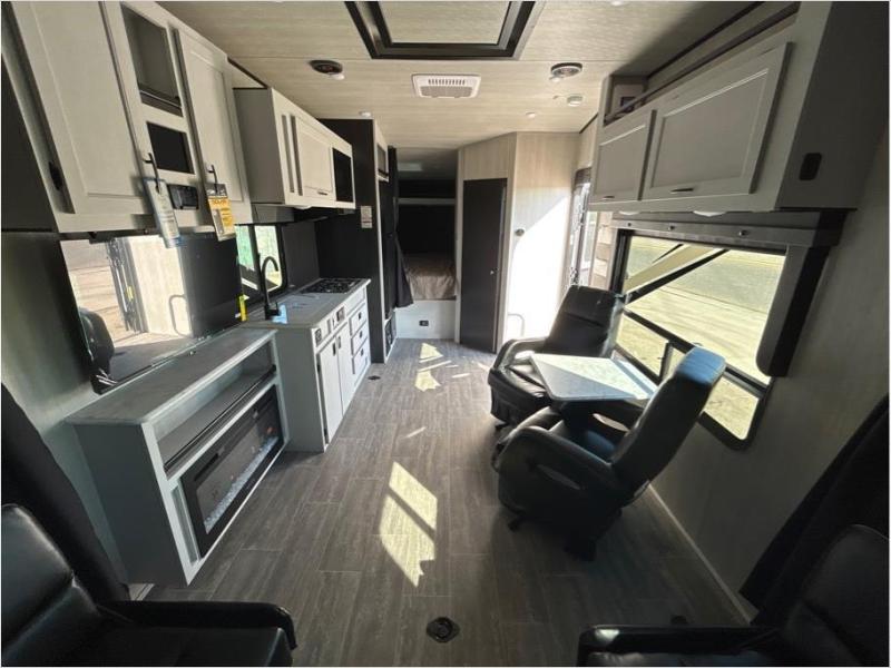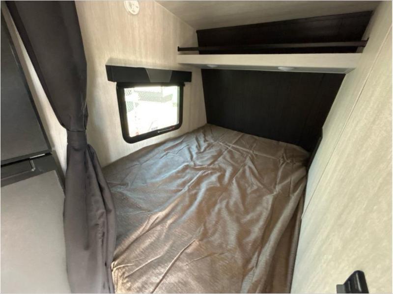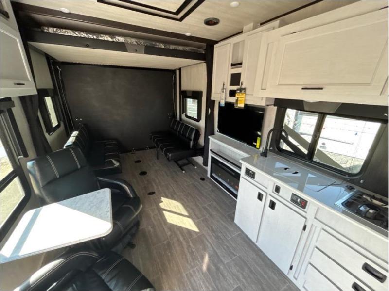 Pack your bags and load up your toys into the cargo space with the 7' ramp door of this toy hauler! The LED lights throughout help you to see clearly day or night, and the stereo with speakers allow you to play your favorite tunes while you cook dinner on the three burner cooktop. Sleep good each night on the front flip-up bed with overhead cabinets for your items, and you will appreciate how close the front corner bathroom is during those nighttime bathroom breaks. The Interior and exterior Deluxe package are forced options and come with handy features like two swivel rockers, a 13.5 BTU A/C, and exterior speakers!