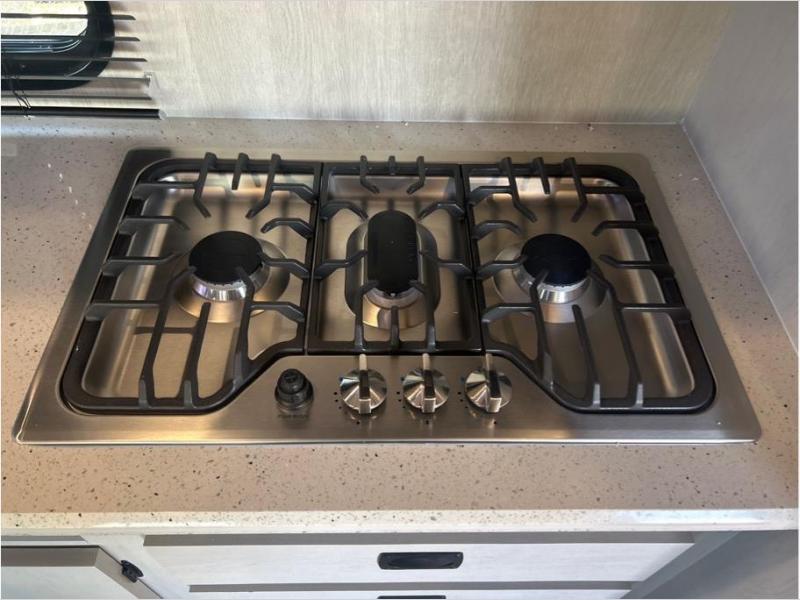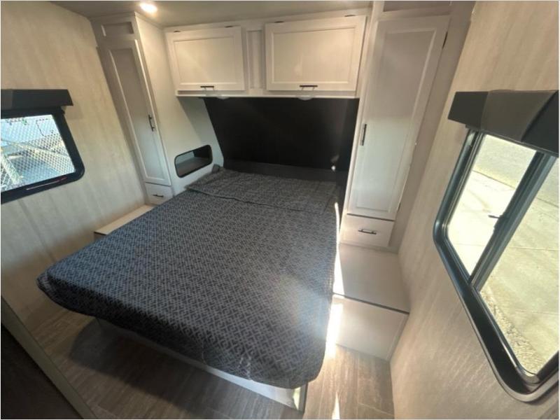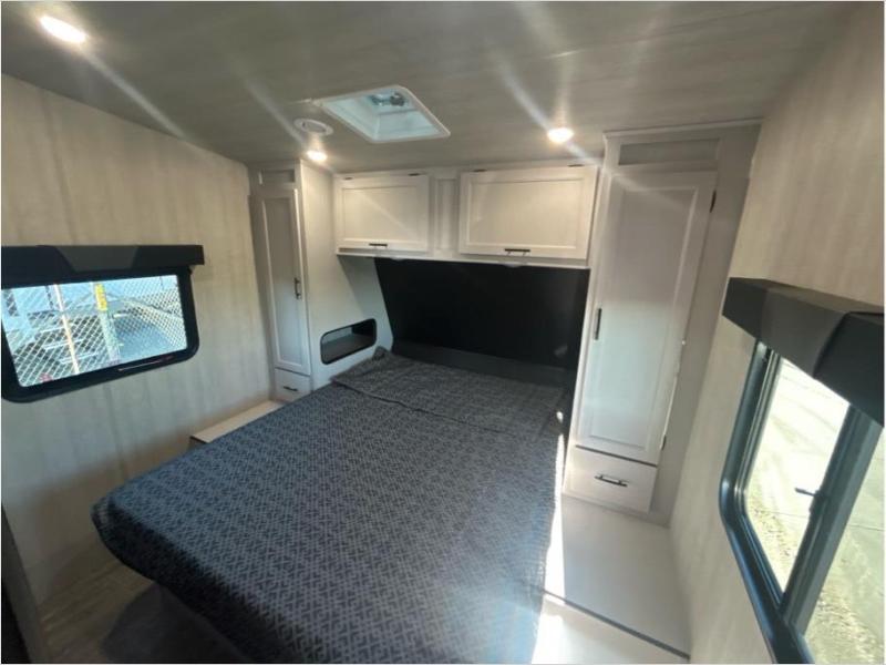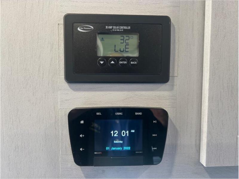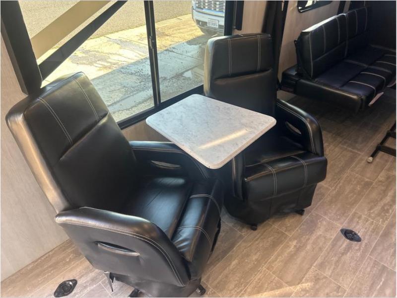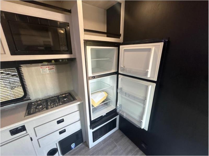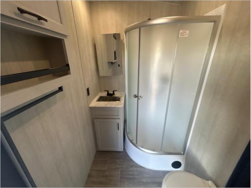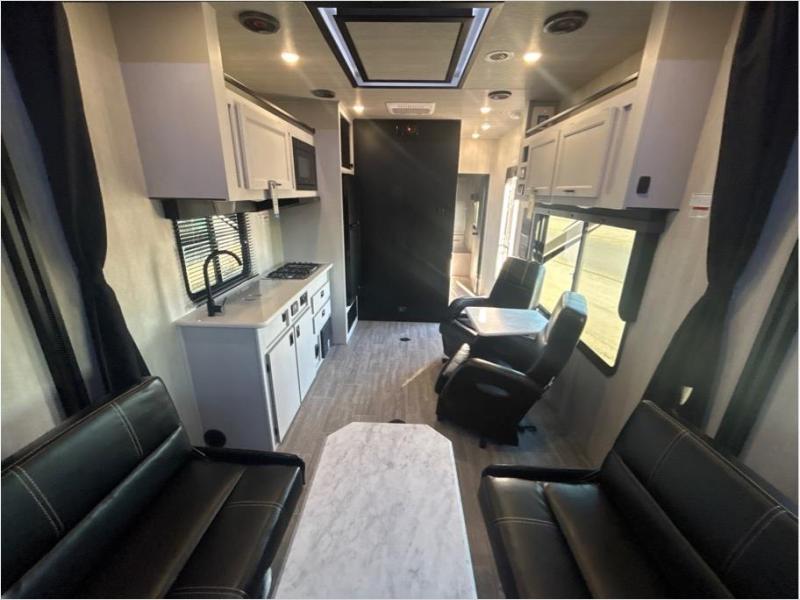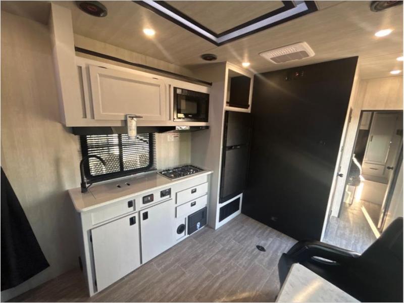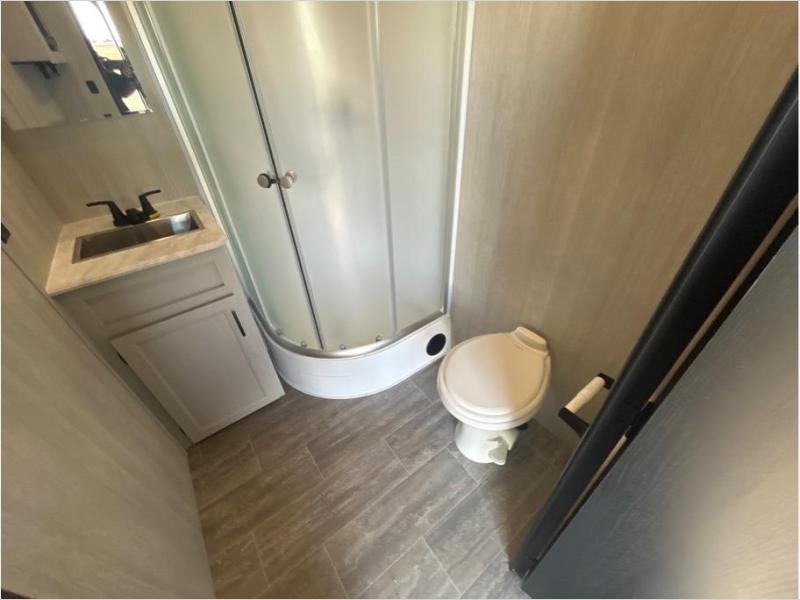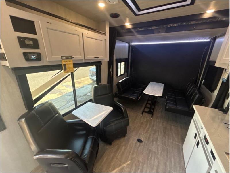 Head to your favorite trails and camp out with this toy hauler! In the rear, there are two swivel rockers to relax on, along with an opposing rear power dinette with a single bed for your guests. Keep your electronics charged with the 12V USB charger and stay connected while off grid with the 200W solar panel. Prepare your best home cooked meals with the three burner cooktop and 10 cu. ft. 12V refrigerator then lay down on the RV queen bed in the front private bedroom after dinner. You can also stay clean with the radius shower in the full bathroom!