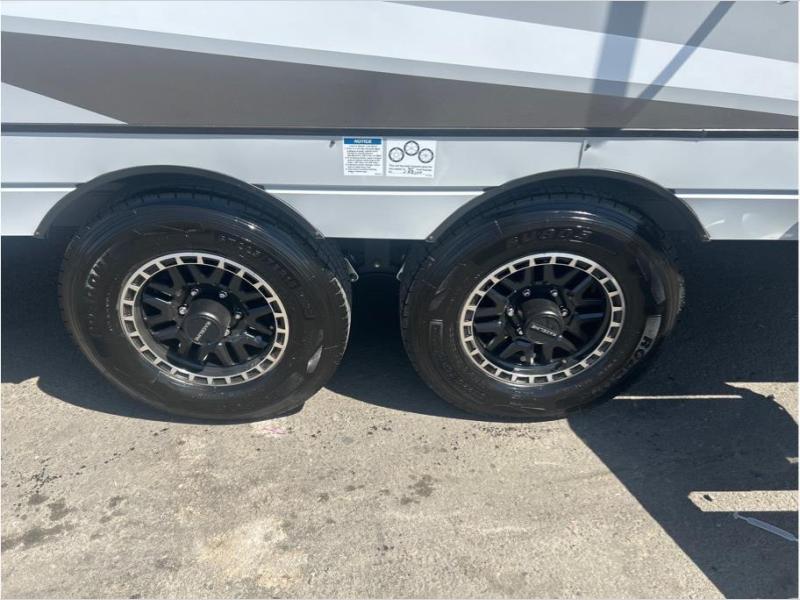 Looking for plenty of cargo space for your toys, a private bedroom for yourself with a walk-around bed, and a spacious full bath? You have found it with this toy hauler! You will also find lots of storage in the bedroom wardrobes, the overhead cabinets and along the exterior to carry all of your clothing, food and gear. The L-shaped kitchen offers full amenities including a 10 cu. ft. 12V refrigerator and microwave to keep everyone fed. You can dine inside at the booth dinette or on the sofa, or head outdoors to relax under the power awning. This model also includes two powered rear queen beds for guests to sleep on!
