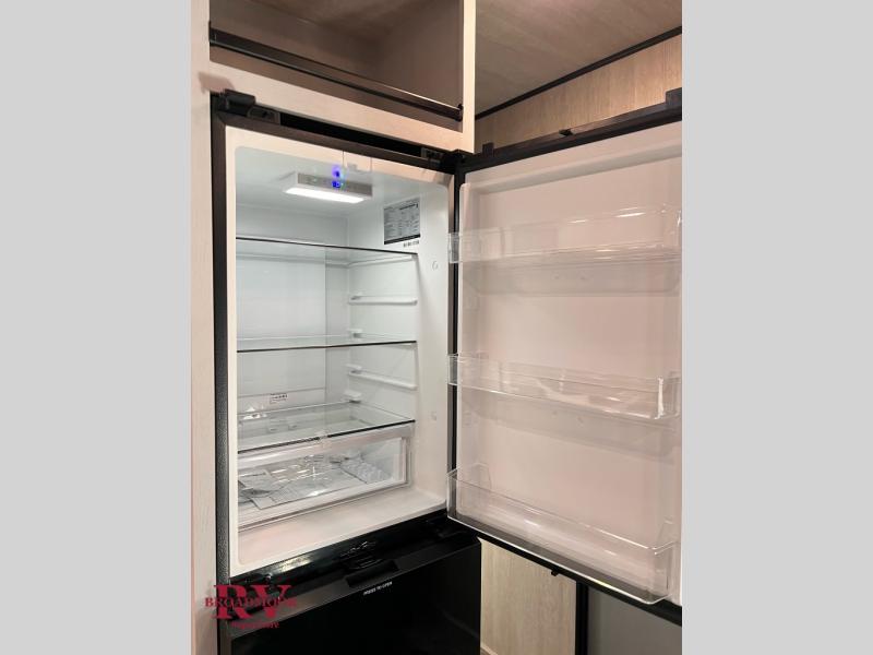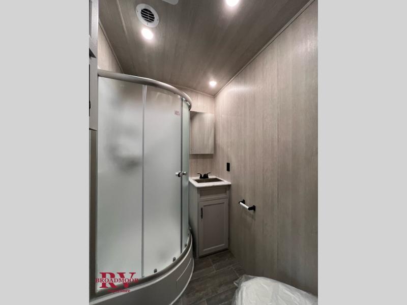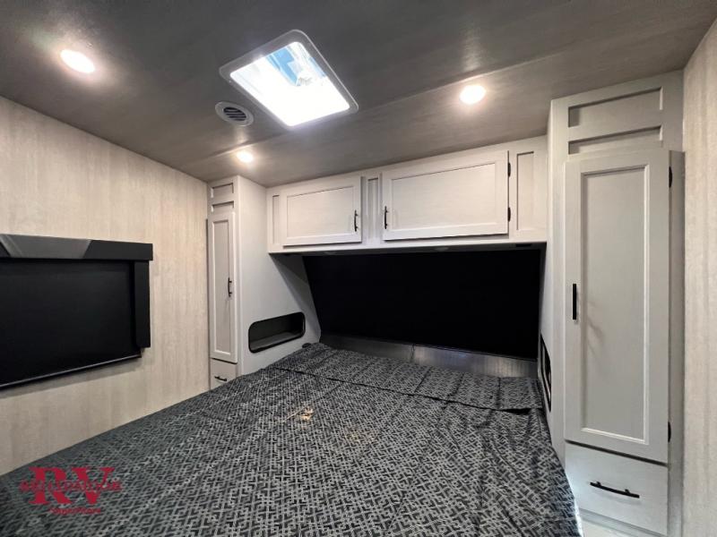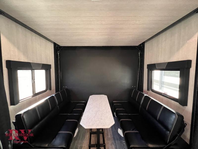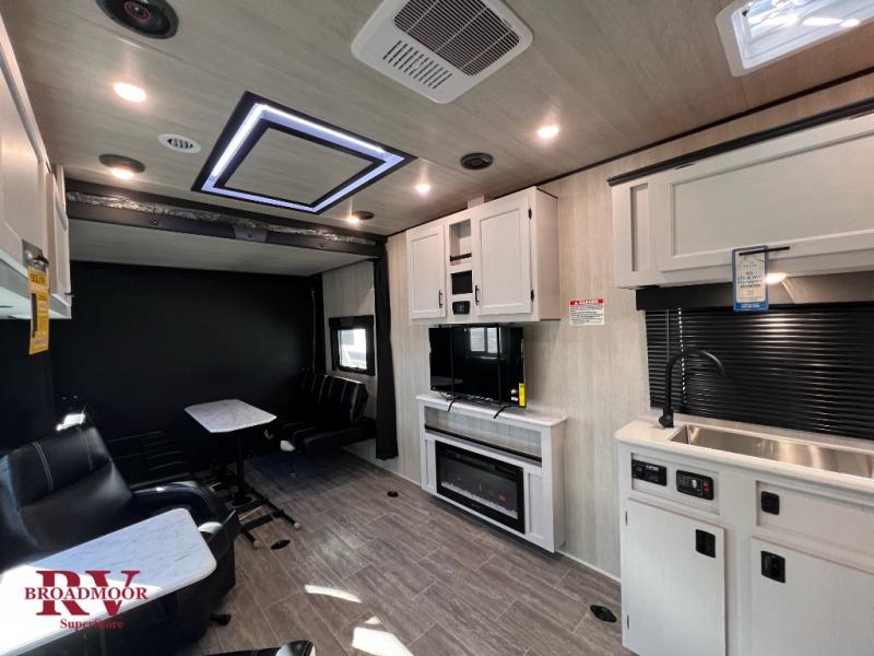 Grab your riding gear, load up the bikes, and head for the hills in this toy hauler for four. Once your toys are unloaded from the 15' total garage space, you can relax on the dual opposing sofas or on the dual lounge chairs with a table in between. There is also an entertainment center across from the chairs, and an optional queen bed above the sofas if you need more sleeping space. A full kitchen with a three burner cooktop, microwave oven, sink, and refrigerator lets you make meals each day, and the full bath will be much appreciated after trail riding. The front of this model features the private bedroom, complete with an RV queen bed, dual wardrobes, and an overhead cabinet for books and more!