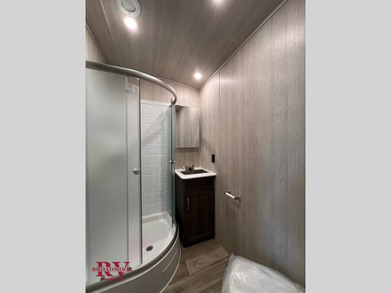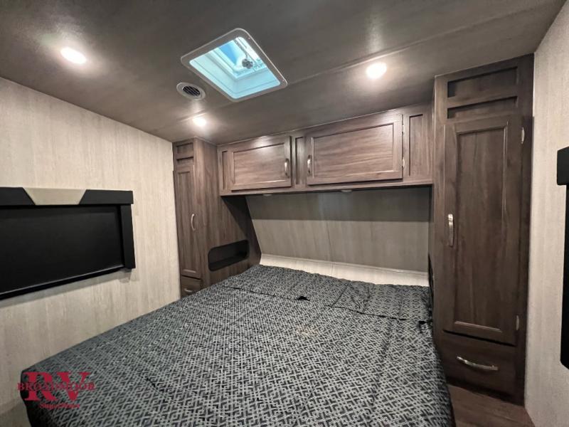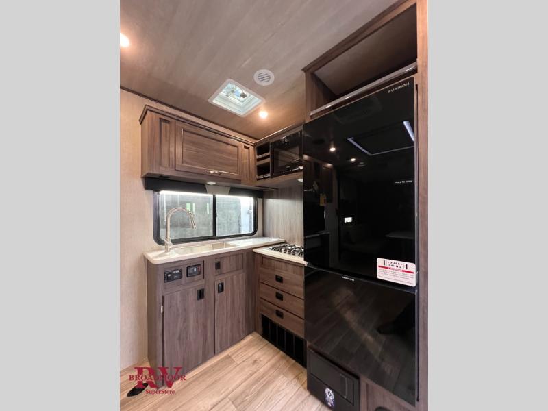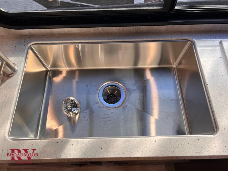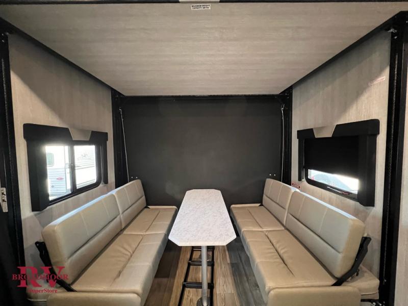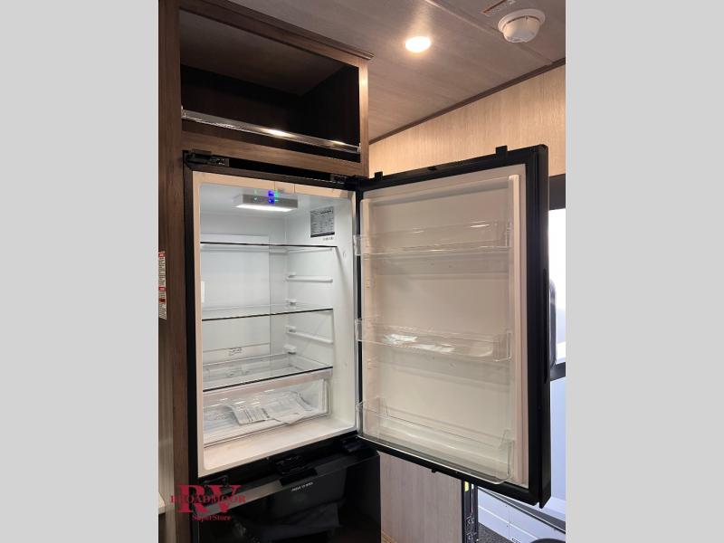 Grab your riding gear, load up the bikes, and head for the hills in this toy hauler for four. Once your toys are unloaded from the 15' total garage space, you can relax on the dual opposing sofas or on the dual lounge chairs with a table in between. There is also an entertainment center across from the chairs, and an optional queen bed above the sofas if you need more sleeping space. A full kitchen with a three burner cooktop, microwave oven, sink, and refrigerator lets you make meals each day, and the full bath will be much appreciated after trail riding. The front of this model features the private bedroom, complete with an RV queen bed, dual wardrobes, and an overhead cabinet for books and more!