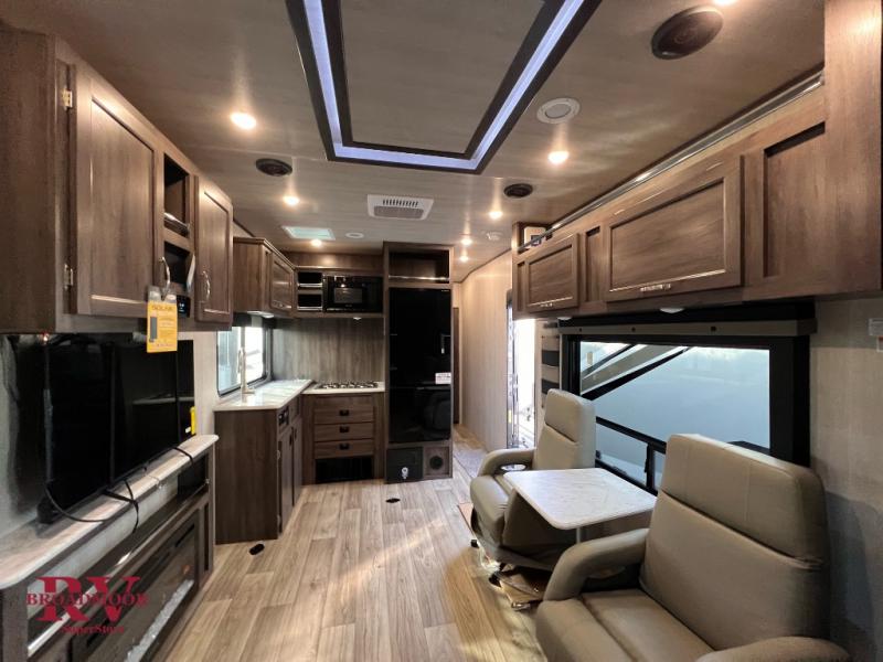 Optional Equipment Installed On This Unit: Yamaha Generator, Fuel Station, Axle Upgrade, Fiberglass Front Cap, King Mattress, Opposing Rear Power Dinette, Exterior Premier Package, Interior Deluxe Package, Arctic Package, Patio Cable, 12V Air Compressor, Fiberglass Sidewalls, Wifi Ready