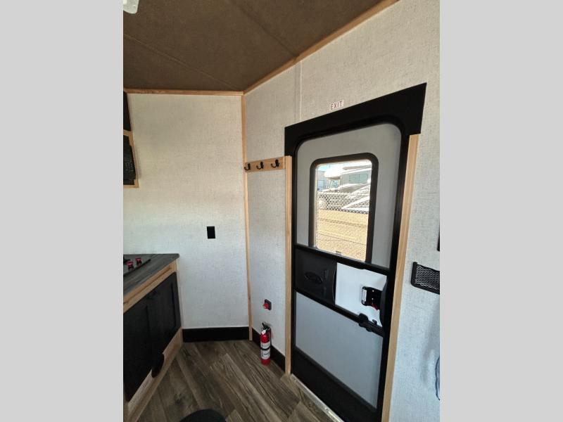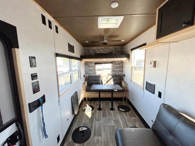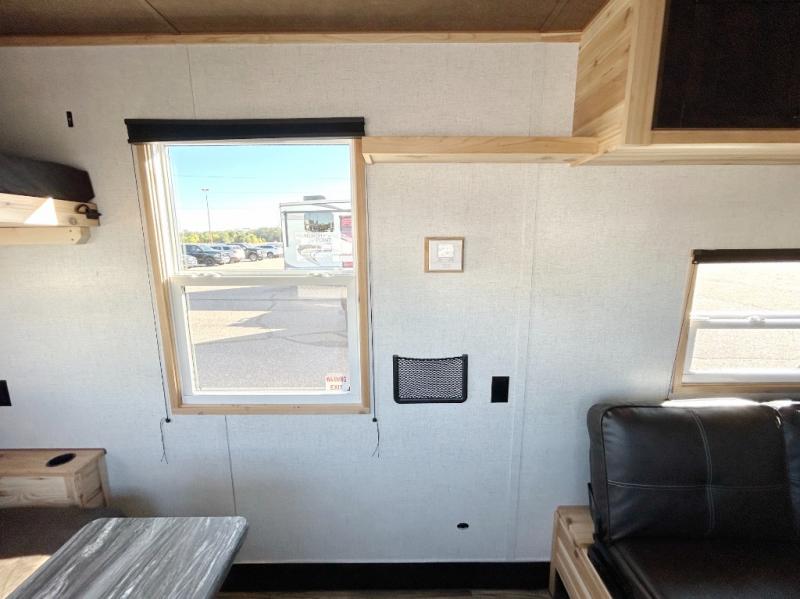 This single axle ice house features six ice holes and lots of comfort for unforgettable fishing trips. The rear jack knife sofa includes a table in front for dining space plus a flip bunk for compact sleeping space. A second jack knife sofa is towards the front, and you'll find an overhead cabinet here for your valuables. A two burner cooktop will let you make eggs and bacon for breakfast before getting some fishing done.