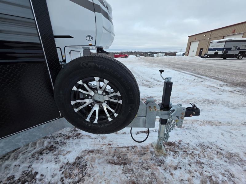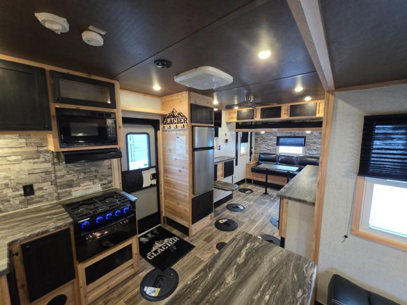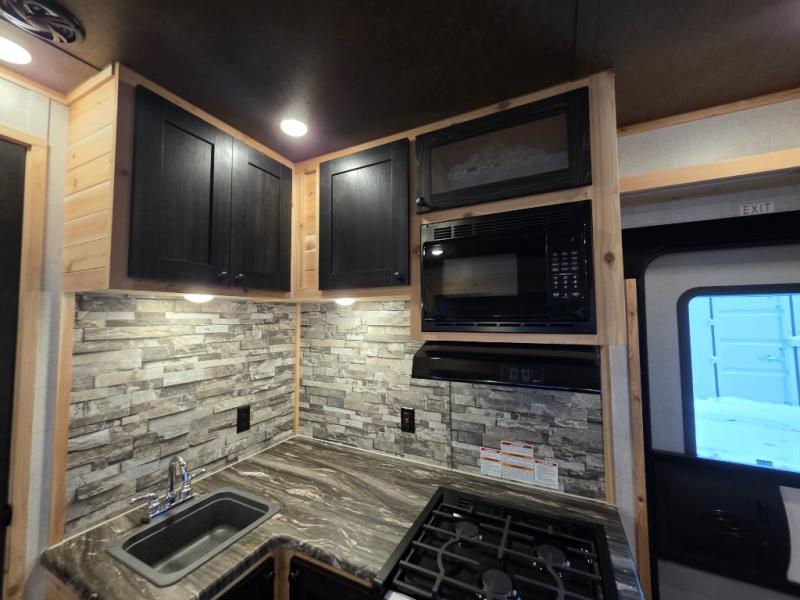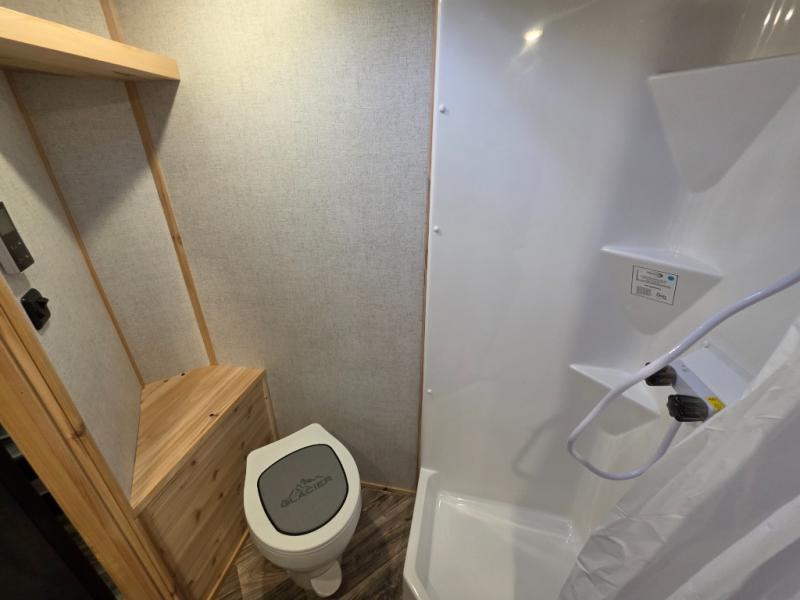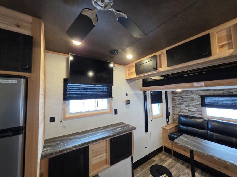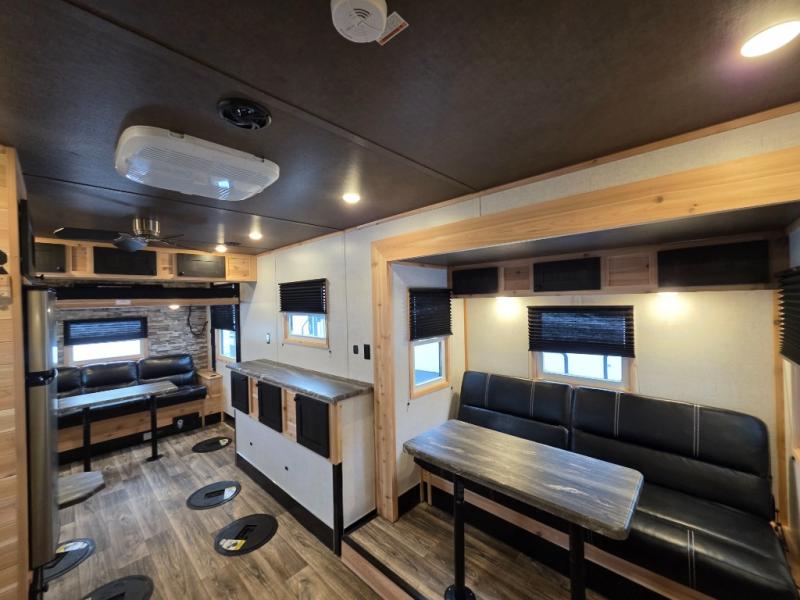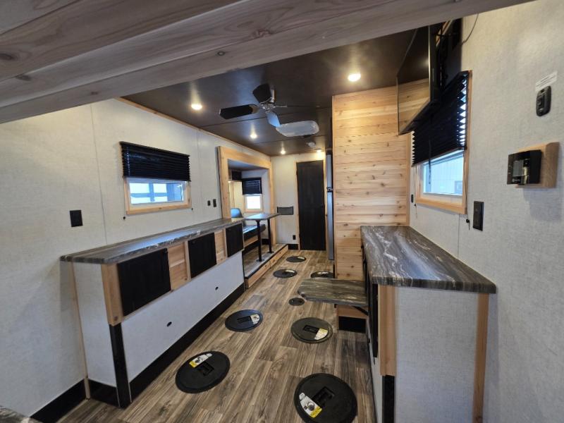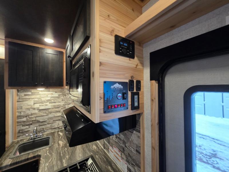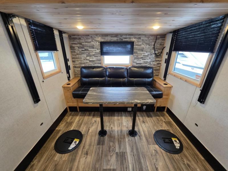 After fishing from one of the ice holes, you can make dinner on the three-burner range with an oven, grab your drinks from the 4.5-cu. ft. 12V refrigerator and dine at sofa with a table in the rear. Everyone can take turns getting cleaned up in the front full bathroom before retiring to the sofas and flip bunk. This model also includes overhead cabinets for storage, a microwave oven above the range, a 30k BTU forced air furnace, and many more stand-out features.