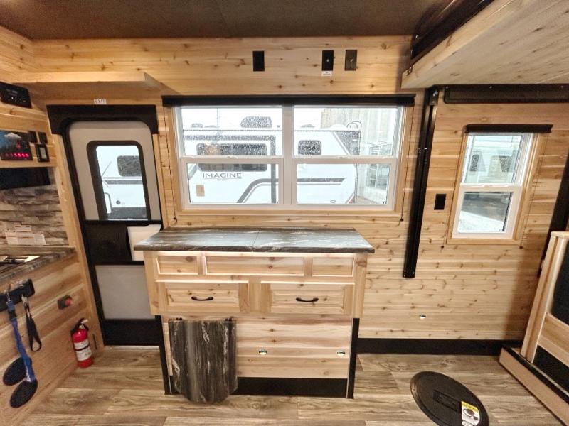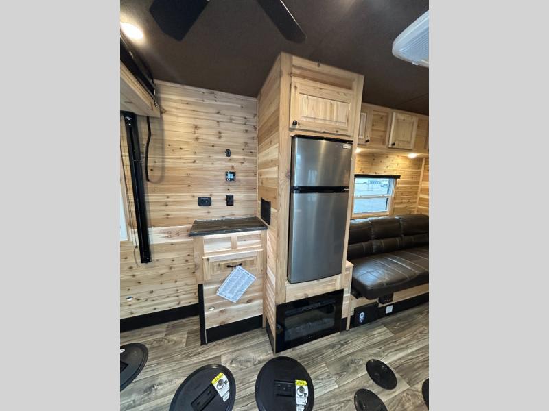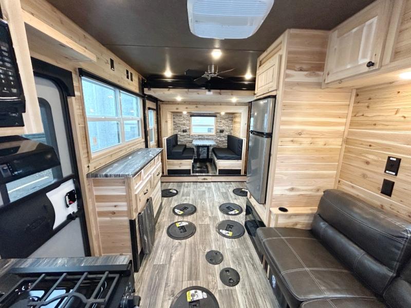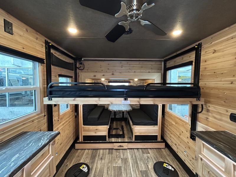 Six ice holes with lights, two bunk beds, and furniture to relax and dine on are calling you to the perfect spot for the weekend. You will appreciate the forced-air furnace during the cooler months and the non-ducted A/C when it gets a little too hot inside. The cook can make meals on the three-burner range with an oven, store leftovers in the 4.5-cu. ft. 12V refrigerator, and there is dining space on the rear sofa with a table. The front full bathroom will allow you to stay inside longer unless you want to relax under the power awning outside, and you will find storage throughout in the overhead cabinets, on the countertops, and inside the bathroom.
