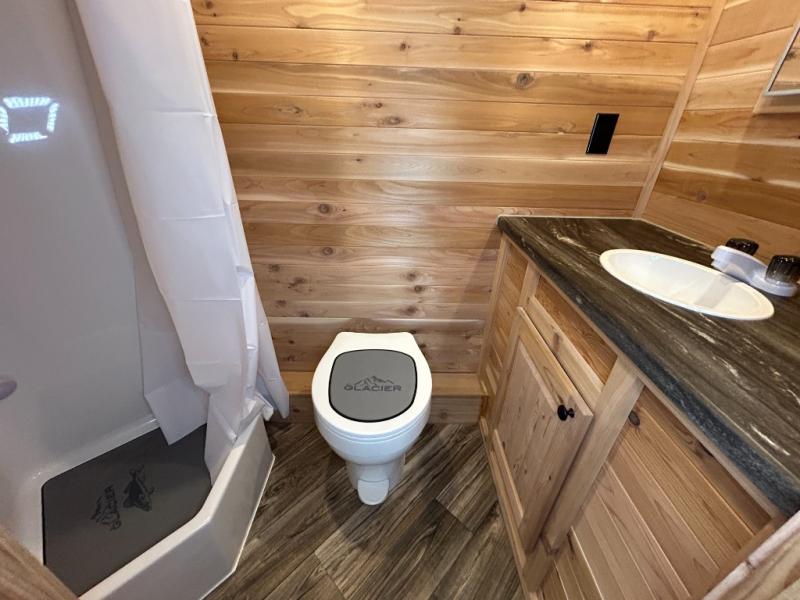 Each ice house by Glacier Ice House is built tough so you can enjoy enjoy fishing on the lake for years to come. The stronger, more resilient axle design is capable of handling heavier loads, and the trussed roofing system is one of the strongest on the market. There is interior and exterior LED lighting to keep your spaces well lit, plus high quality cedar cabinetry. Each ice house also features RV windows, a hand crank system, and a radiant barrier to withstand the cold temperatures!