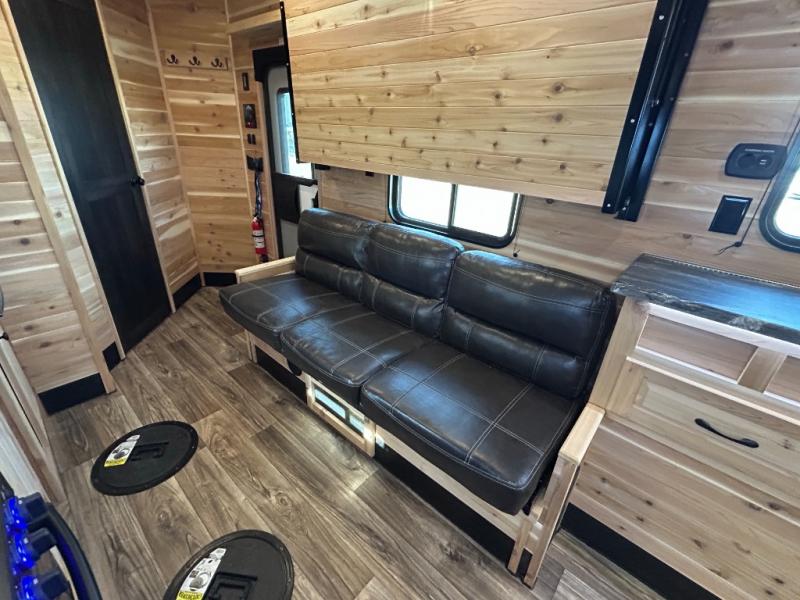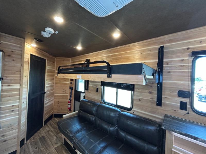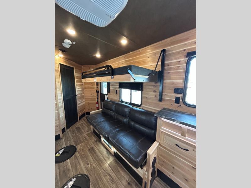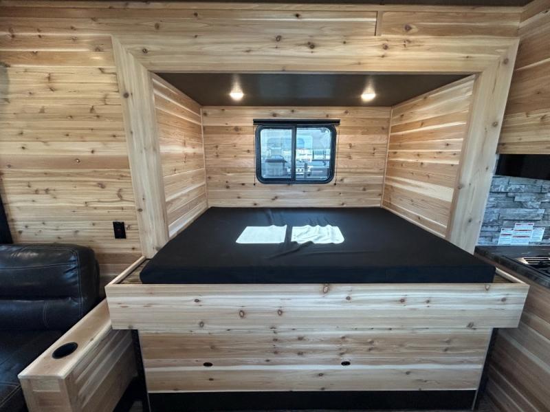 You'll love spending time on the lake in this spacious ice house with nine ice holes! Once you arrive, you can make a quick lunch on the three burner range, and dine on the jack knife sofa with a table. There is a second sofa that includes a flip bunk and a rear flip bunk for more sleeping space. Speaking of sleeping space, the 45" x 72" mattress slide out is sure to bring a great night's rest. The full bath will let you freshen up each day, and the overhead cabinets will keep your valuables tucked away. This unit also includes an entertainment center with a hidden TV under the countertop for when the fish aren't biting!
