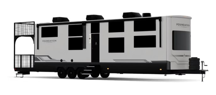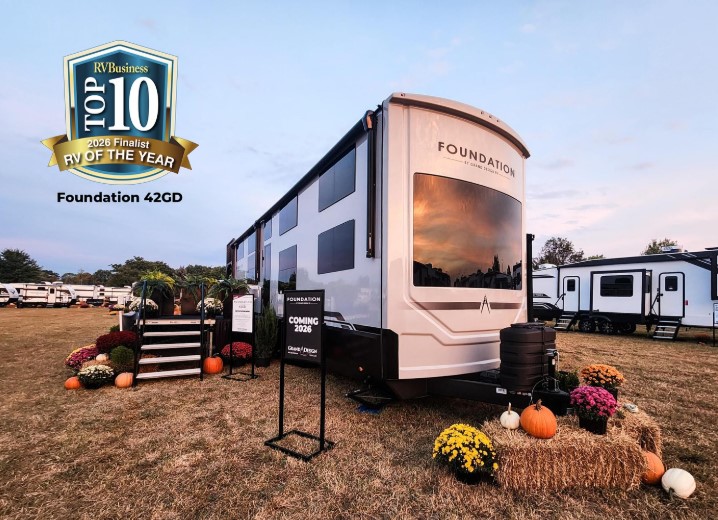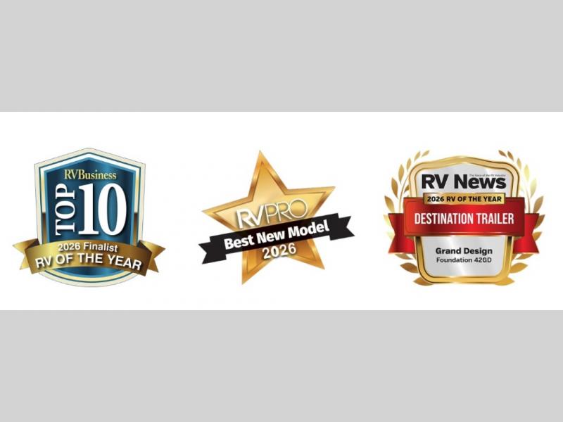 The all new Foundation Destination Trailer was announced as RV of the Year Finalist by RV Business, Best New Model by RV Pro, and RV News RV of the Year for destination trailers. The Foundation 42GD marks the entrance of Grand Design into the destination trailer space. The first-of-its-kind floorplan redefines outdoor and residential RV living and is the first-ever destination model to feature dual exterior decks, offering an unmatched blend of luxury and functionality. The rear includes a spacious 60" x 72" patio and an elevated observation deck, perfect for panoramic views and immersive outdoor experiences. With its innovative layout and high-end residential features, the Foundation 42GD stands apart as a true game-changer in the RV industry. Set to launch early 2026.