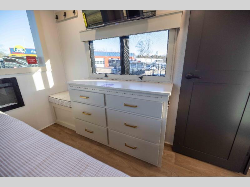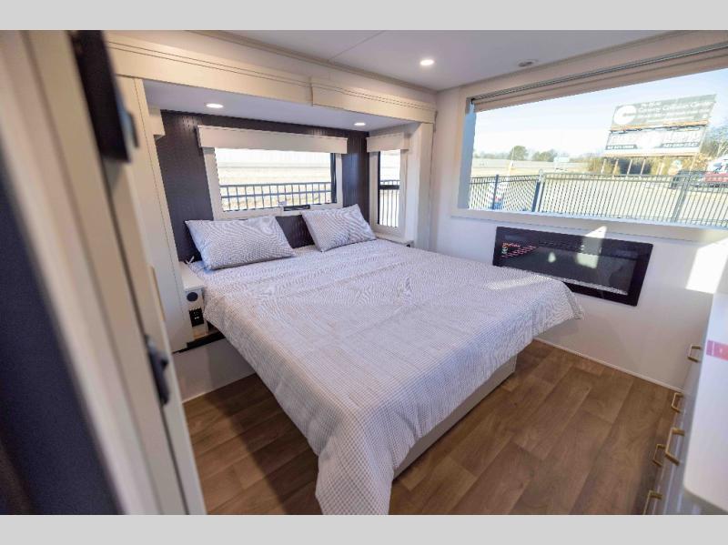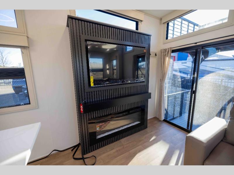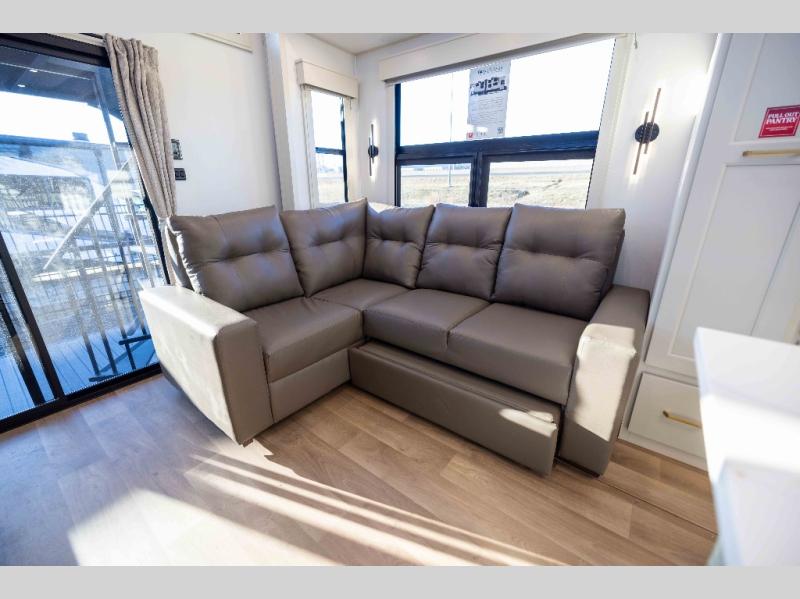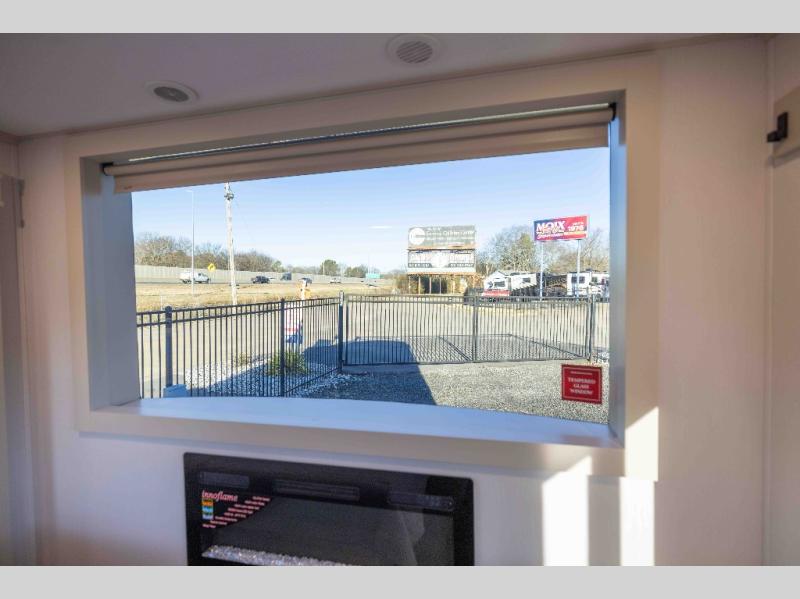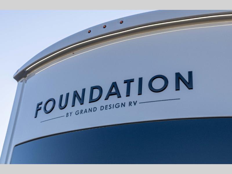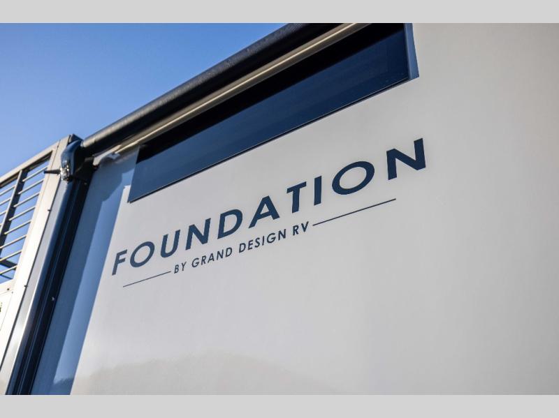 With any Foundation destination trailer by Grand Design, you can choose to stay longer surrounded by residential inspired features! The durable construction includes aluminum framing with a temperature-controlled fiberglass laminated wall, composite exterior decking with waterproof woven vinyl flooring, quad seal protection, and an industry-leading maintenance-less one-piece roof with composite roof decking panels. There is also an exterior convenience center, brass plumbing fittings, an 8' 5" wide body frame, and sleek bonded square glass windows. The interior is packed with residential features, including GE appliances, motorized shades in the living room and kitchen, solid surface countertops in the kitchen and bath, and the list goes on!