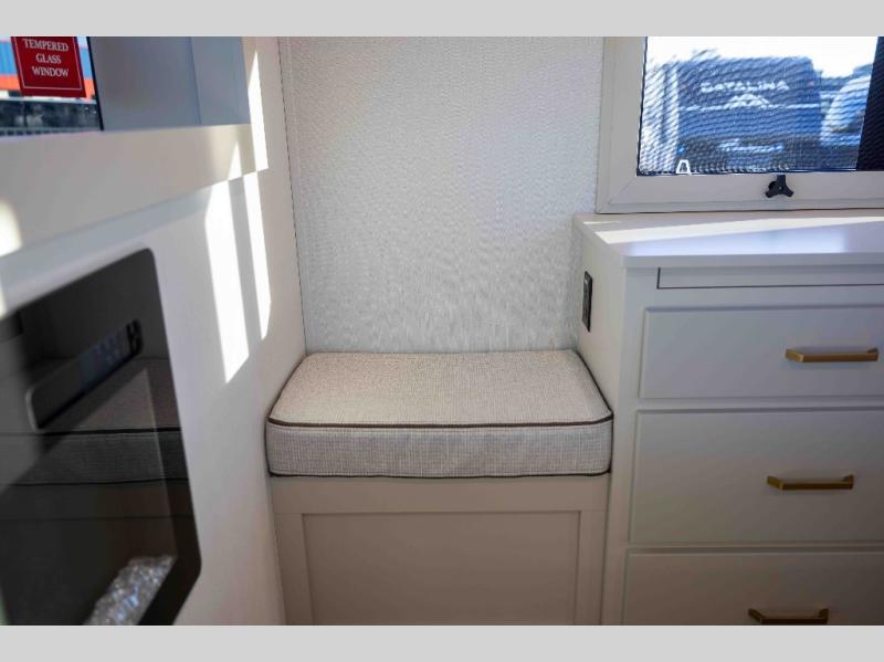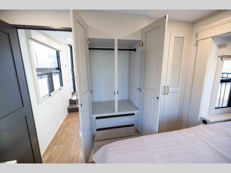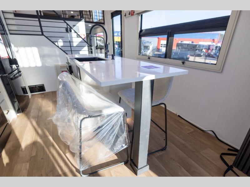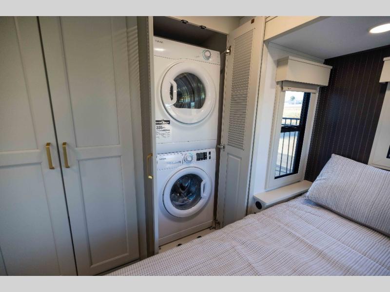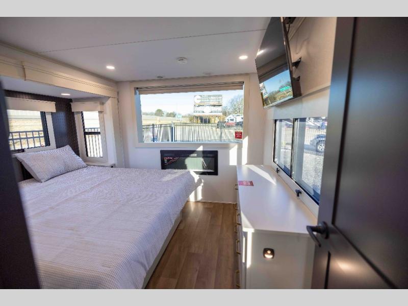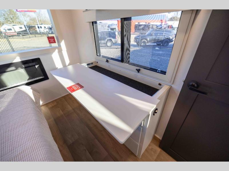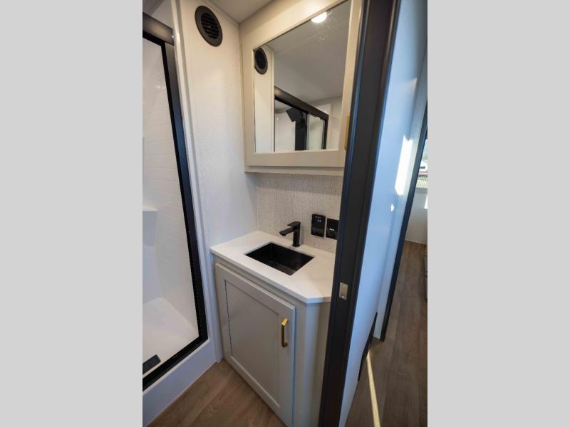 With any Foundation destination trailer by Grand Design, you can choose to stay longer surrounded by residential inspired features! The durable construction includes aluminum framing with a temperature-controlled fiberglass laminated wall, composite exterior decking with waterproof woven vinyl flooring, quad seal protection, and an industry-leading maintenance-less one-piece roof with composite roof decking panels. There is also an exterior convenience center, brass plumbing fittings, an 8' 5" wide body frame, and sleek bonded square glass windows. The interior is packed with residential features, including GE appliances, motorized shades in the living room and kitchen, solid surface countertops in the kitchen and bath, and the list goes on!