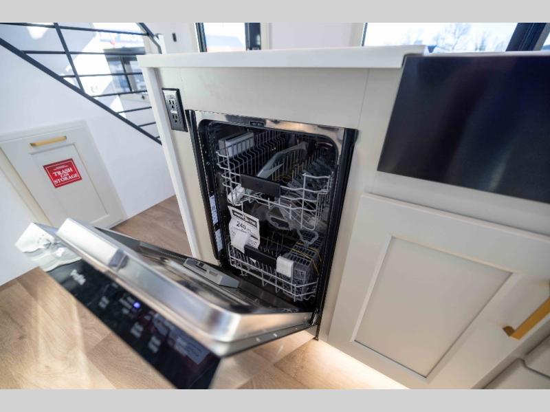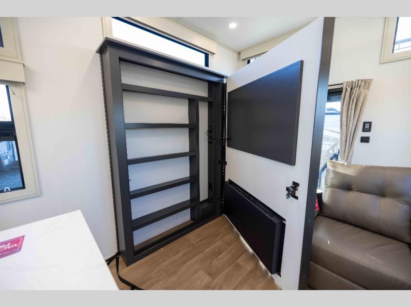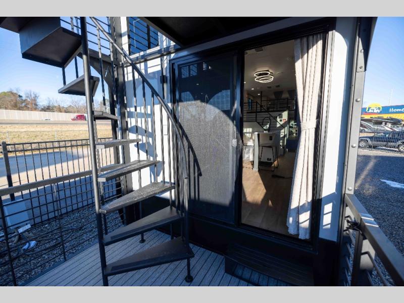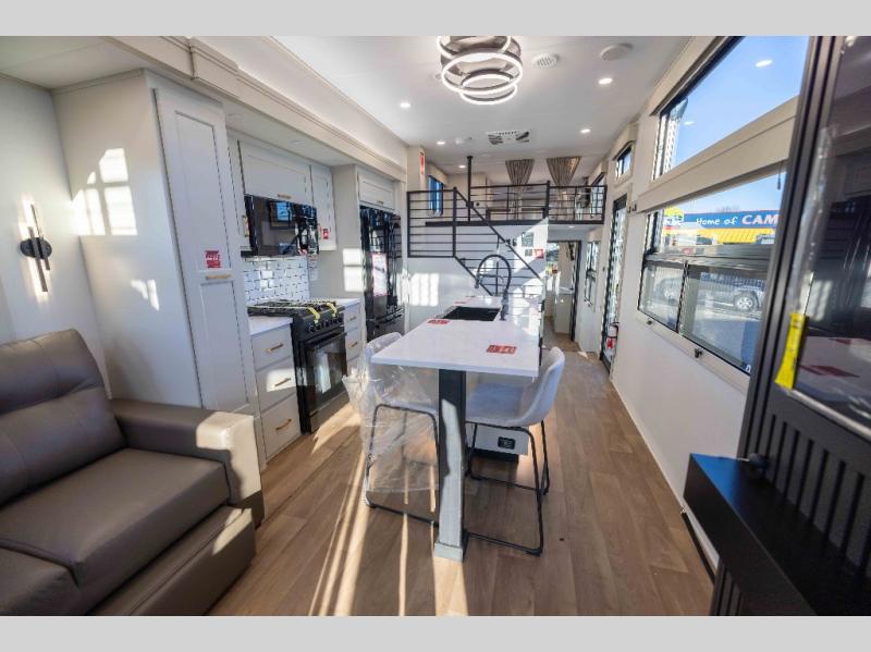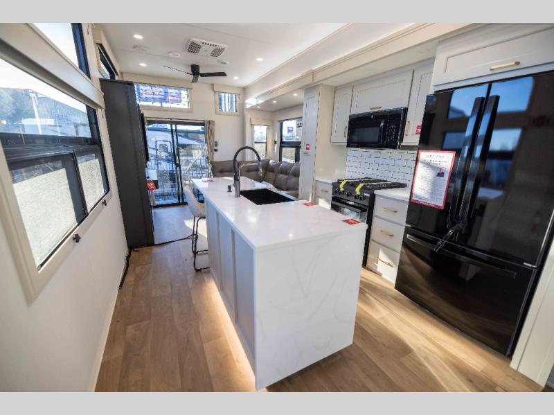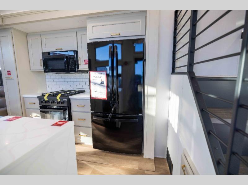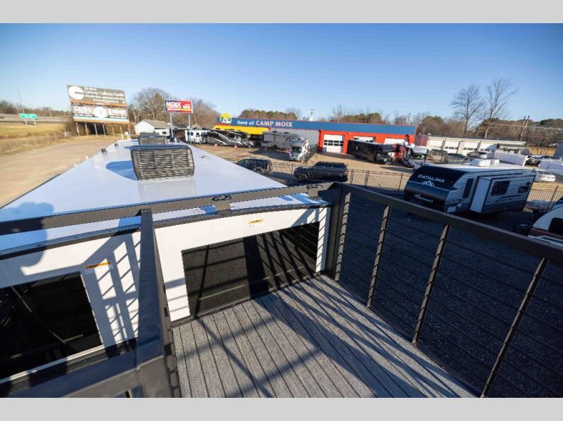 You'll fall in love with this spacious destination trailer that can sleep six each night! With dual entry doors, you can enter in through the rear deck that includes a lower level for gathering, and an observation deck to take in the stars! The other entry door leads into the combined kitchen and living room that includes a spacious kitchen island with a dishwasher, a pull-out pantry, an 18.6 cu. ft. refrigerator and an L-shaped sofa with a trundle bed. There is also an entertainment wall with smart storage and sliding doors that go out to the rear deck. A set of stairs leads to the loft with a queen-size sleeping pad, ample storage space, plus a table with a foot nook so you can put the table away when not in use. Back downstairs, a full bath will let you freshen up each day and a front private bedroom with a king bed slide is sure to bring comfort. There is also storage space for your things, a telescoping TV, plus washer and dryer prep if you plan to add these appliances!