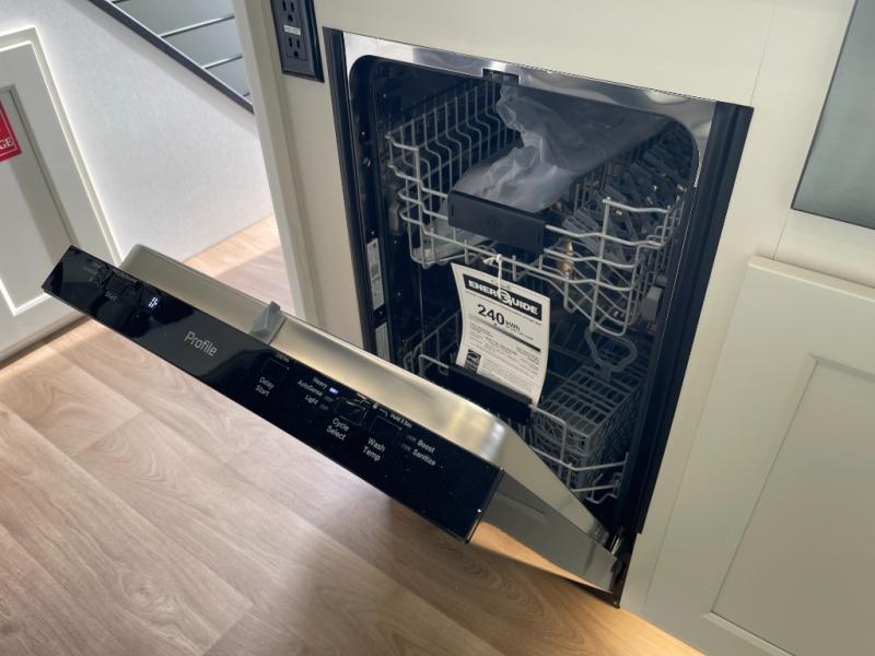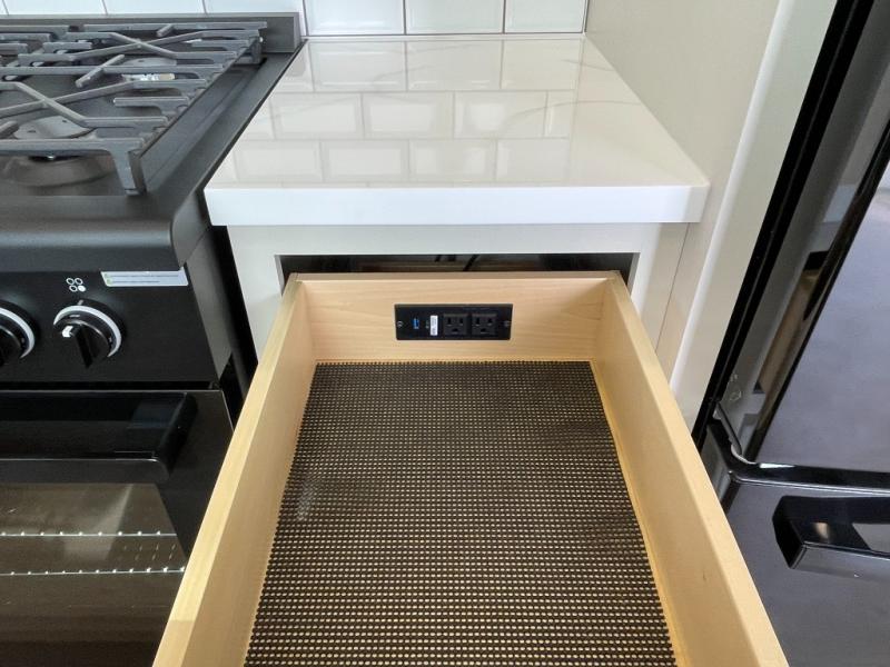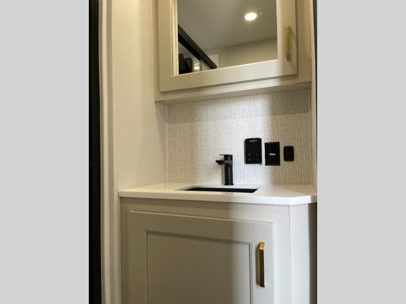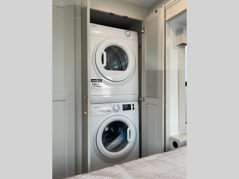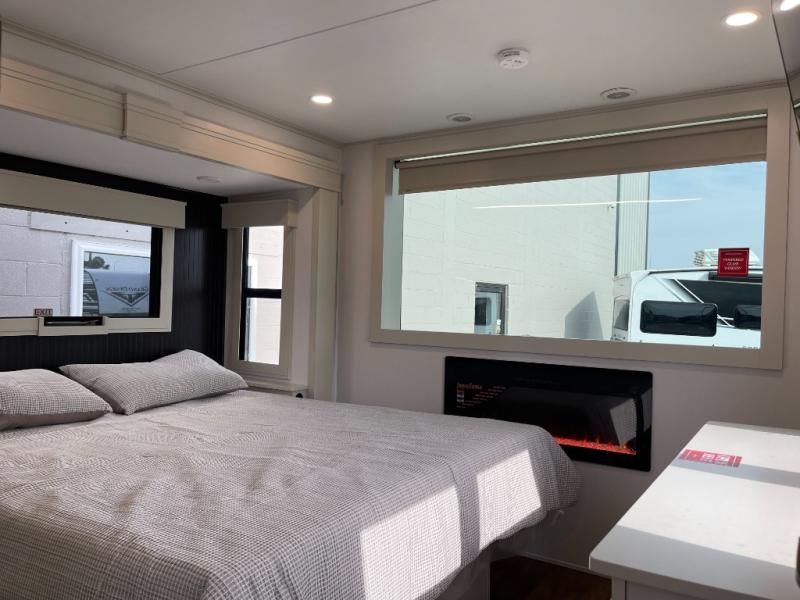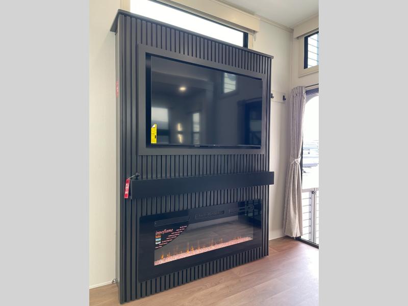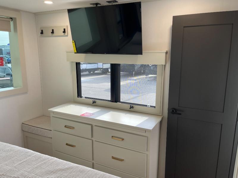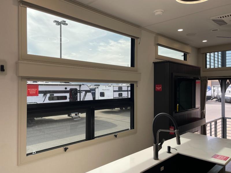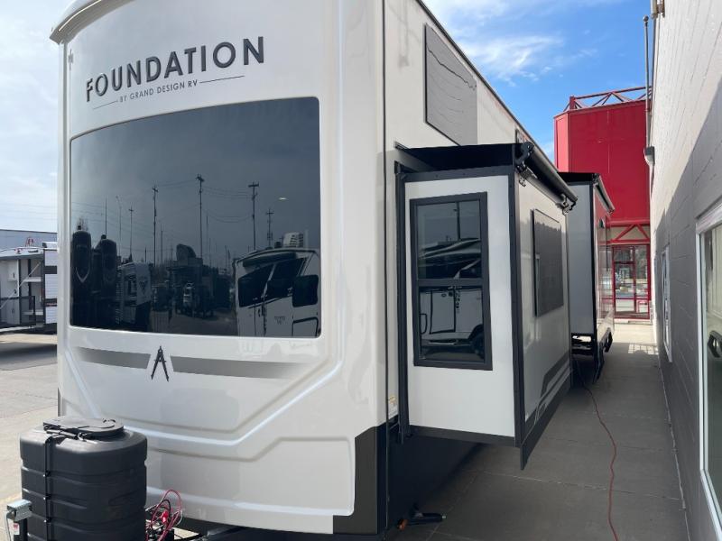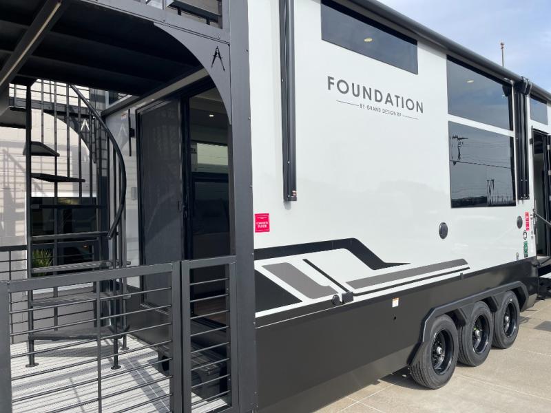 With any Foundation destination trailer by Grand Design, you can choose to stay longer surrounded by residential inspired features! The durable construction includes aluminum framing with a temperature-controlled fiberglass laminated wall, composite exterior decking with waterproof woven vinyl flooring, quad seal protection, and an industry-leading maintenance-less one-piece roof with composite roof decking panels. There is also an exterior convenience center, brass plumbing fittings, an 8' 5" wide body frame, and sleek bonded square glass windows. The interior is packed with residential features, including GE appliances, motorized shades in the living room and kitchen, solid surface countertops in the kitchen and bath, and the list goes on!