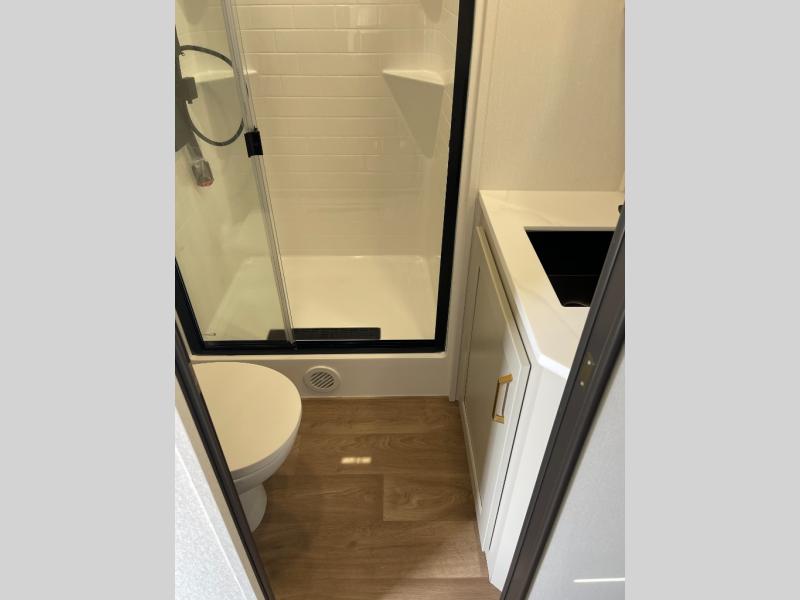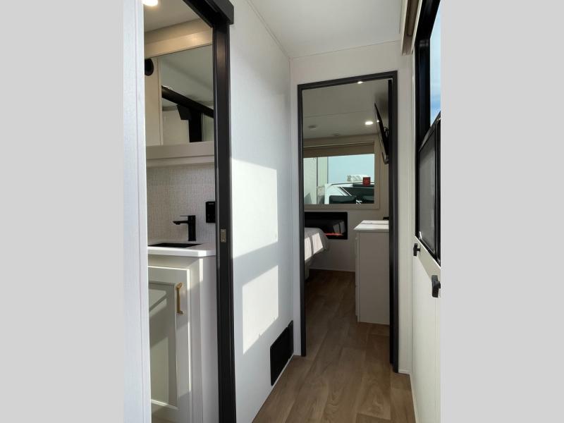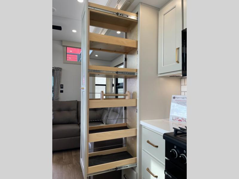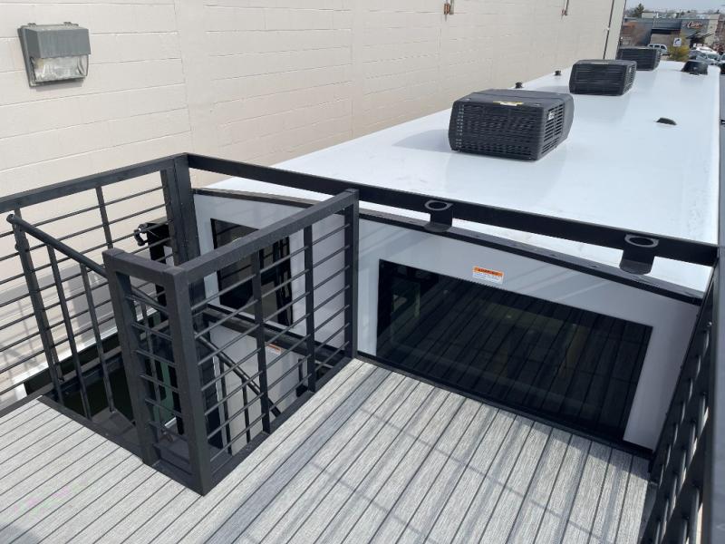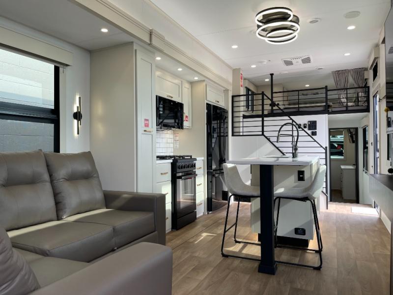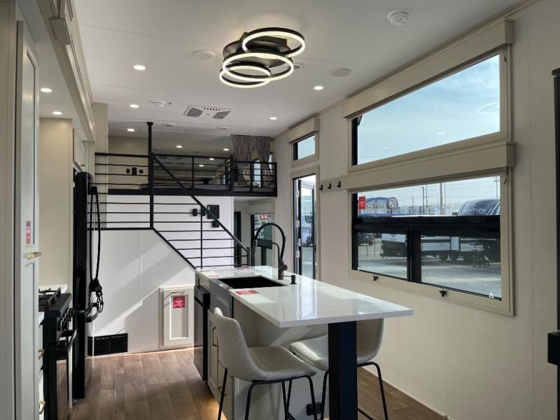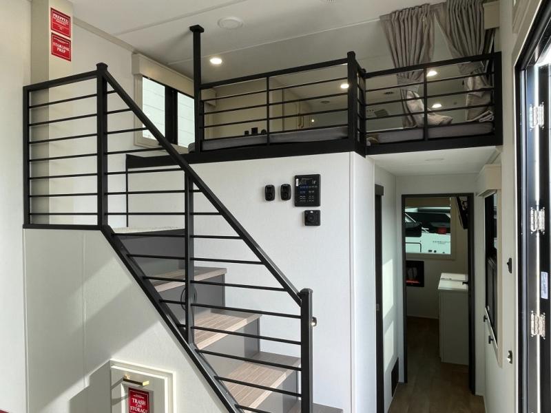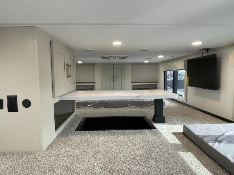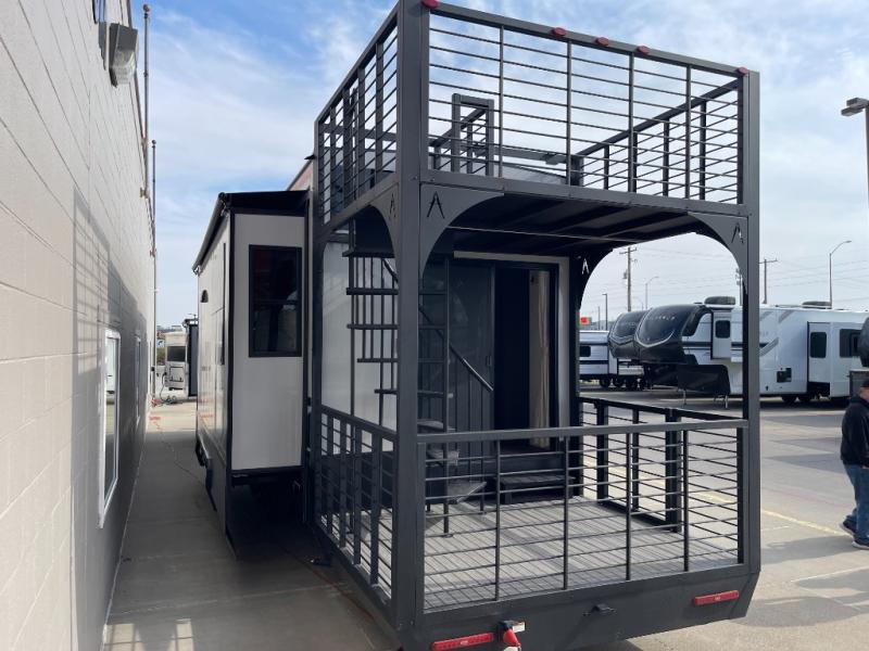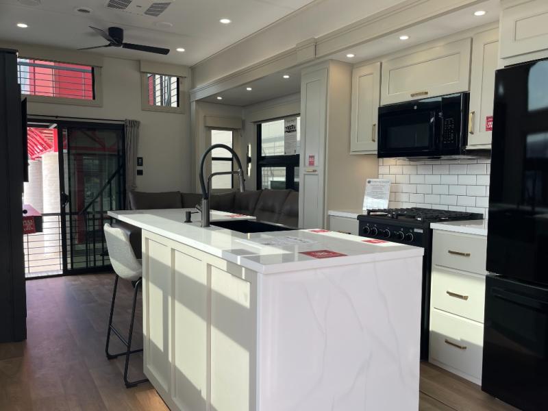 You'll fall in love with this spacious destination trailer that can sleep six each night! With dual entry doors, you can enter in through the rear deck that includes a lower level for gathering, and an observation deck to take in the stars! The other entry door leads into the combined kitchen and living room that includes a spacious kitchen island with a dishwasher, a pull-out pantry, an 18.6 cu. ft. refrigerator and an L-shaped sofa with a trundle bed. There is also an entertainment wall with smart storage and sliding doors that go out to the rear deck. A set of stairs leads to the loft with a queen-size sleeping pad, ample storage space, plus a table with a foot nook so you can put the table away when not in use. Back downstairs, a full bath will let you freshen up each day and a front private bedroom with a king bed slide is sure to bring comfort. There is also storage space for your things, a telescoping TV, plus washer and dryer prep if you plan to add these appliances!