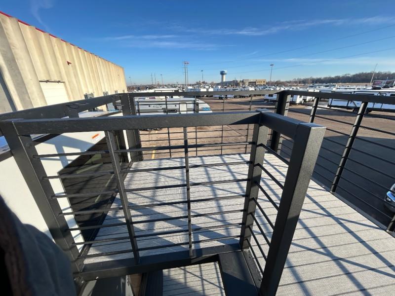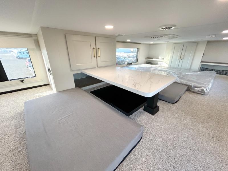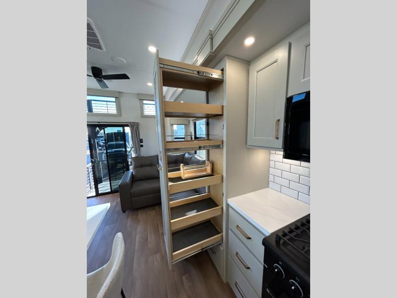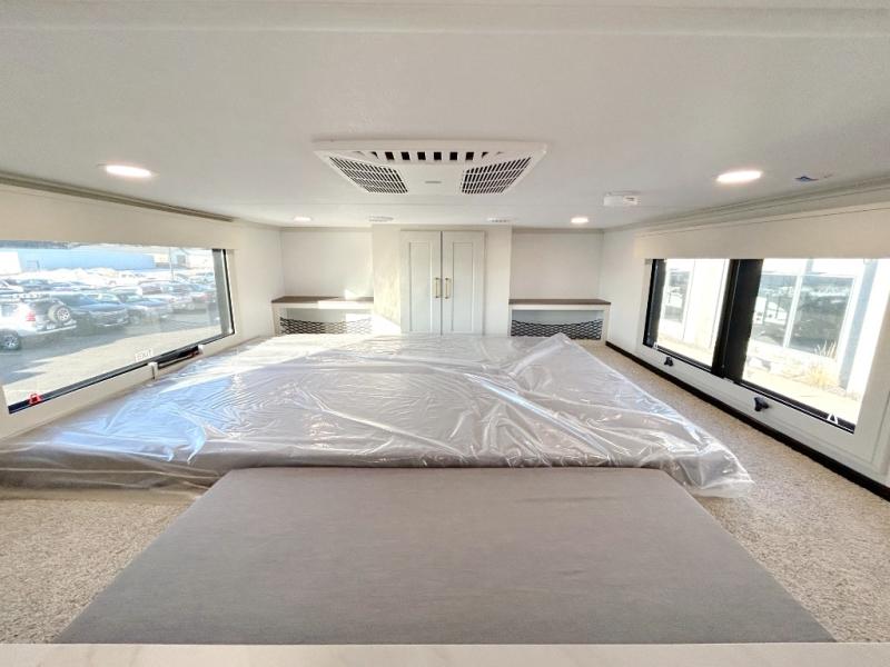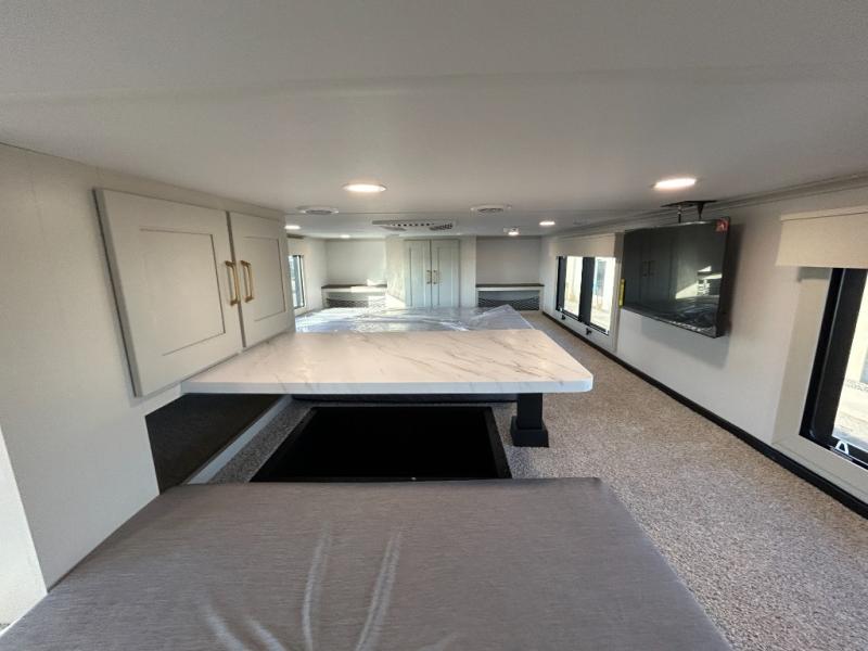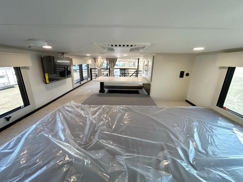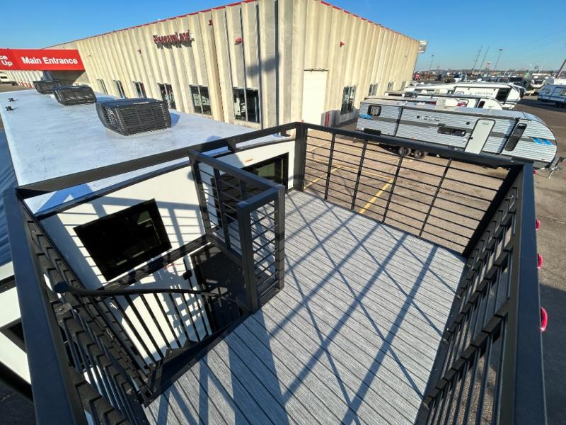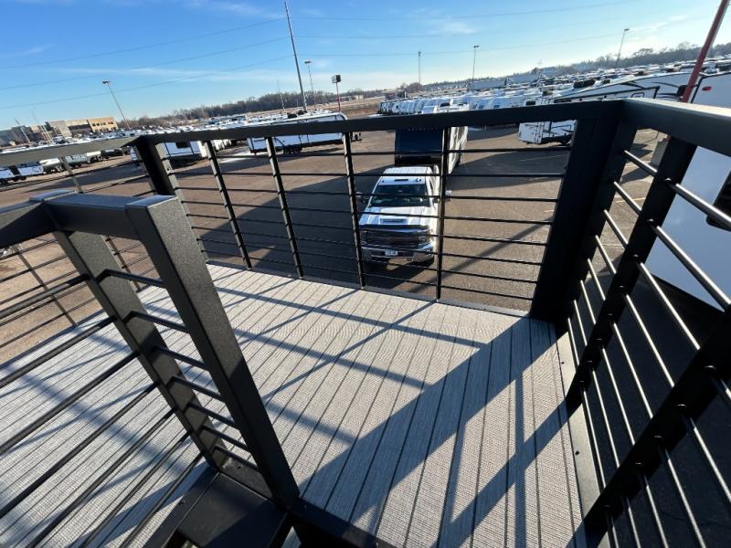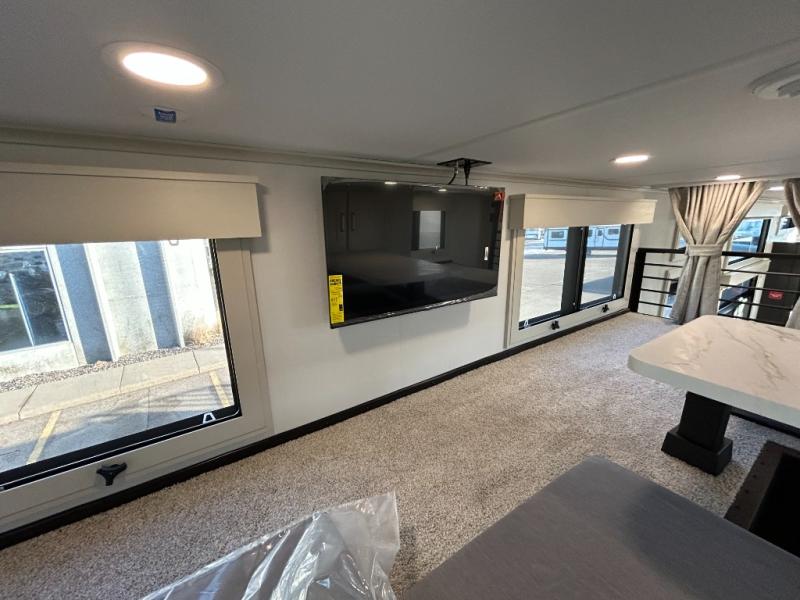 You'll fall in love with this spacious destination trailer that can sleep six each night! With dual entry doors, you can enter in through the rear deck that includes a lower level for gathering, and an observation deck to take in the stars! The other entry door leads into the combined kitchen and living room that includes a spacious kitchen island with a dishwasher, a pull-out pantry, an 18.6 cu. ft. refrigerator and an L-shaped sofa with a trundle bed. There is also an entertainment wall with smart storage and sliding doors that go out to the rear deck. A set of stairs leads to the loft with a queen-size sleeping pad, ample storage space, plus a table with a foot nook so you can put the table away when not in use. Back downstairs, a full bath will let you freshen up each day and a front private bedroom with a king bed slide is sure to bring comfort. There is also storage space for your things, a telescoping TV, plus washer and dryer prep if you plan to add these appliances!
