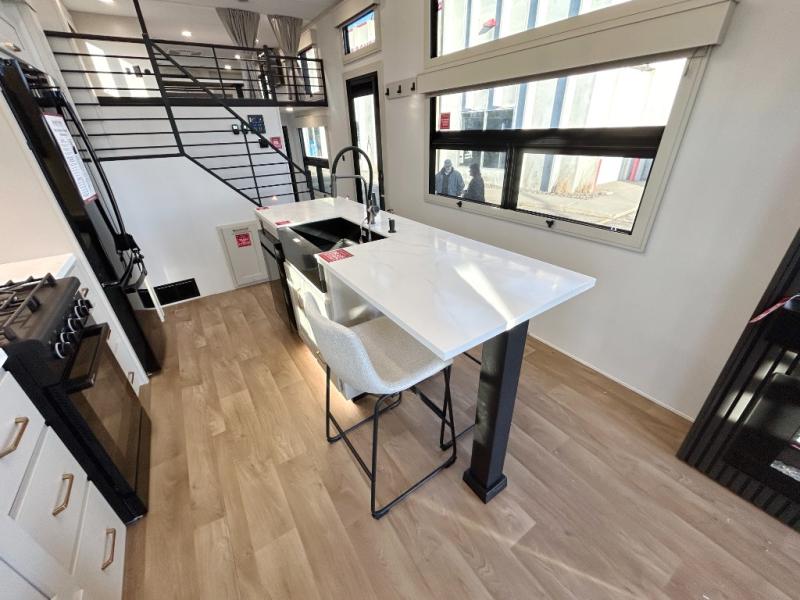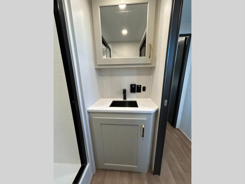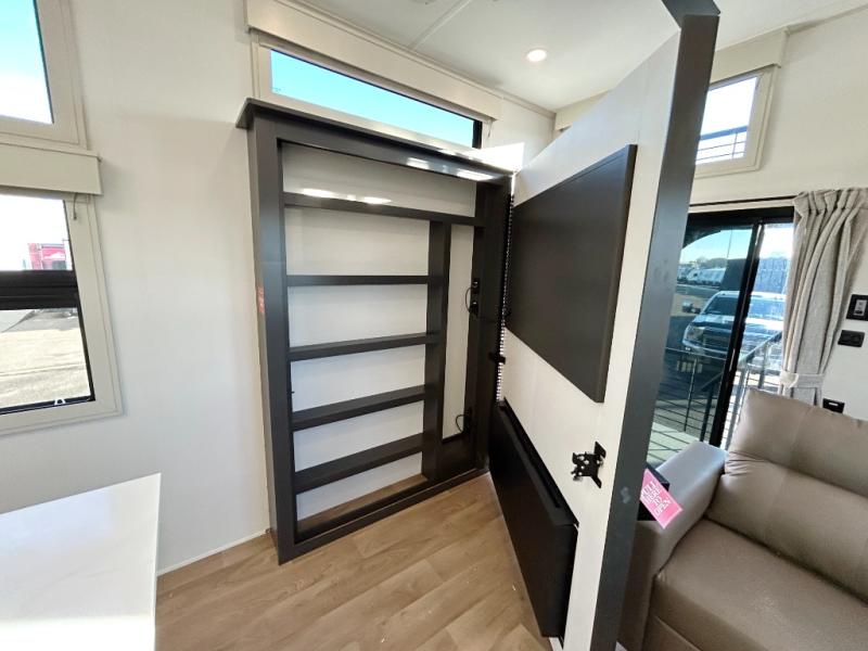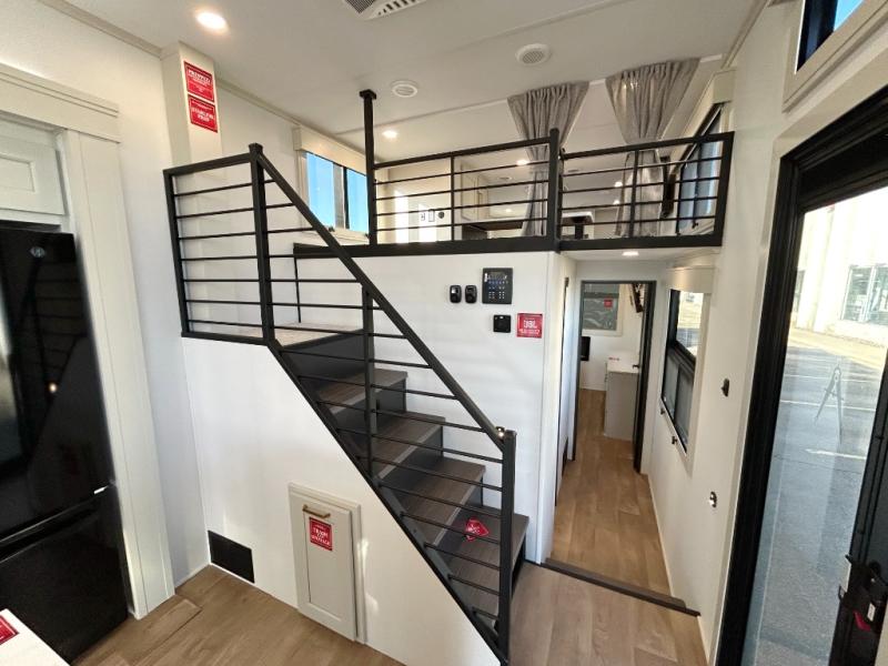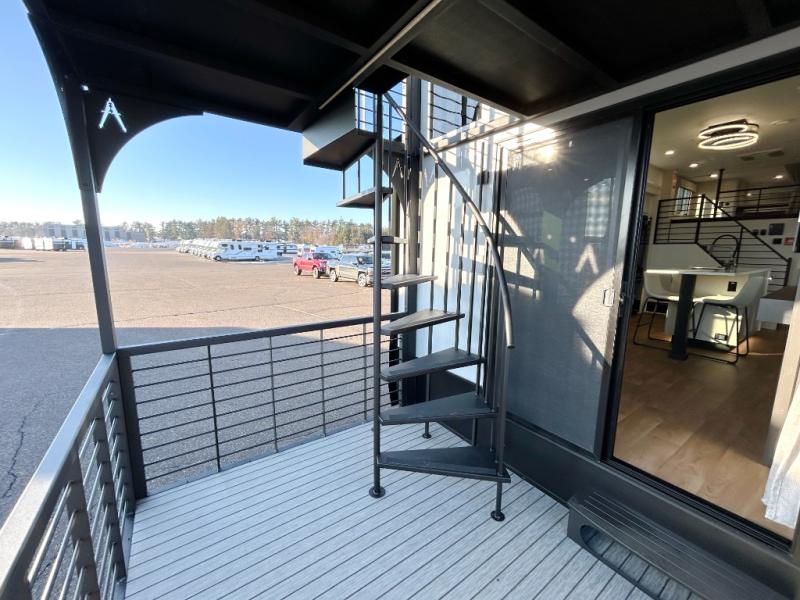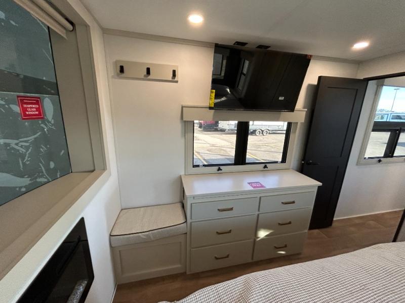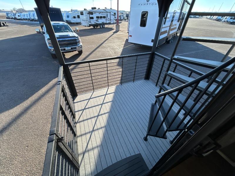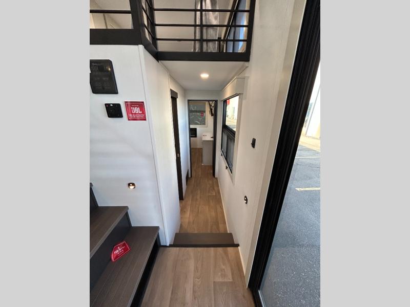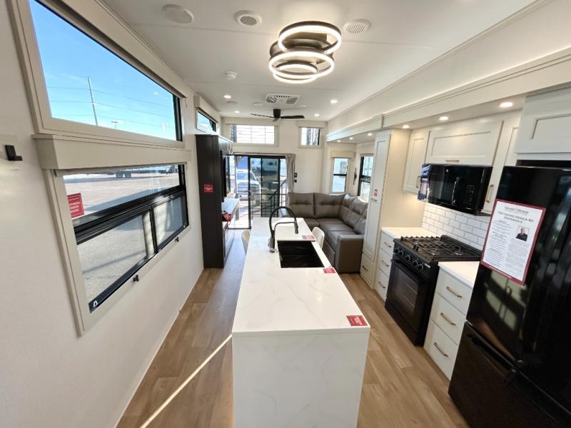You'll fall in love with this spacious destination trailer that can sleep six each night! With dual entry doors, you can enter in through the rear deck that includes a lower level for gathering, and an observation deck to take in the stars! The other entry door leads into the combined kitchen and living room that includes a spacious kitchen island with a dishwasher, a pull-out pantry, an 18.6 cu. ft. refrigerator and an L-shaped sofa with a trundle bed. There is also an entertainment wall with smart storage and sliding doors that go out to the rear deck. A set of stairs leads to the loft with a queen-size sleeping pad, ample storage space, plus a table with a foot nook so you can put the table away when not in use. Back downstairs, a full bath will let you freshen up each day and a front private bedroom with a king bed slide is sure to bring comfort. There is also storage space for your things, a telescoping TV, plus washer and dryer prep if you plan to add these appliances!
