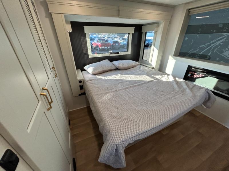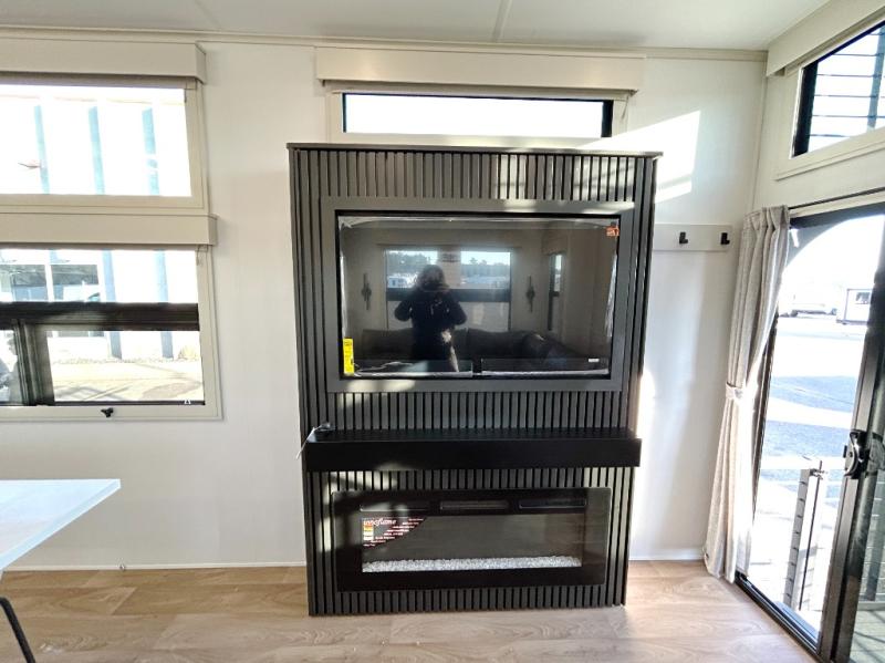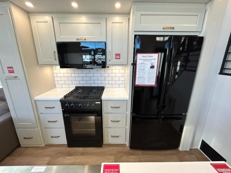 With any Foundation destination trailer by Grand Design, you can choose to stay longer surrounded by residential inspired features! The durable construction includes aluminum framing with a temperature-controlled fiberglass laminated wall, composite exterior decking with waterproof woven vinyl flooring, quad seal protection, and an industry-leading maintenance-less one-piece roof with composite roof decking panels. There is also an exterior convenience center, brass plumbing fittings, an 8' 5" wide body frame, and sleek bonded square glass windows. The interior is packed with residential features, including GE appliances, motorized shades in the living room and kitchen, solid surface countertops in the kitchen and bath, and the list goes on!