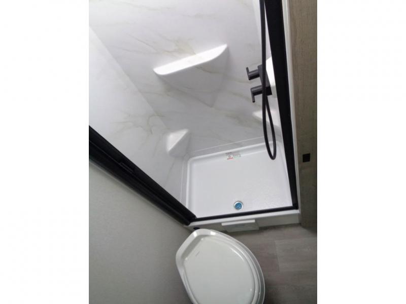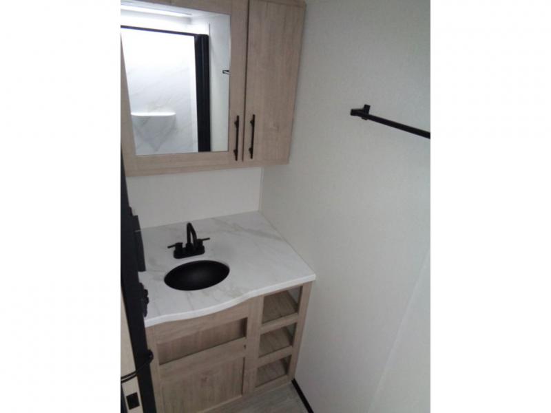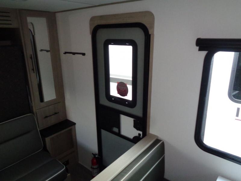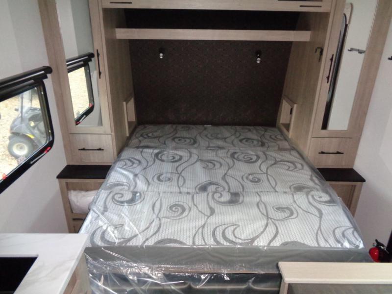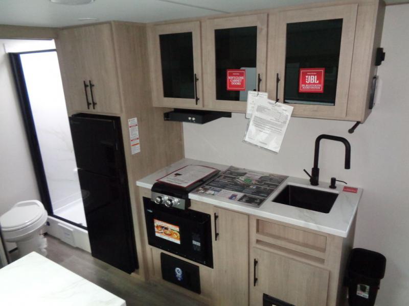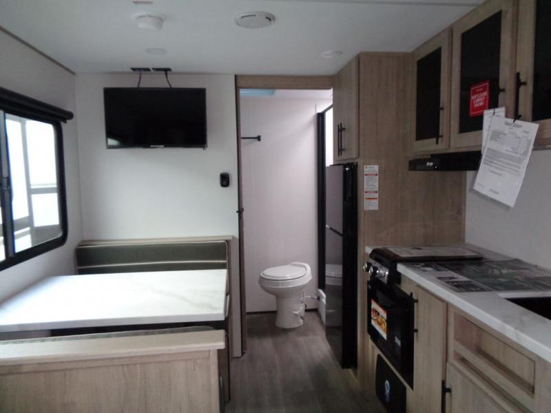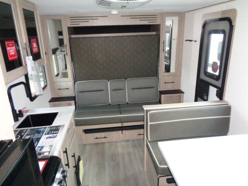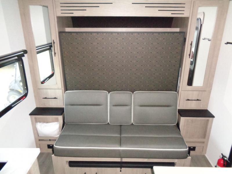 Start looking for your favorite campground to take this travel trailer to! After a fun day at the beach, you can rinse the sand out of your hair with the walk-in shower with a skylight in the full rear bathroom. Depending on what time you enter the unit will determine whether you see the Murphy bed or sofa with drawers underneath and wardrobes on either side of it. The booth dinette is not only great for enjoying meals prepared with the two burner cooktop or outside griddle, but also for transforming into an extra sleeping space!