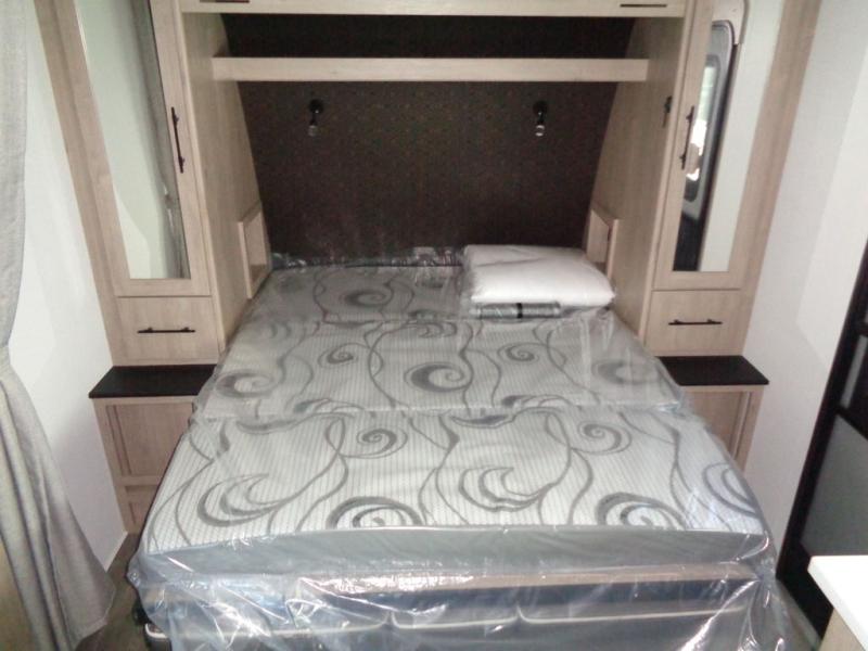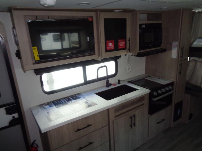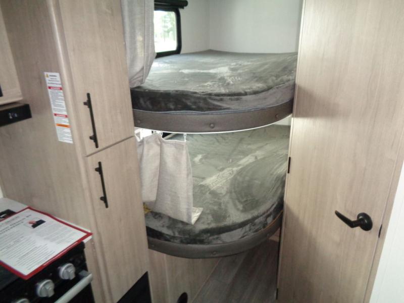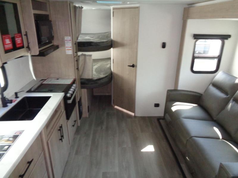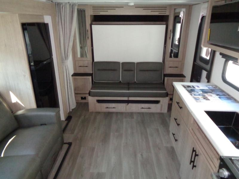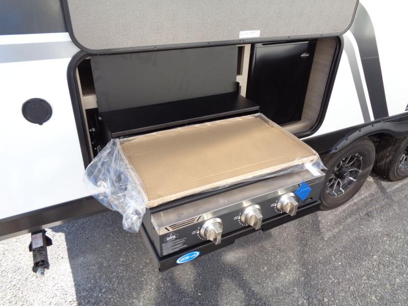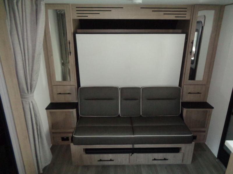 This travel trailer has everything you need for a great vacation! You will never miss home when you see all of the amenities included on this trailer. There is a full bathroom for easy morning routines, a set of 47" x 76" double over double-size bunks with privacy curtains for compact sleeping, a U-shaped dinette for meal times, and a full kitchen with all of the appliances needed for filling meals. You could even switch out the dinette for an optional theater dinette. The front Murphy bed not only provides versatility with a bed to sleep on at night, and a seating area during the day, but also a removable interior/exterior table. In addition to all of that, you'll also find an outdoor griddle and 1.6 cu. ft. refrigerator that you can use when the weather is nice. The unobstructed pass-through storage will be able to store your fishing poles and sports equipment while you travel.