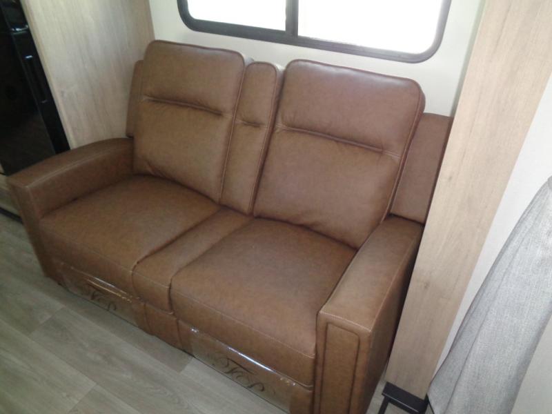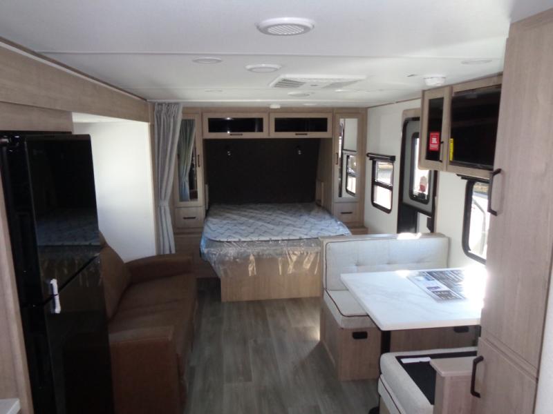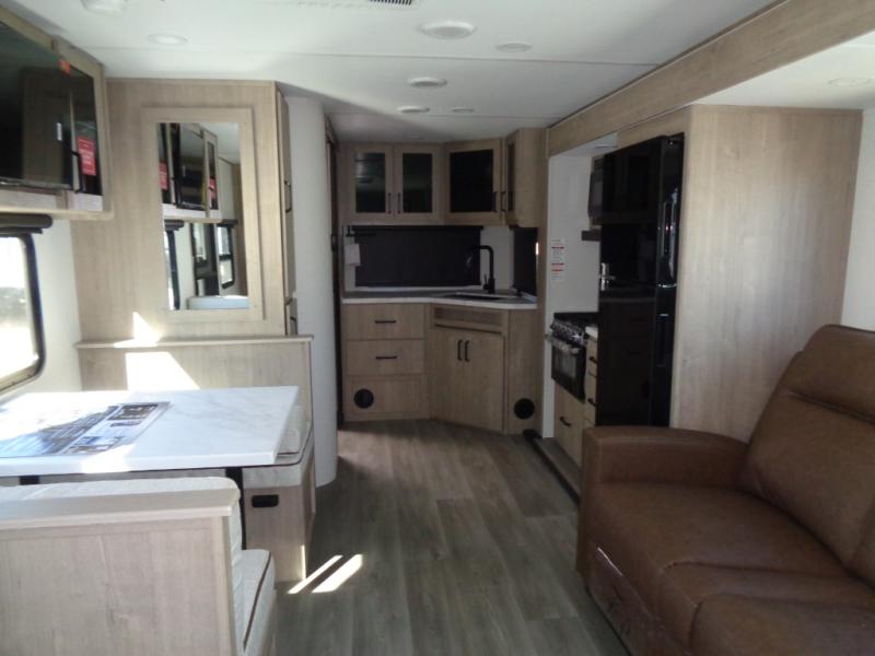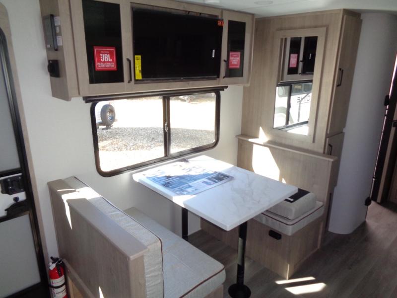 This Imagine XLS travel trailer has theater seating and a booth dinette that you can use any time you need a little break from the outdoors. If you want to come in and grab a coffee, put together a puzzle, or work on your itinerary for the week, just put up your feet and relax. You could even switch on the LED HDTV if you want a little entertainment. The front queen-size bed has a privacy curtain that you can draw to create a semi-private bedroom, and in the back of the trailer you will find the rest of your amenities, like the kitchen and the bathroom. The large slide makes it easy to enjoy spending your time indoors, but if you do want to get back outside, you can sit underneath the 18' electric awning for some shade.