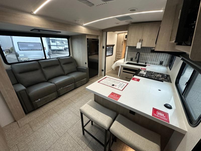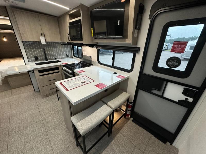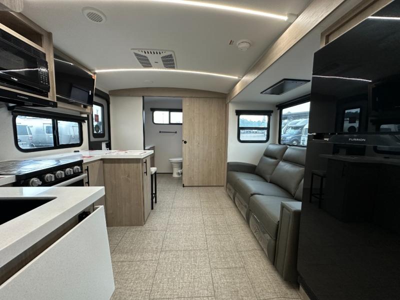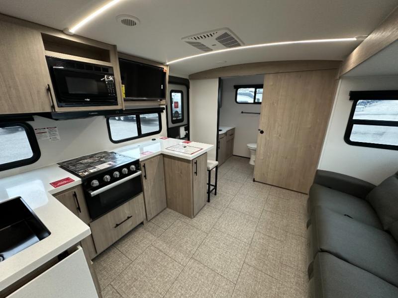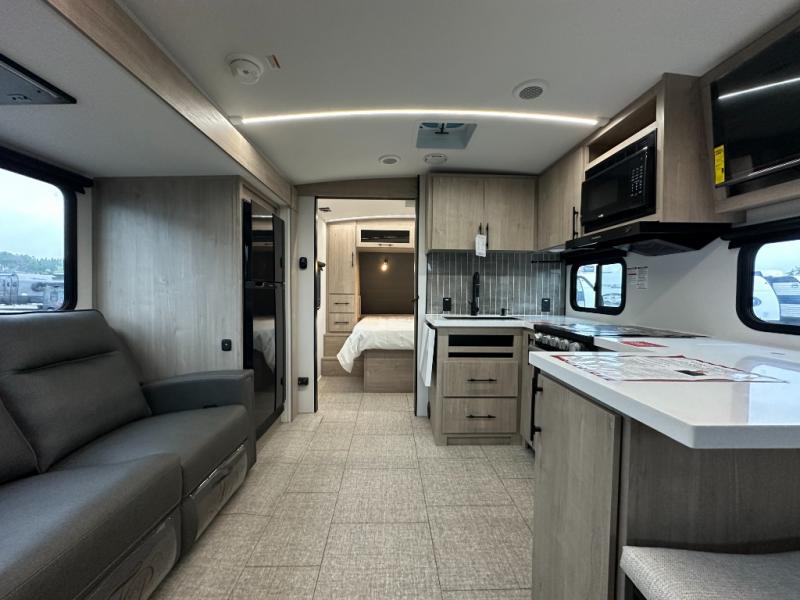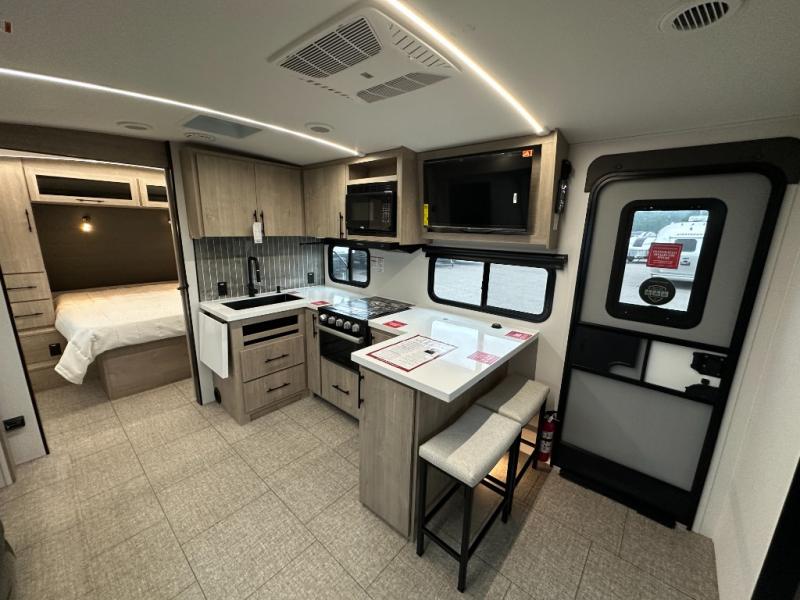 Escape to adventure with this fantastic travel trailer! The private bedroom features a plush 60" x 80" queen bed, spacious wardrobe, and TV prep for entertainment. The kitchen area is fitted with a pull-out pantry, 10 cu. refrigerator, microwave, and three-burner cooktop for gourmet meal prep. Enjoy extra counter space with the flip-up countertop extension, ideal for easy and comfortable cooking. Gather with family and friends at the theater dinette, featuring an LED HDTV for movie nights and game days after that, you can take a relaxing bath in the full rear bathroom, with ample storage. Stay organized on the go with pass-thru storage, 20” x 20” baggage door/trash can storage, and a spacious interior. Enjoy outdoor living under the shade of the 18’ awning, perfect for weekend getaways, or outdoor activities for the adventure-seekers.