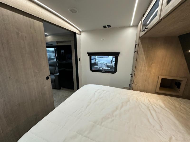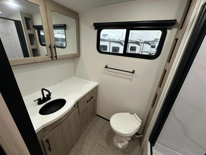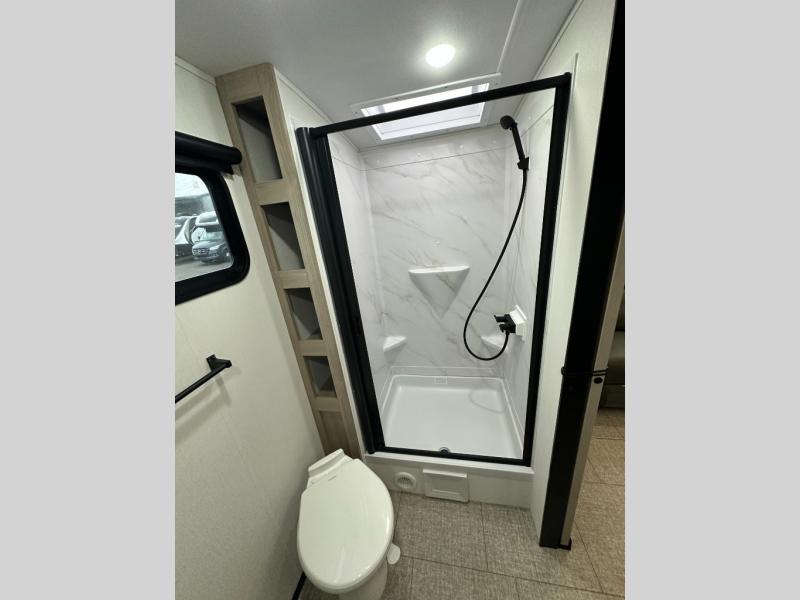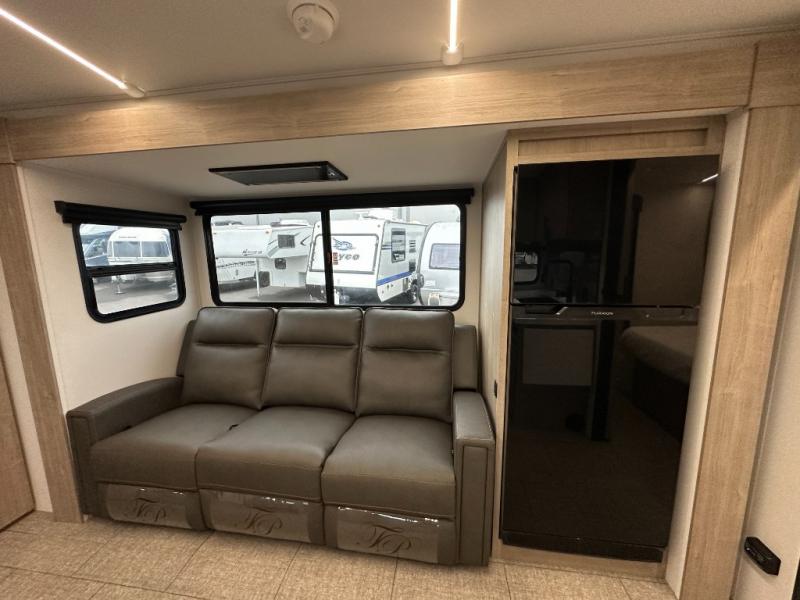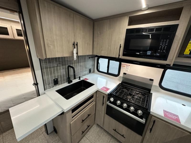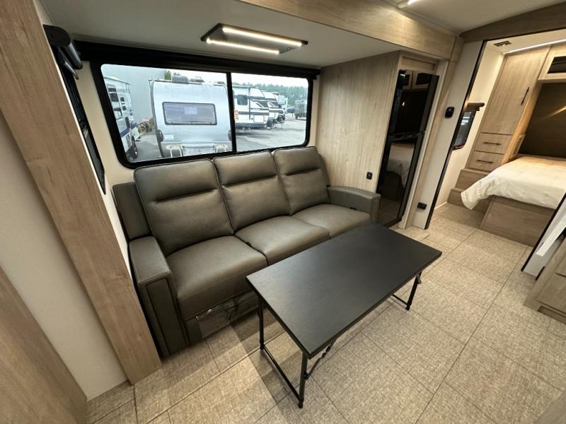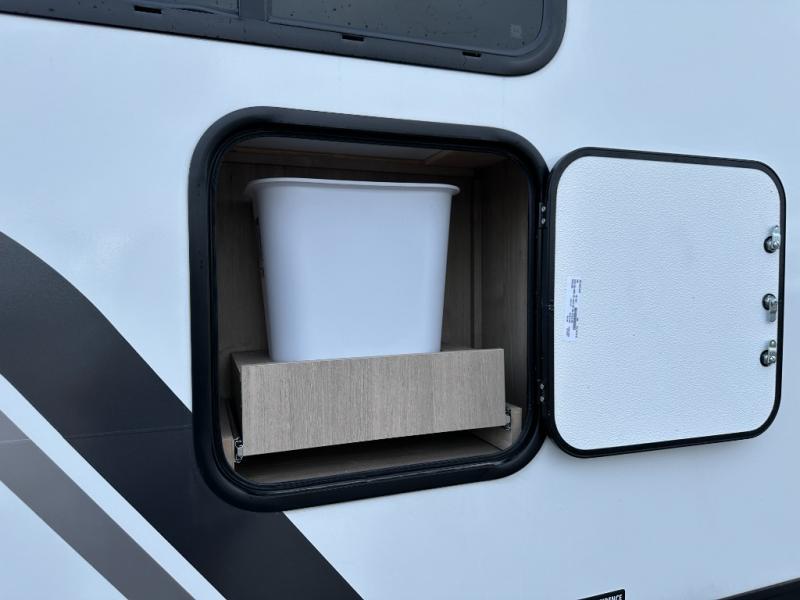 Escape to adventure with this fantastic travel trailer! The private bedroom features a plush 60" x 80" queen bed, spacious wardrobe, and TV prep for entertainment. The kitchen area is fitted with a pull-out pantry, 10 cu. refrigerator, microwave, and three-burner cooktop for gourmet meal prep. Enjoy extra counter space with the flip-up countertop extension, ideal for easy and comfortable cooking. Gather with family and friends at the theater dinette, featuring an LED HDTV for movie nights and game days after that, you can take a relaxing bath in the full rear bathroom, with ample storage. Stay organized on the go with pass-thru storage, 20” x 20” baggage door/trash can storage, and a spacious interior. Enjoy outdoor living under the shade of the 18’ awning, perfect for weekend getaways, or outdoor activities for the adventure-seekers.