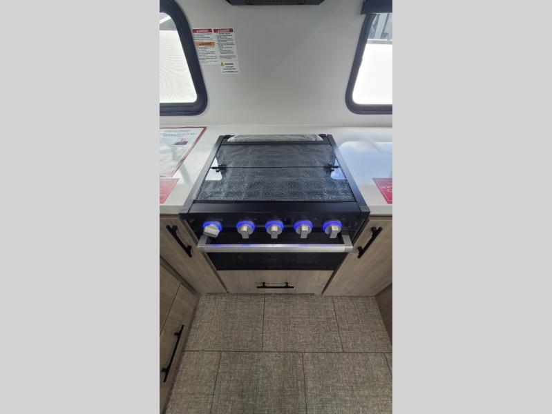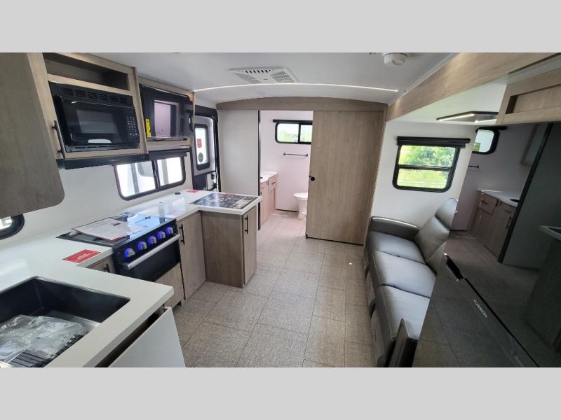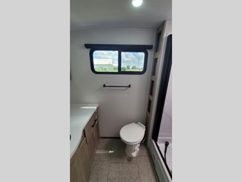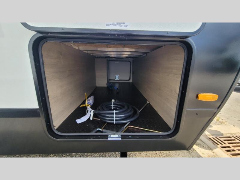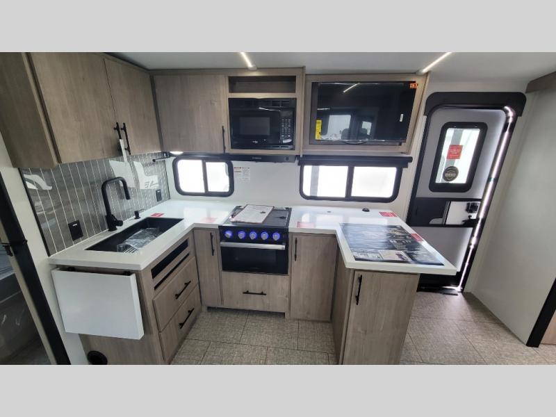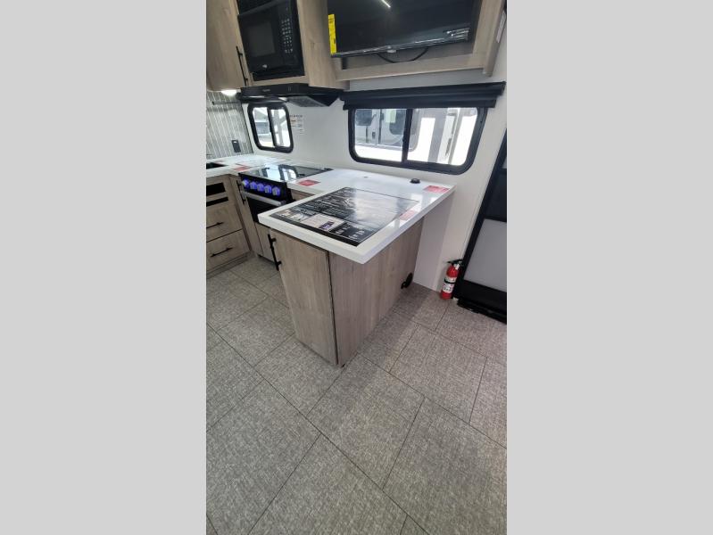 Escape to adventure with this fantastic travel trailer! The private bedroom features a plush 60" x 80" queen bed, spacious wardrobe, and TV prep for entertainment. The kitchen area is fitted with a pull-out pantry, 10 cu. refrigerator, microwave, and three-burner cooktop for gourmet meal prep. Enjoy extra counter space with the flip-up countertop extension, ideal for easy and comfortable cooking. Gather with family and friends at the theater dinette, featuring an LED HDTV for movie nights and game days after that, you can take a relaxing bath in the full rear bathroom, with ample storage. Stay organized on the go with pass-thru storage, 20” x 20” baggage door/trash can storage, and a spacious interior. Enjoy outdoor living under the shade of the 18’ awning, perfect for weekend getaways, or outdoor activities for the adventure-seekers.
