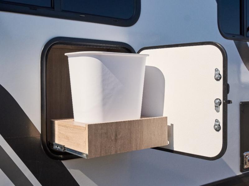 Outside, take advantage of the drop-frame pass-through storage, universal docking station, and 20” x 20” baggage door with trash can storage—perfect for organized travel. With 81" radius ceilings and panoramic windows, the interior feels open, bright, and inviting.