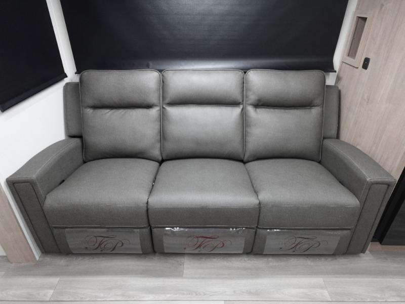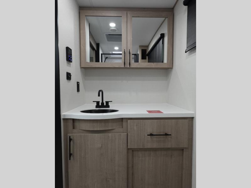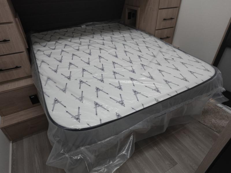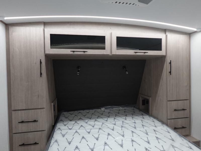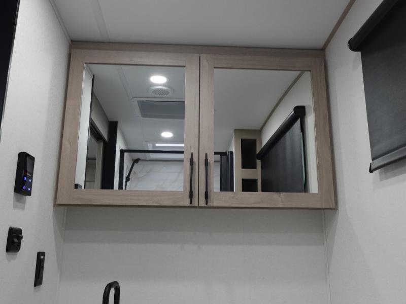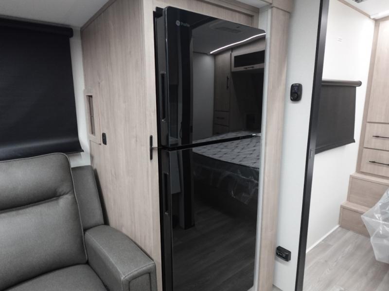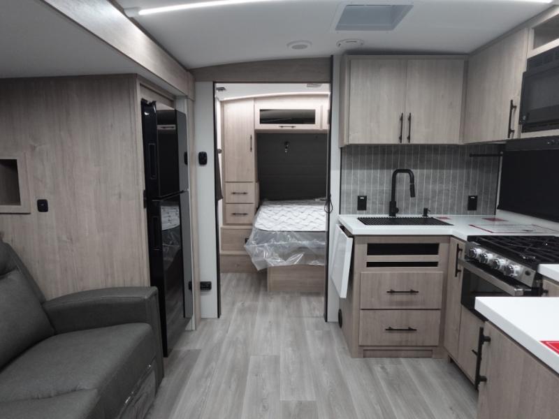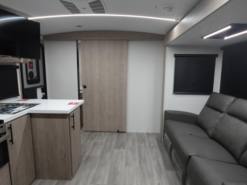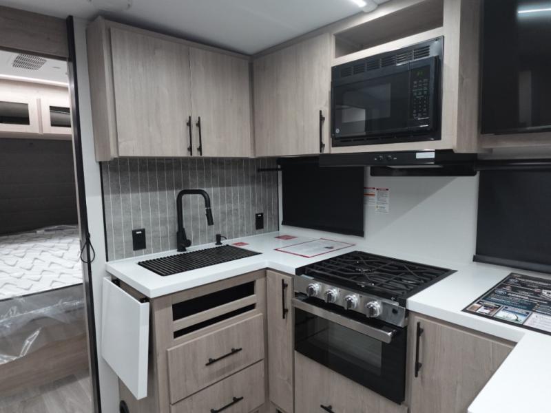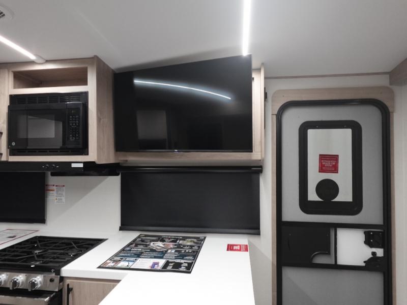 Escape to adventure with this fantastic travel trailer! The private bedroom features a plush 60" x 80" queen bed, spacious wardrobe, and TV prep for entertainment. The kitchen area is fitted with a pull-out pantry, 10 cu. refrigerator, microwave, and three-burner cooktop for gourmet meal prep. Enjoy extra counter space with the flip-up countertop extension, ideal for easy and comfortable cooking. Gather with family and friends at the theater dinette, featuring an LED HDTV for movie nights and game days after that, you can take a relaxing bath in the full rear bathroom, with ample storage. Stay organized on the go with pass-thru storage, 20” x 20” baggage door/trash can storage, and a spacious interior. Enjoy outdoor living under the shade of the 18’ awning, perfect for weekend getaways, or outdoor activities for the adventure-seekers.