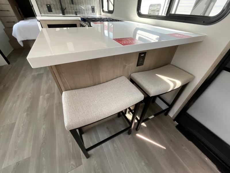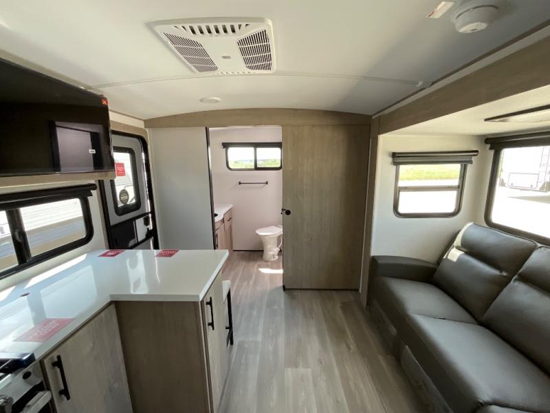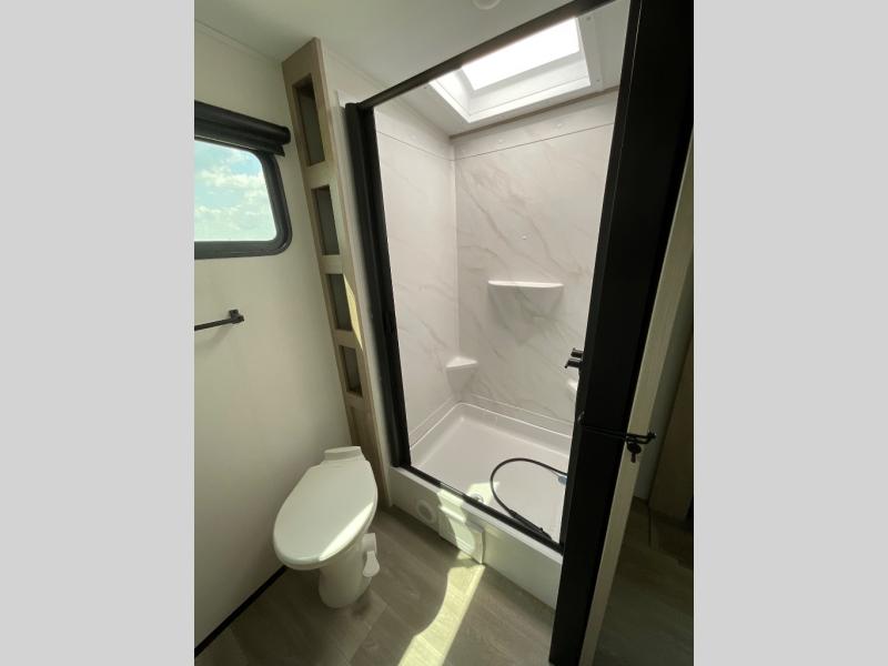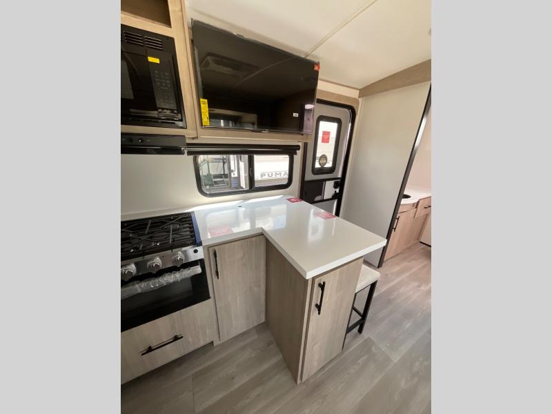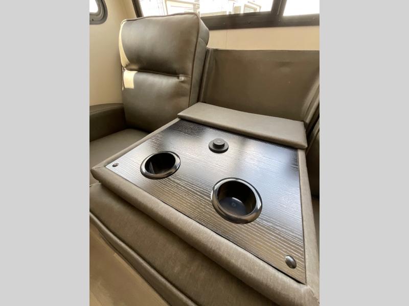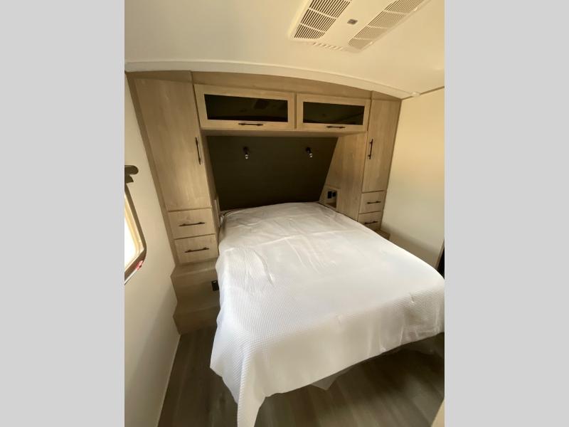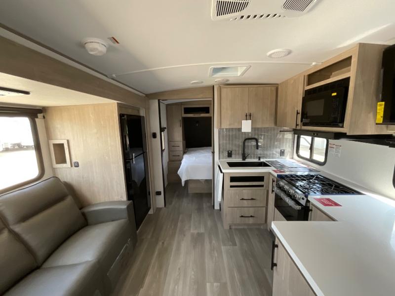 Escape to adventure with this fantastic travel trailer! The private bedroom features a plush 60" x 80" queen bed, spacious wardrobe, and TV prep for entertainment. The kitchen area is fitted with a pull-out pantry, 10 cu. refrigerator, microwave, and three-burner cooktop for gourmet meal prep. Enjoy extra counter space with the flip-up countertop extension, ideal for easy and comfortable cooking. Gather with family and friends at the theater dinette, featuring an LED HDTV for movie nights and game days after that, you can take a relaxing bath in the full rear bathroom, with ample storage. Stay organized on the go with pass-thru storage, 20” x 20” baggage door/trash can storage, and a spacious interior. Enjoy outdoor living under the shade of the 18’ awning, perfect for weekend getaways, or outdoor activities for the adventure-seekers.