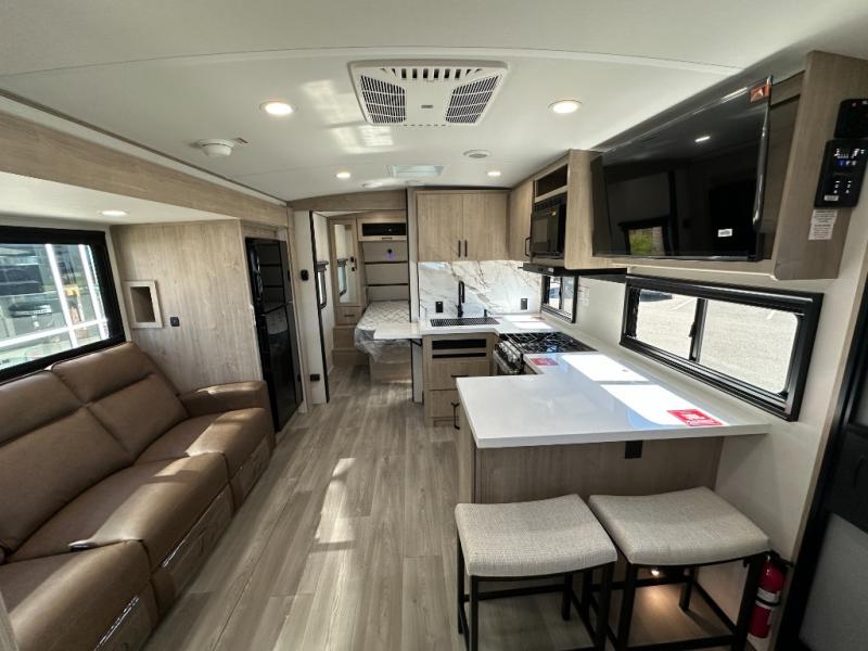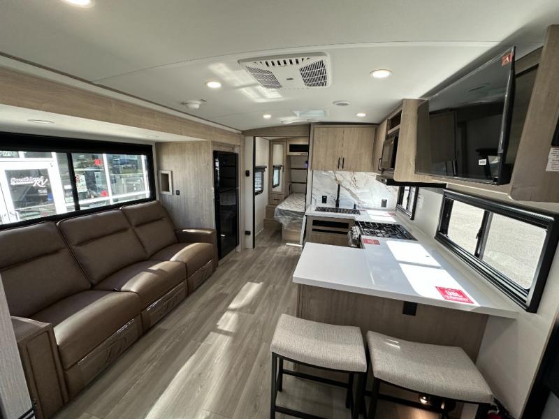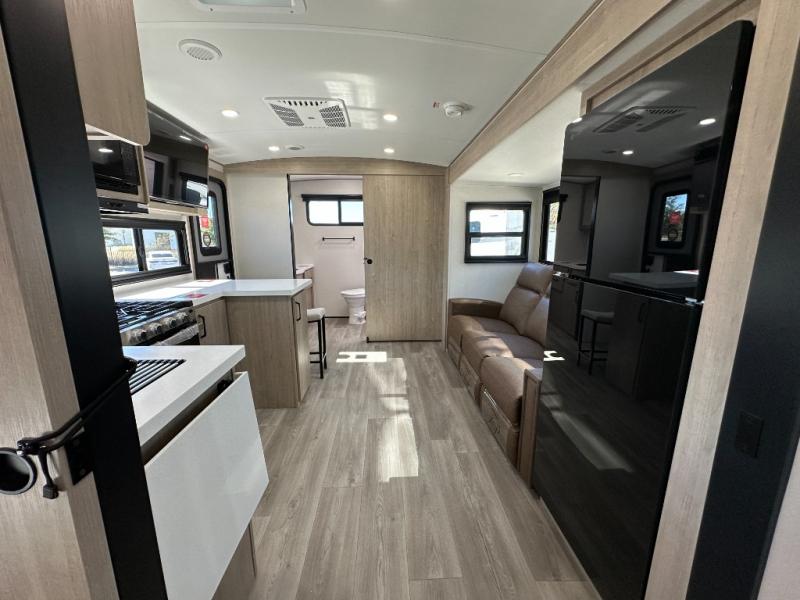Escape to adventure with this fantastic travel trailer! The private bedroom features a plush 60" x 80" queen bed, spacious wardrobe, and TV prep for entertainment. The kitchen area is fitted with a pull-out pantry, 10 cu. refrigerator, microwave, and three-burner cooktop for gourmet meal prep. Enjoy extra counter space with the flip-up countertop extension, ideal for easy and comfortable cooking. Gather with family and friends at the theater dinette, featuring an LED HDTV for movie nights and game days after that, you can take a relaxing bath in the full rear bathroom, with ample storage. Stay organized on the go with pass-thru storage, 20” x 20” baggage door/trash can storage, and a spacious interior. Enjoy outdoor living under the shade of the 18’ awning, perfect for weekend getaways, or outdoor activities for the adventure-seekers.