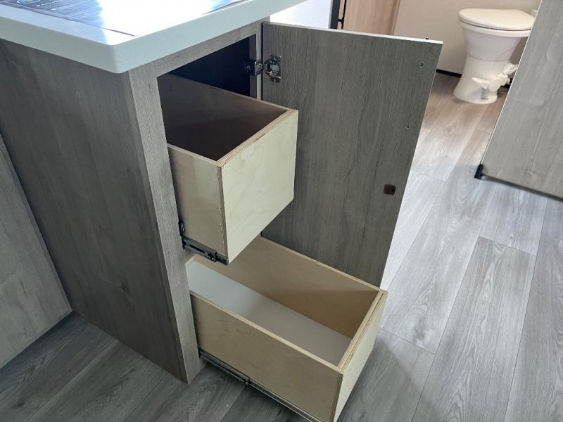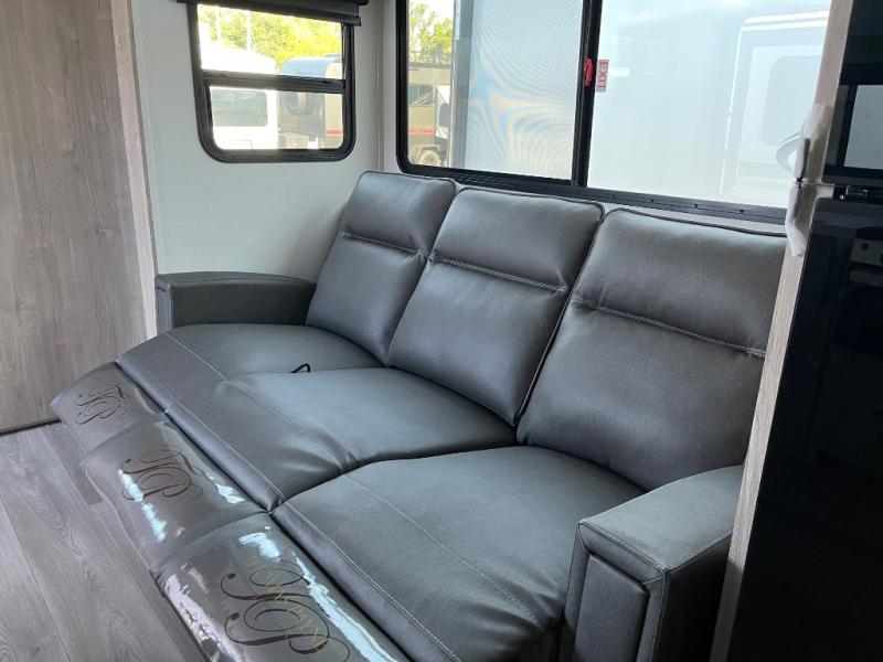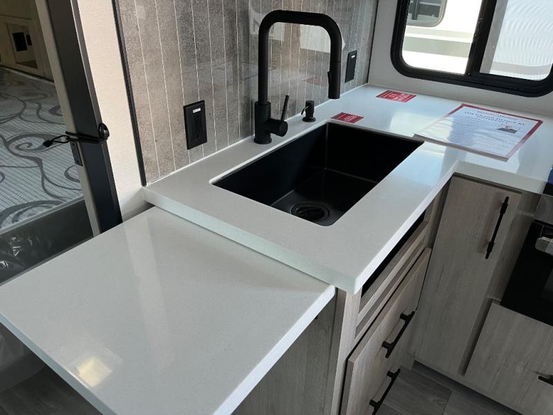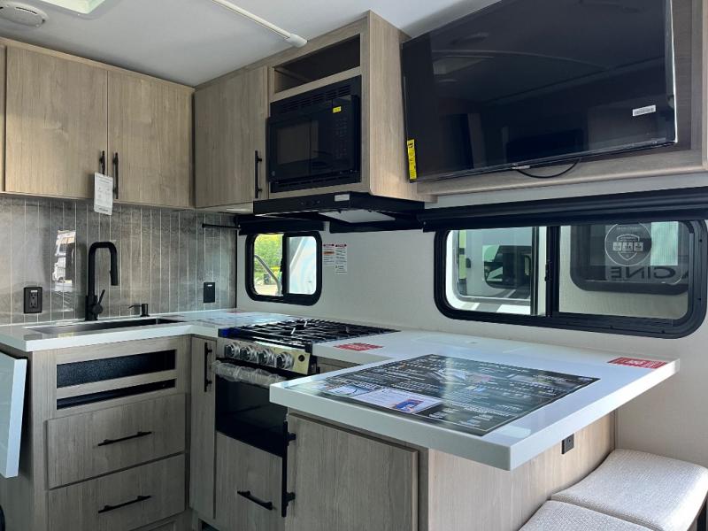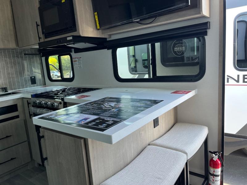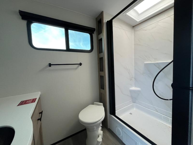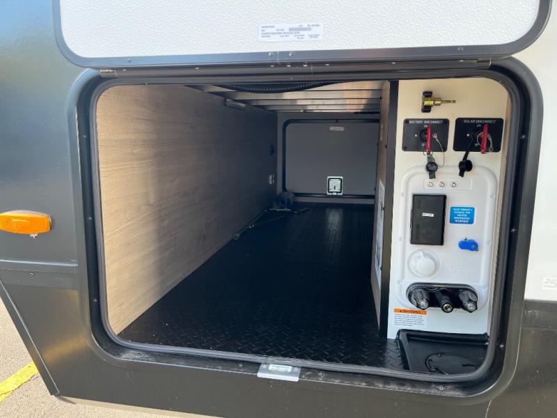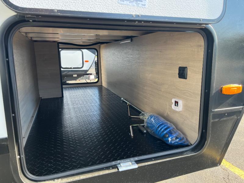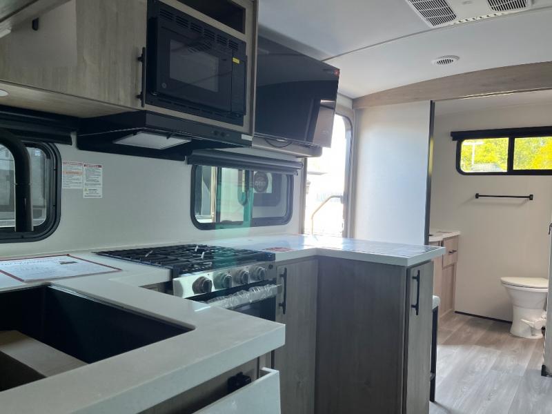 Escape to adventure with this fantastic travel trailer! The private bedroom features a plush 60" x 80" queen bed, spacious wardrobe, and TV prep for entertainment. The kitchen area is fitted with a pull-out pantry, 10 cu. refrigerator, microwave, and three-burner cooktop for gourmet meal prep. Enjoy extra counter space with the flip-up countertop extension, ideal for easy and comfortable cooking. Gather with family and friends at the theater dinette, featuring an LED HDTV for movie nights and game days after that, you can take a relaxing bath in the full rear bathroom, with ample storage. Stay organized on the go with pass-thru storage, 20” x 20” baggage door/trash can storage, and a spacious interior. Enjoy outdoor living under the shade of the 18’ awning, perfect for weekend getaways, or outdoor activities for the adventure-seekers.