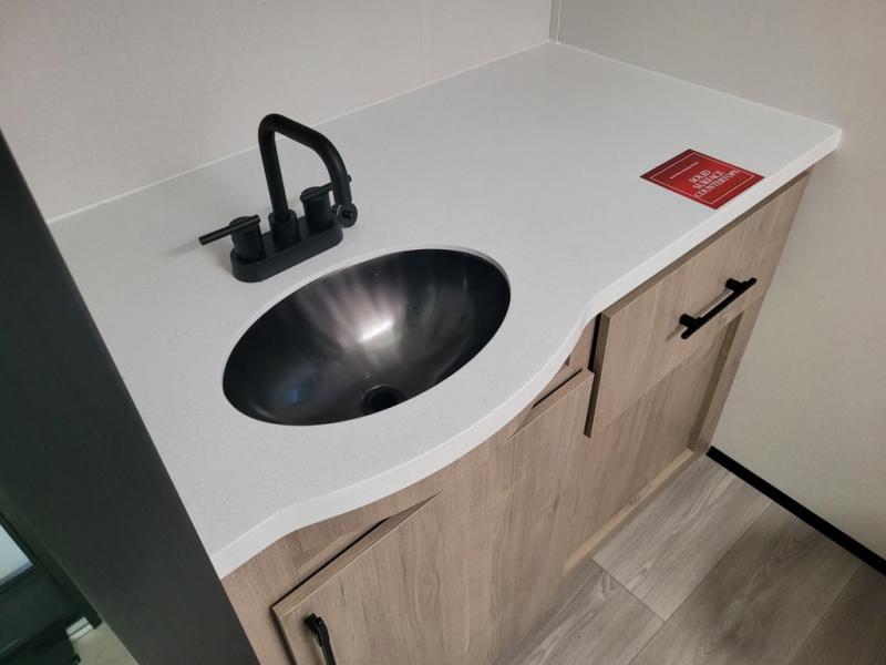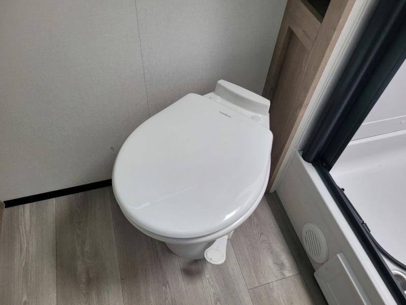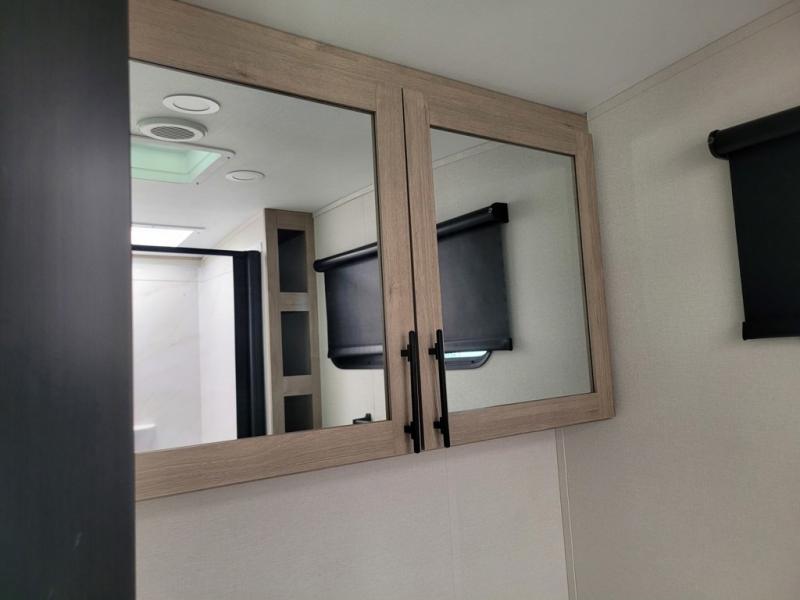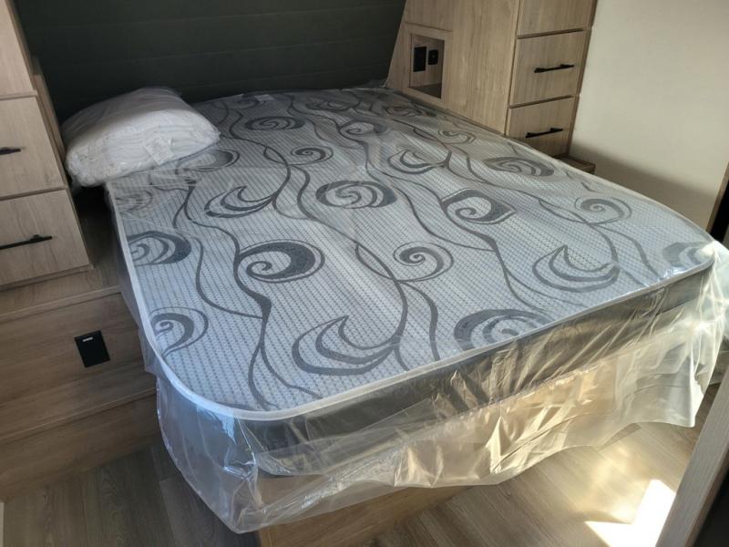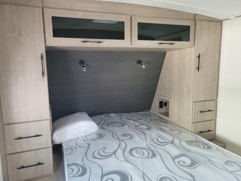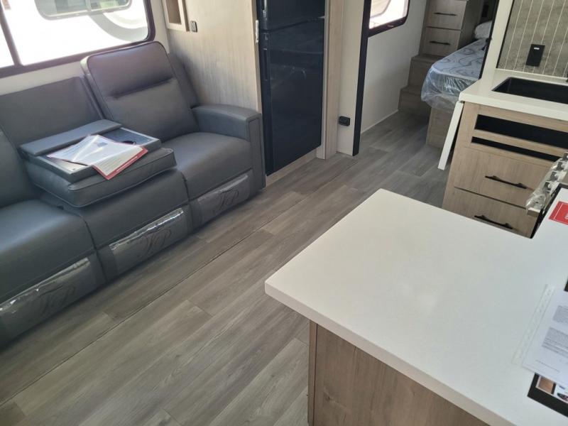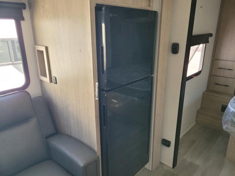 Escape to adventure with this fantastic travel trailer! The private bedroom features a plush 60" x 80" queen bed, spacious wardrobe, and TV prep for entertainment. The kitchen area is fitted with a pull-out pantry, 10 cu. refrigerator, microwave, and three-burner cooktop for gourmet meal prep. Enjoy extra counter space with the flip-up countertop extension, ideal for easy and comfortable cooking. Gather with family and friends at the theater dinette, featuring an LED HDTV for movie nights and game days after that, you can take a relaxing bath in the full rear bathroom, with ample storage. Stay organized on the go with pass-thru storage, 20” x 20” baggage door/trash can storage, and a spacious interior. Enjoy outdoor living under the shade of the 18’ awning, perfect for weekend getaways, or outdoor activities for the adventure-seekers.
