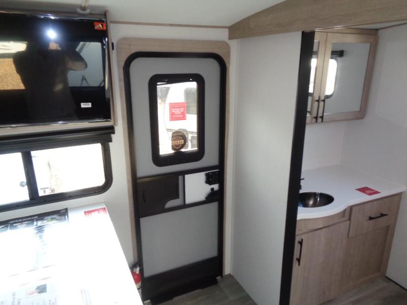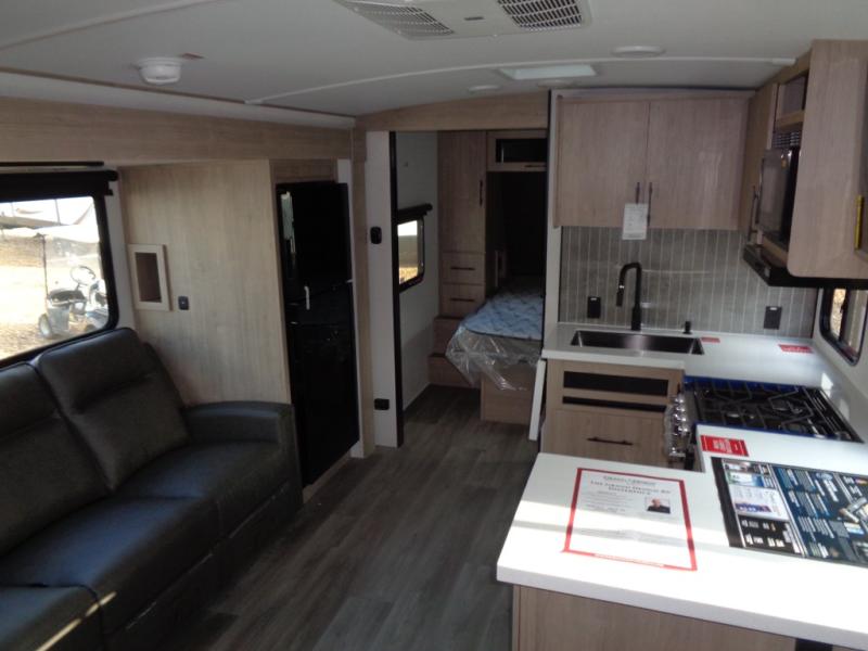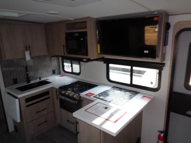 Escape to adventure with this fantastic travel trailer! The private bedroom features a plush 60" x 80" queen bed, spacious wardrobe, and TV prep for entertainment. The kitchen area is fitted with a pull-out pantry, 10 cu. refrigerator, microwave, and three-burner cooktop for gourmet meal prep. Enjoy extra counter space with the flip-up countertop extension, ideal for easy and comfortable cooking. Gather with family and friends at the theater dinette, featuring an LED HDTV for movie nights and game days after that, you can take a relaxing bath in the full rear bathroom, with ample storage. Stay organized on the go with pass-thru storage, 20” x 20” baggage door/trash can storage, and a spacious interior. Enjoy outdoor living under the shade of the 18’ awning, perfect for weekend getaways, or outdoor activities for the adventure-seekers.