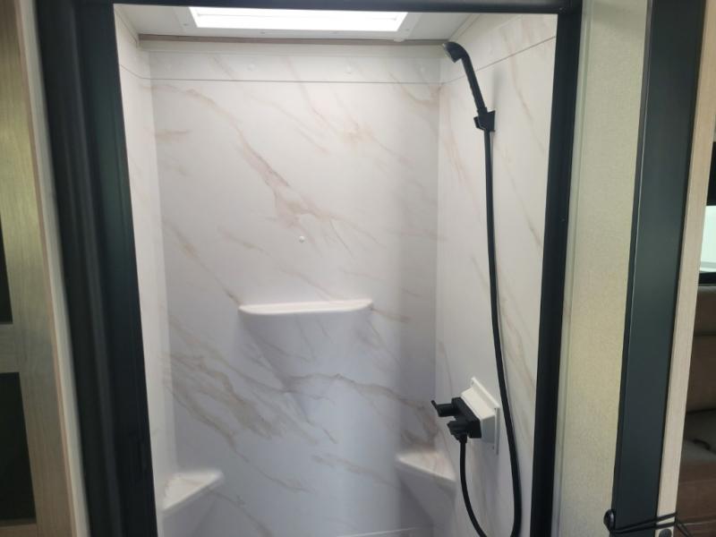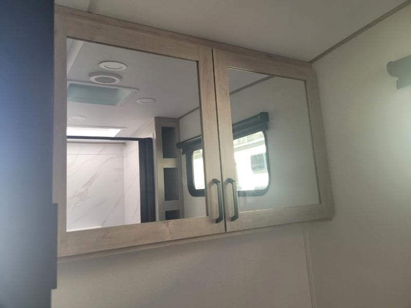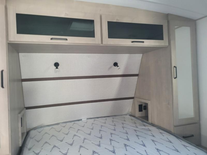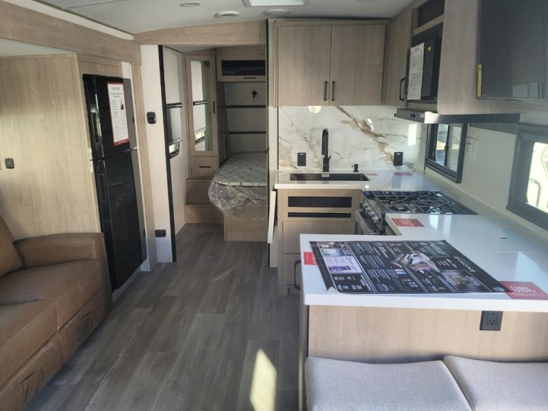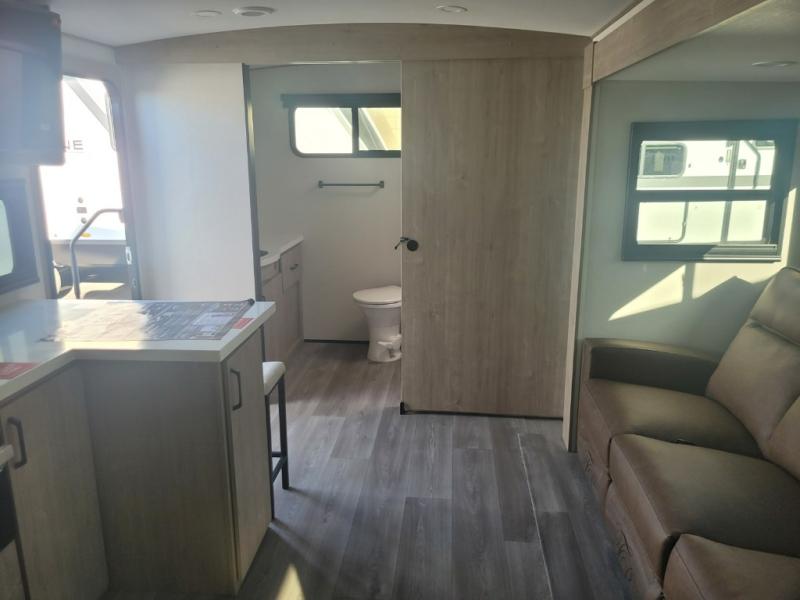Escape to adventure with this fantastic travel trailer! The private bedroom features a plush 60" x 80" queen bed, spacious wardrobe, and TV prep for entertainment. The kitchen area is fitted with a pull-out pantry, 10 cu. refrigerator, microwave, and three-burner cooktop for gourmet meal prep. Enjoy extra counter space with the flip-up countertop extension, ideal for easy and comfortable cooking. Gather with family and friends at the theater dinette, featuring an LED HDTV for movie nights and game days after that, you can take a relaxing bath in the full rear bathroom, with ample storage. Stay organized on the go with pass-thru storage, 20” x 20” baggage door/trash can storage, and a spacious interior. Enjoy outdoor living under the shade of the 18’ awning, perfect for weekend getaways, or outdoor activities for the adventure-seekers.