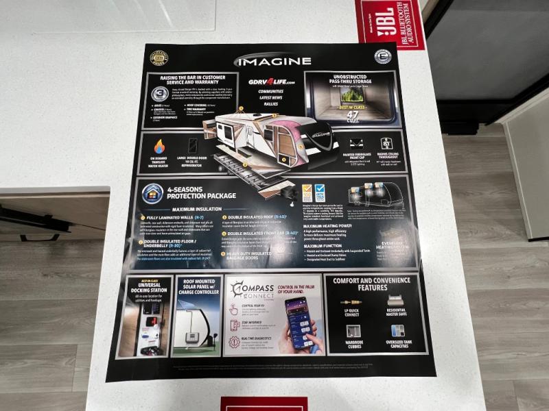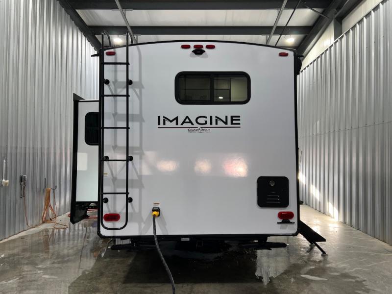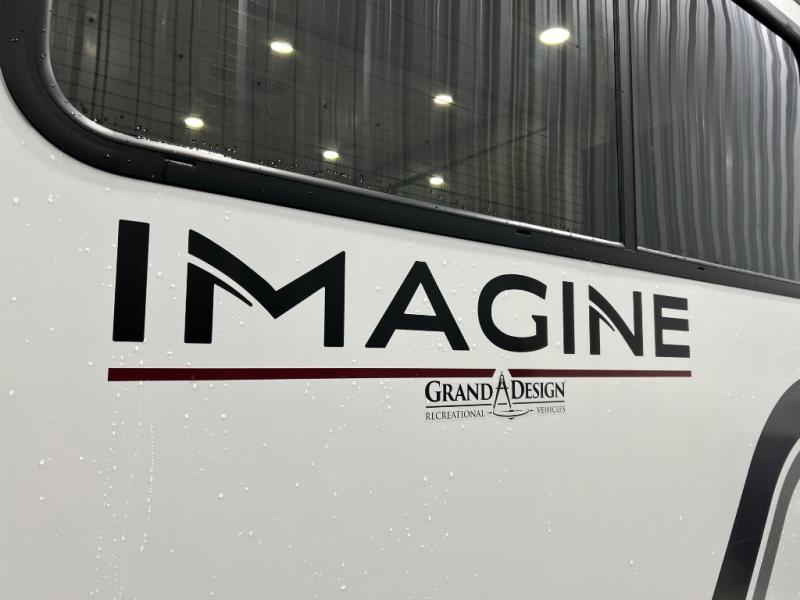 Just imagine leaving the world behind and secluding yourself away with your favorite people in your Grand Design Imagine travel trailer! The Imagine has been designed to enjoy extended season camping and includes a high-capacity furnace, a heated and enclosed underbelly with suspended tanks, a designated heat duct to the subfloor, and a high-density roof insulation with attic vent. You'll have maximum head room on the interior with 81" radius ceilings, and large panoramic windows to let in natural lighting. The exclusive drop-frame pass-through storage compartment is going to allow you to bring along lots of equipment, and the universal docking station is an all-in-one location for utilities and hook-ups. You'll also have oversized tank capacities so that you can fill and empty your tanks less often.