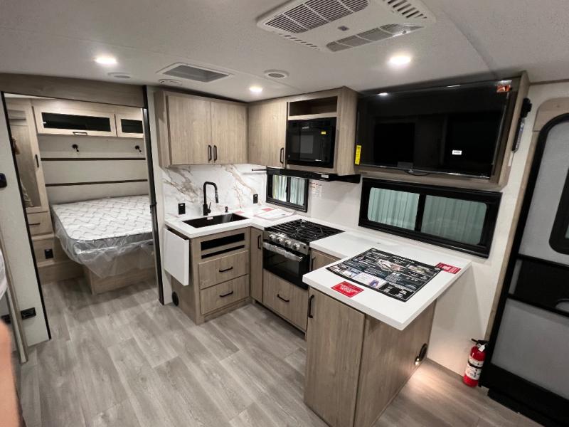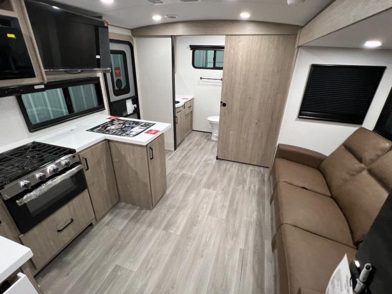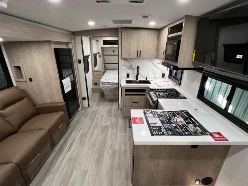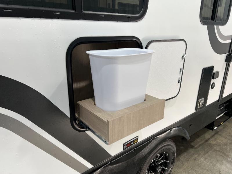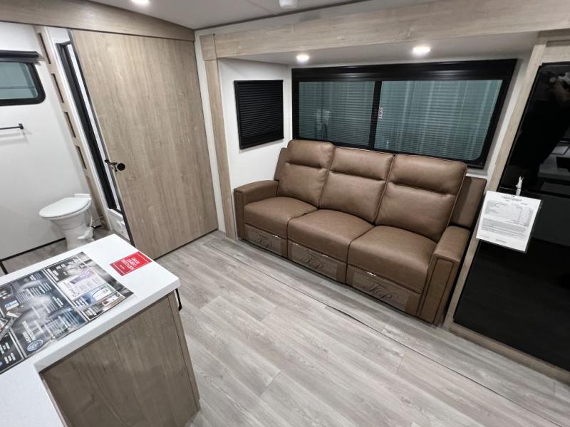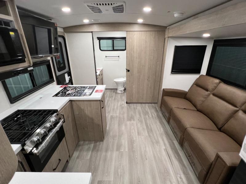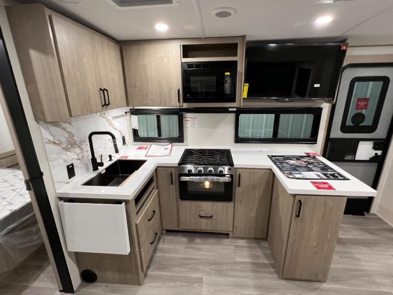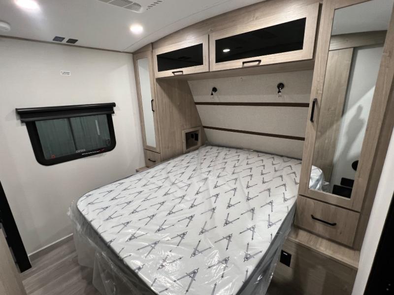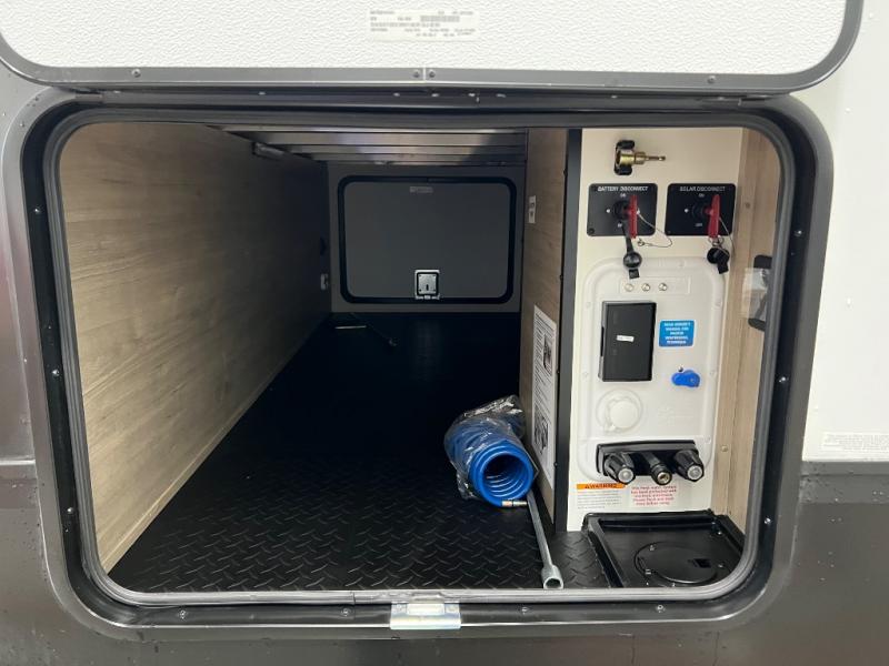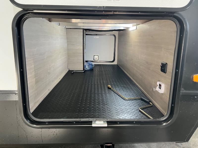 Escape to adventure with this fantastic travel trailer! The private bedroom features a plush 60" x 80" queen bed, spacious wardrobe, and TV prep for entertainment. The kitchen area is fitted with a pull-out pantry, 10 cu. refrigerator, microwave, and three-burner cooktop for gourmet meal prep. Enjoy extra counter space with the flip-up countertop extension, ideal for easy and comfortable cooking. Gather with family and friends at the theater dinette, featuring an LED HDTV for movie nights and game days after that, you can take a relaxing bath in the full rear bathroom, with ample storage. Stay organized on the go with pass-thru storage, 20” x 20” baggage door/trash can storage, and a spacious interior. Enjoy outdoor living under the shade of the 18’ awning, perfect for weekend getaways, or outdoor activities for the adventure-seekers.
