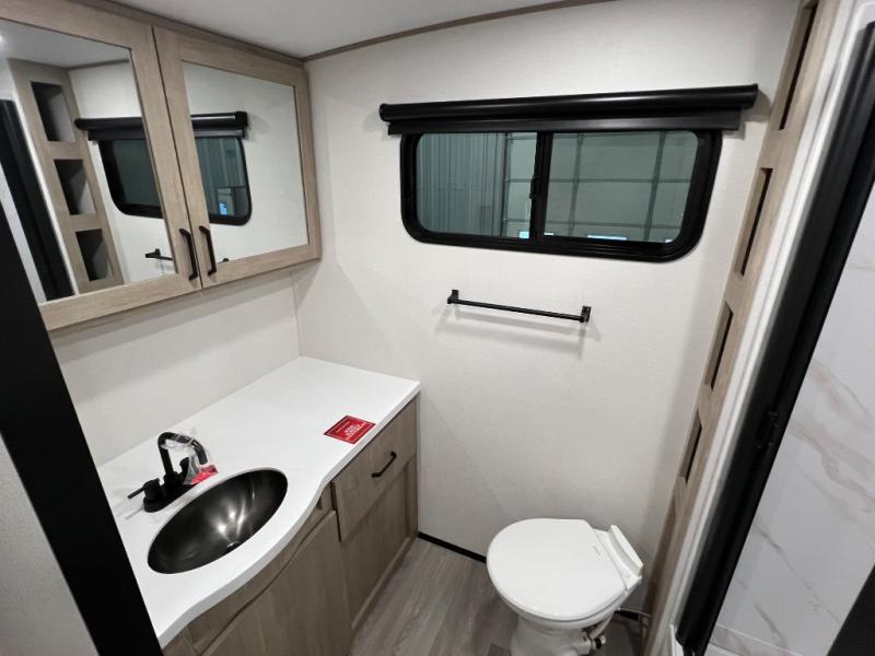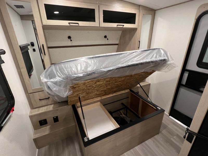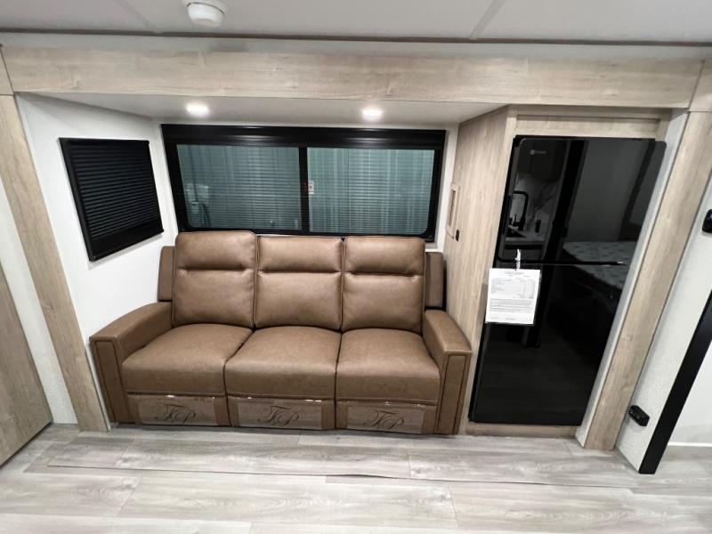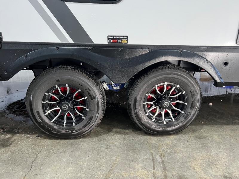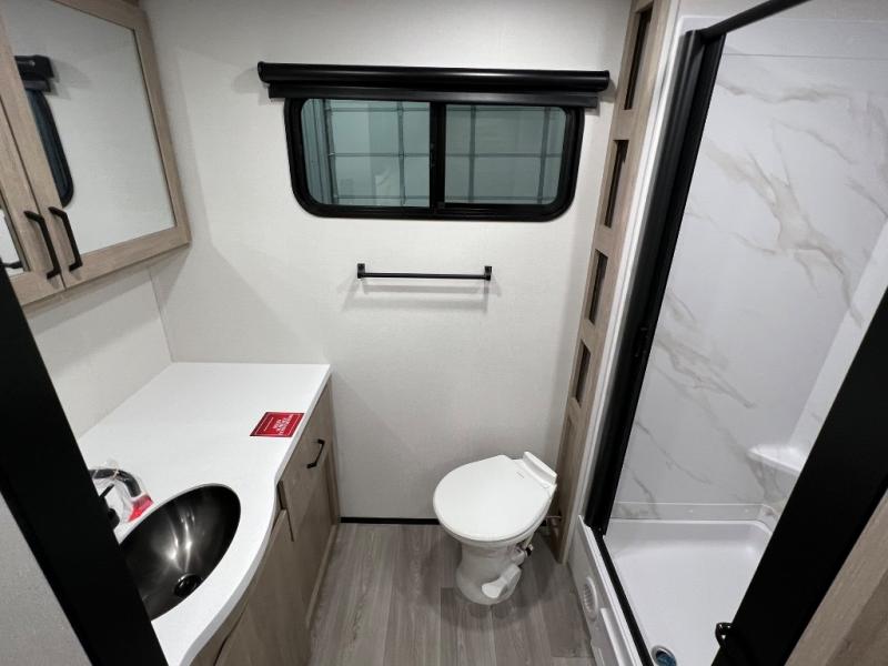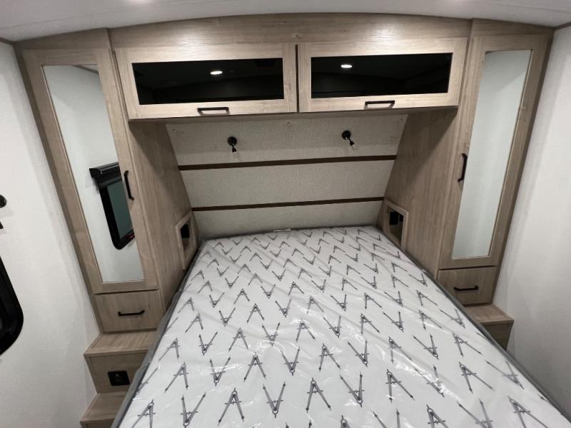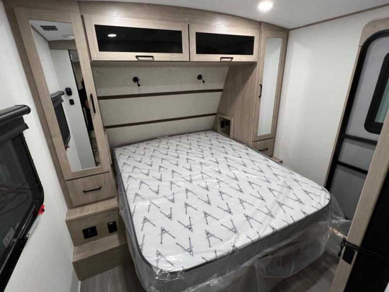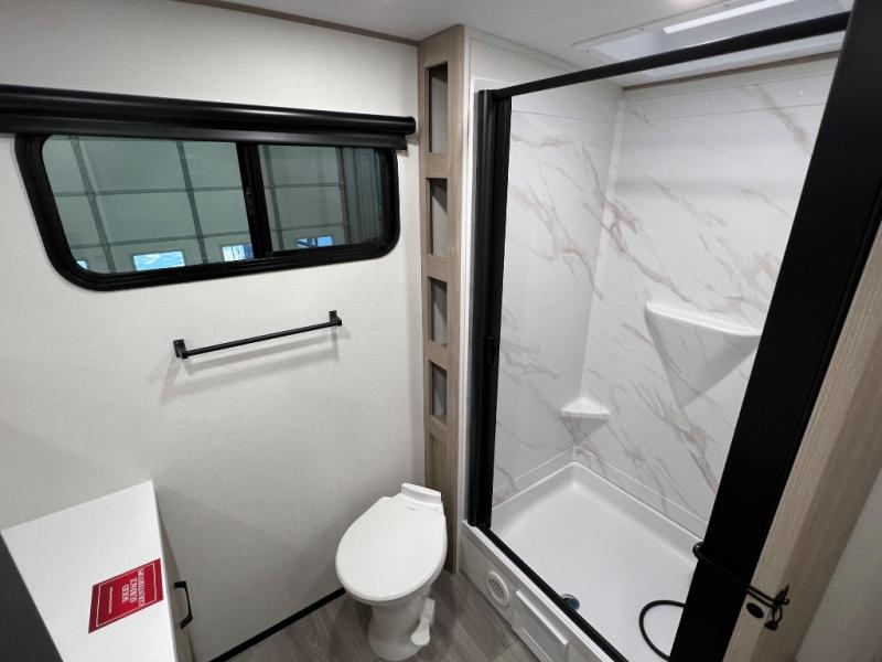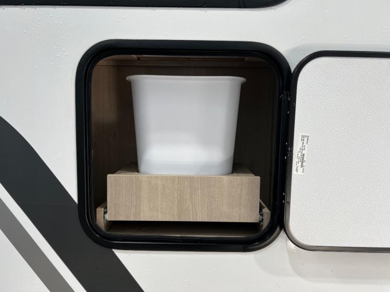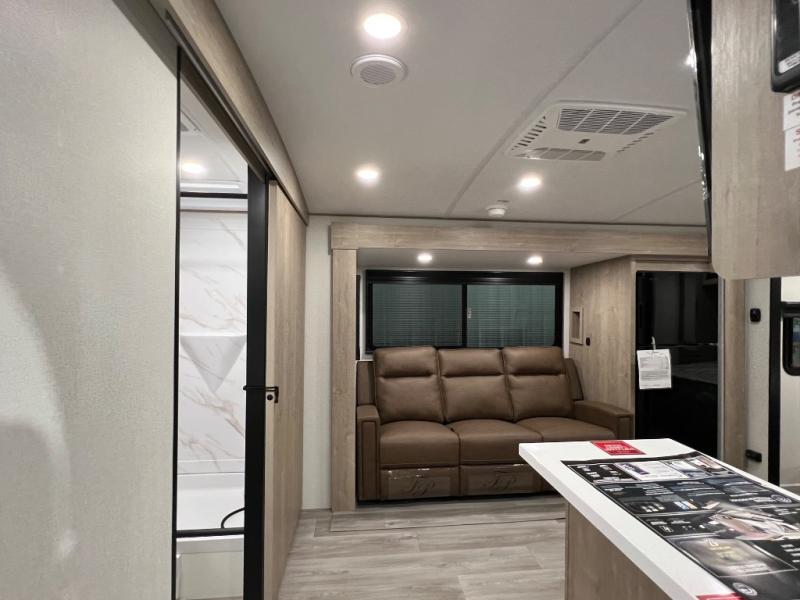 Escape to adventure with this fantastic travel trailer! The private bedroom features a plush 60" x 80" queen bed, spacious wardrobe, and TV prep for entertainment. The kitchen area is fitted with a pull-out pantry, 10 cu. refrigerator, microwave, and three-burner cooktop for gourmet meal prep. Enjoy extra counter space with the flip-up countertop extension, ideal for easy and comfortable cooking. Gather with family and friends at the theater dinette, featuring an LED HDTV for movie nights and game days after that, you can take a relaxing bath in the full rear bathroom, with ample storage. Stay organized on the go with pass-thru storage, 20” x 20” baggage door/trash can storage, and a spacious interior. Enjoy outdoor living under the shade of the 18’ awning, perfect for weekend getaways, or outdoor activities for the adventure-seekers.