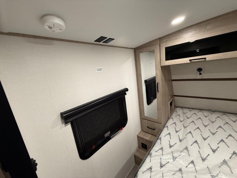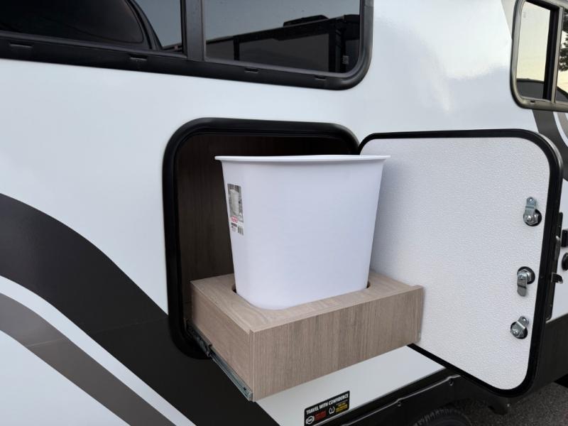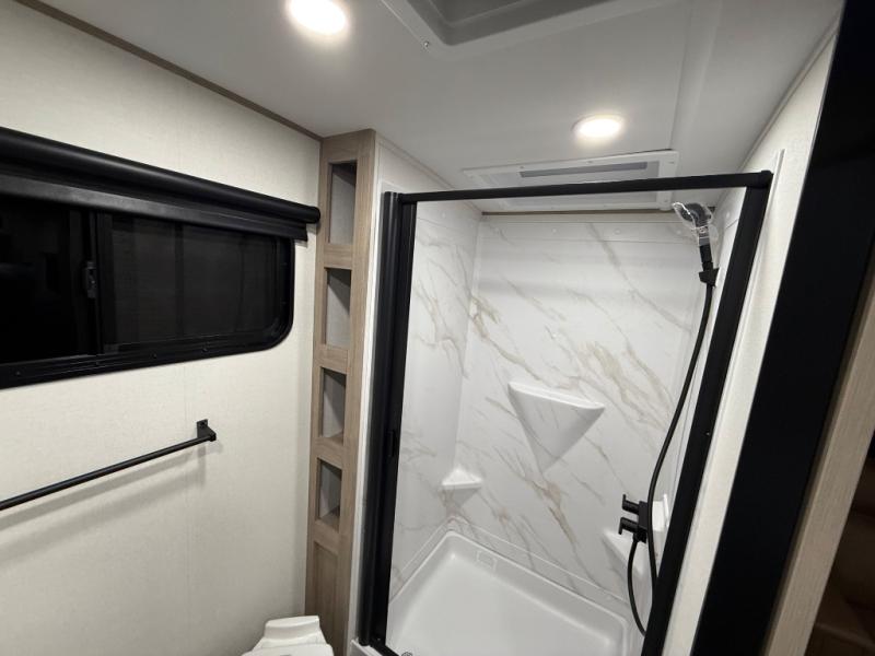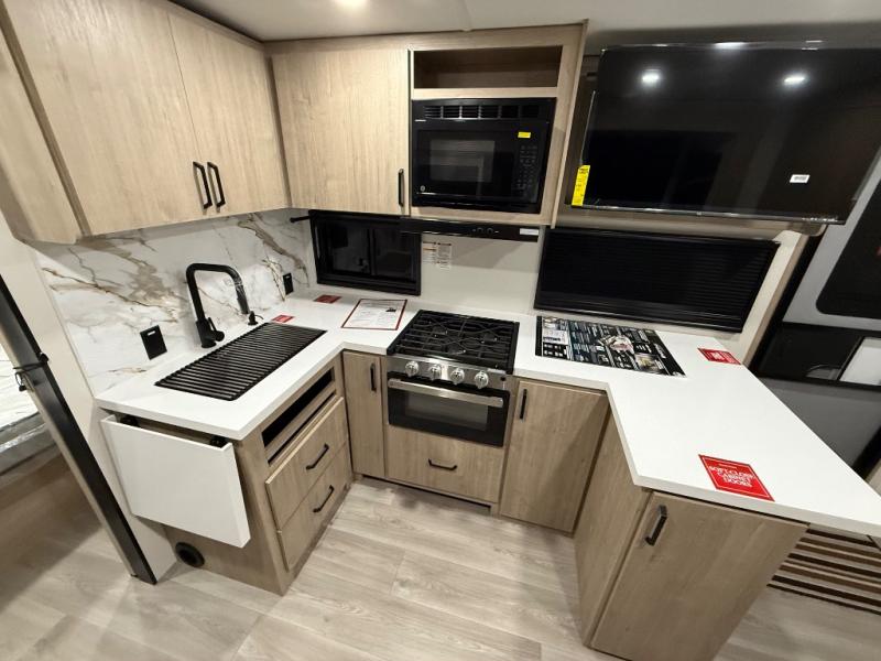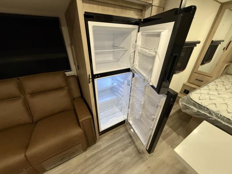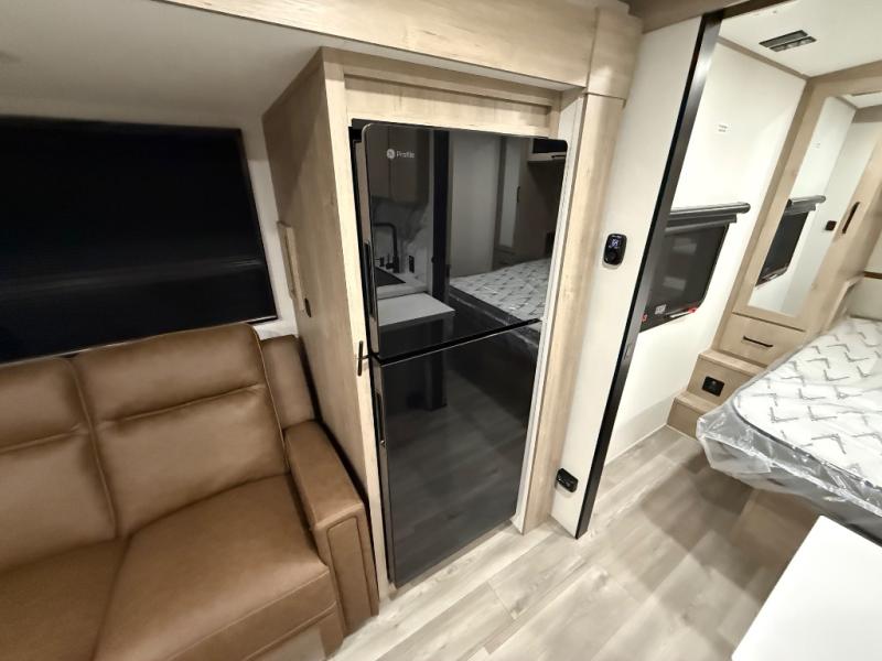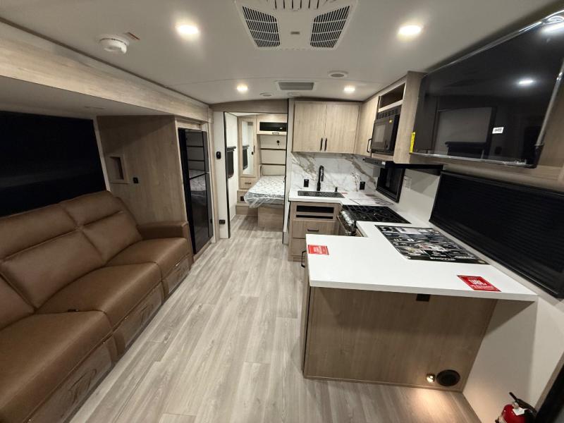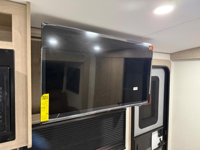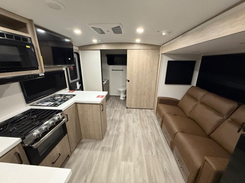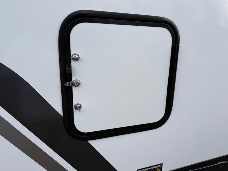 Escape to adventure with this fantastic travel trailer! The private bedroom features a plush 60" x 80" queen bed, spacious wardrobe, and TV prep for entertainment. The kitchen area is fitted with a pull-out pantry, 10 cu. refrigerator, microwave, and three-burner cooktop for gourmet meal prep. Enjoy extra counter space with the flip-up countertop extension, ideal for easy and comfortable cooking. Gather with family and friends at the theater dinette, featuring an LED HDTV for movie nights and game days after that, you can take a relaxing bath in the full rear bathroom, with ample storage. Stay organized on the go with pass-thru storage, 20” x 20” baggage door/trash can storage, and a spacious interior. Enjoy outdoor living under the shade of the 18’ awning, perfect for weekend getaways, or outdoor activities for the adventure-seekers.