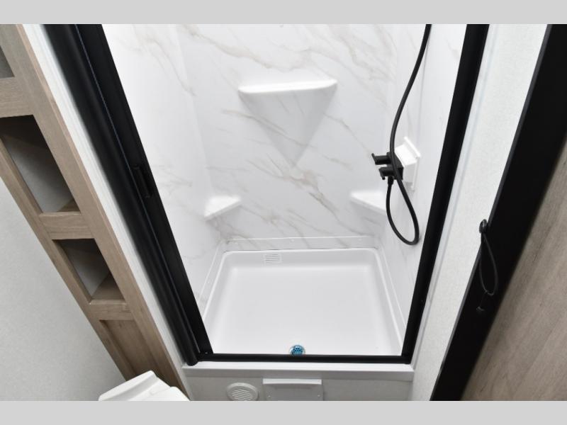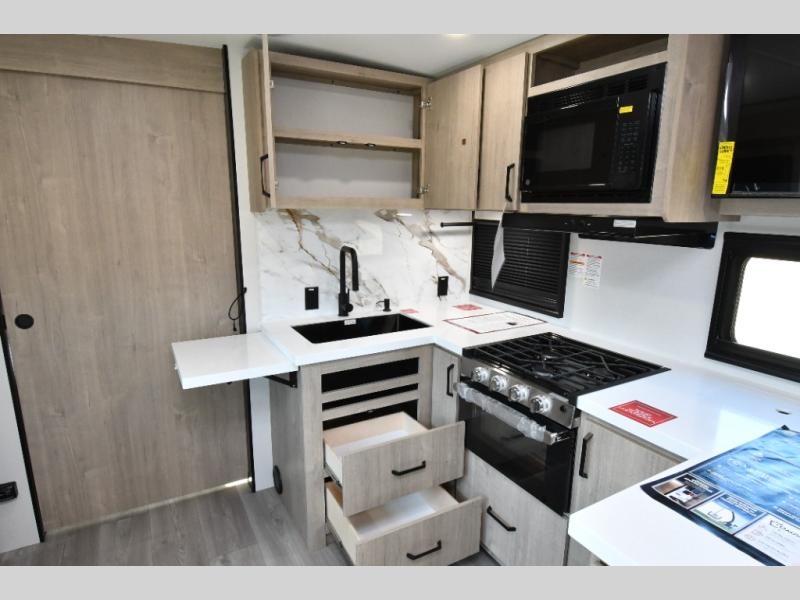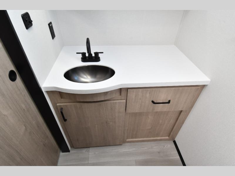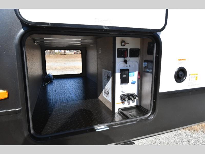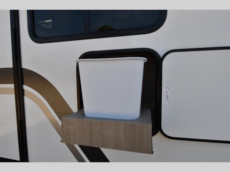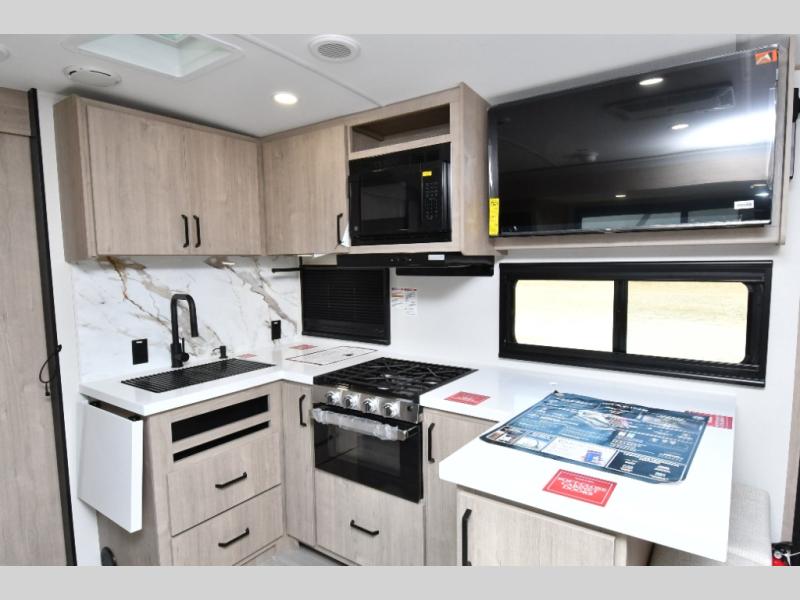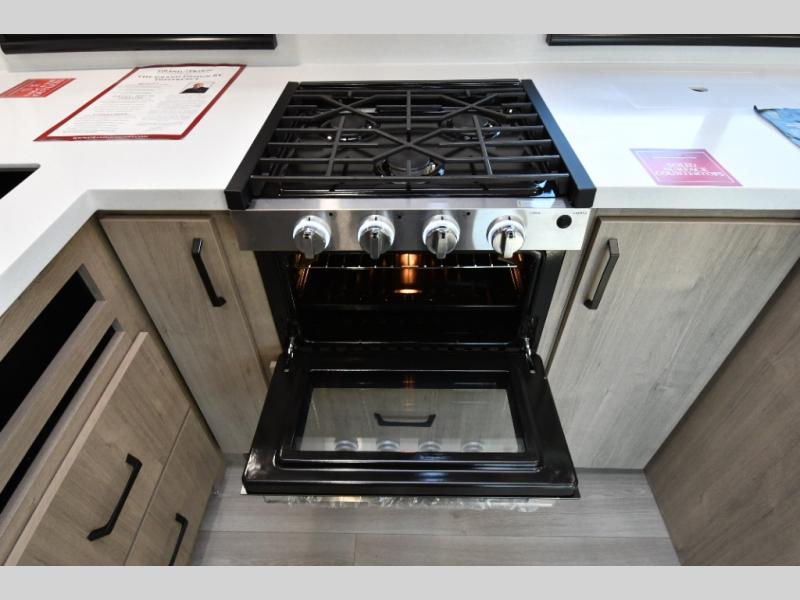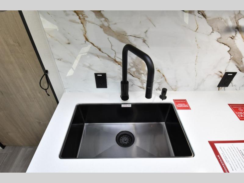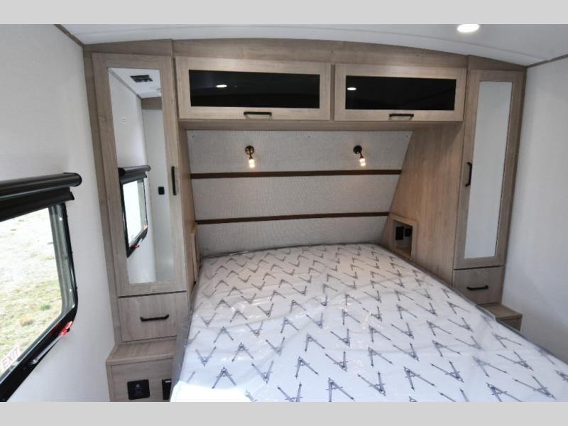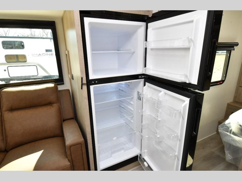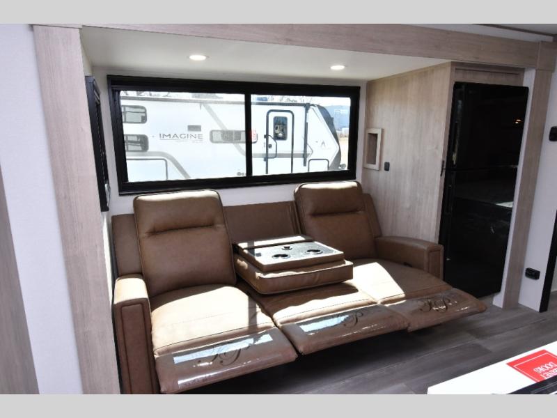 The well-appointed kitchen makes life on the road easy with a pull-out pantry, 10 cu. ft. refrigerator, microwave, three-burner cooktop, and flip-up countertop extension for extra prep space. Designed for extended-season camping, this Imagine 2300MK is equipped with the Four Seasons Protection Package, a high-capacity furnace, heated and enclosed underbelly with suspended tanks, and a dedicated heat duct to the subfloor. Outside, Goodyear tires, ABS axle assembly with sway control, and the Peace of Mind Package deliver confident towing, while the Solar Package and Ultimate Power Package help you stay powered wherever the road takes you. Oversized tank capacities, drop-frame pass-through storage, and a universal docking station keep every trip simple and organized.