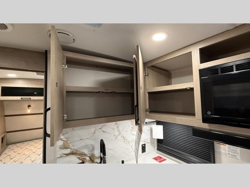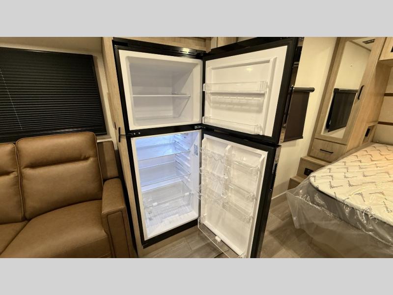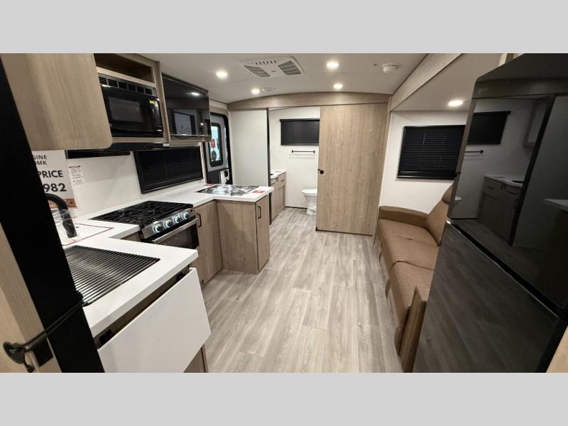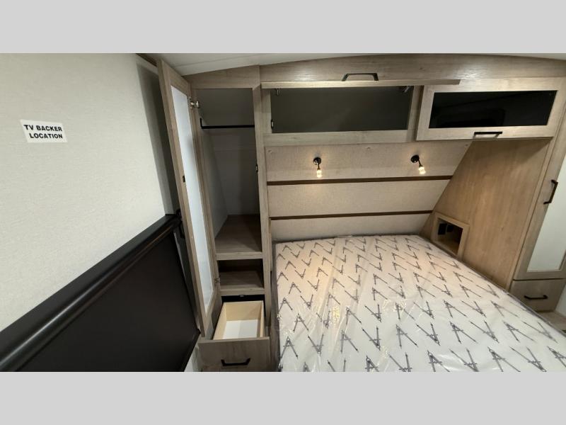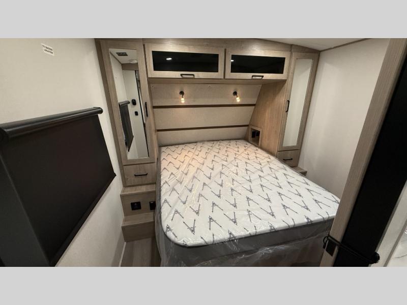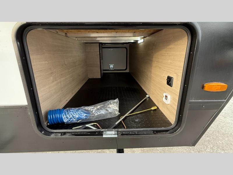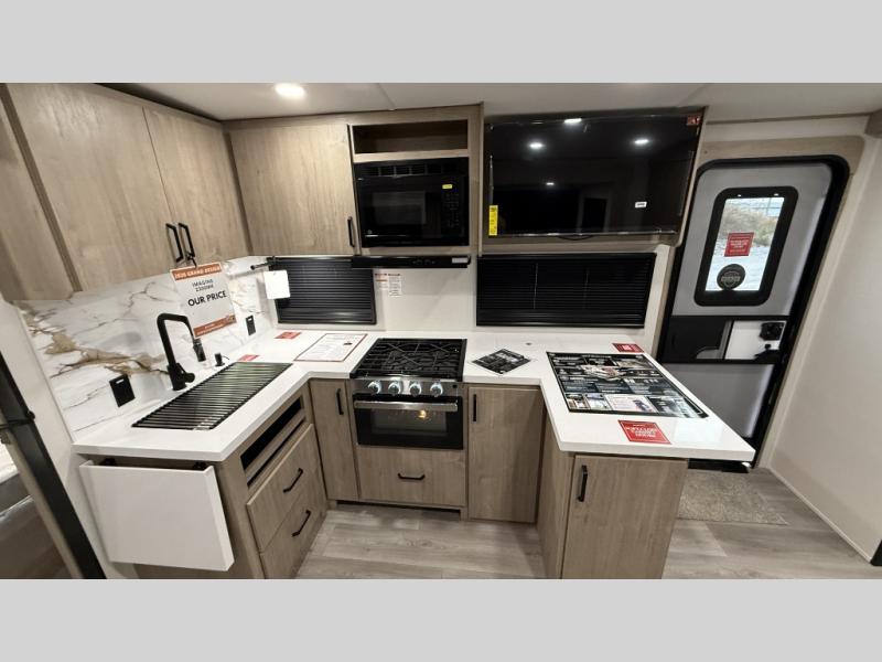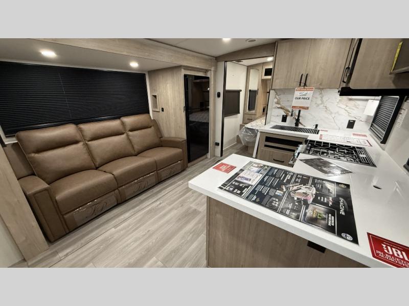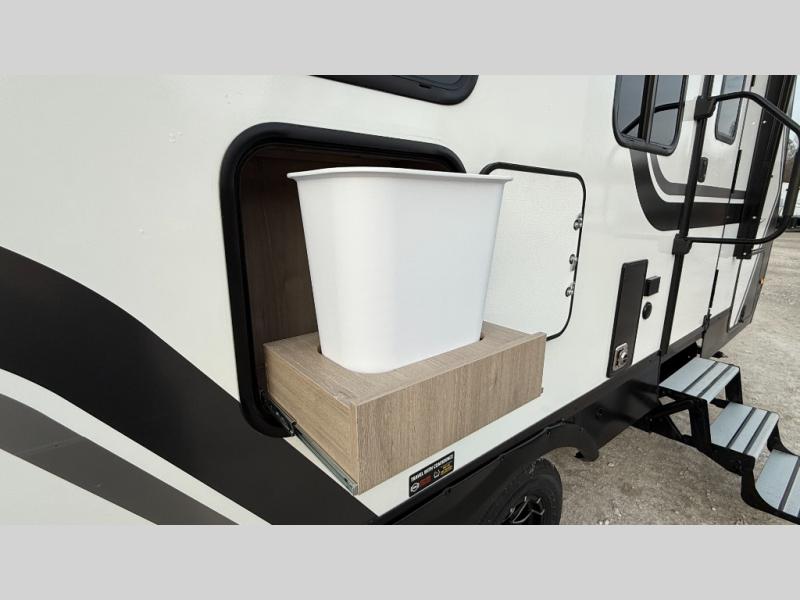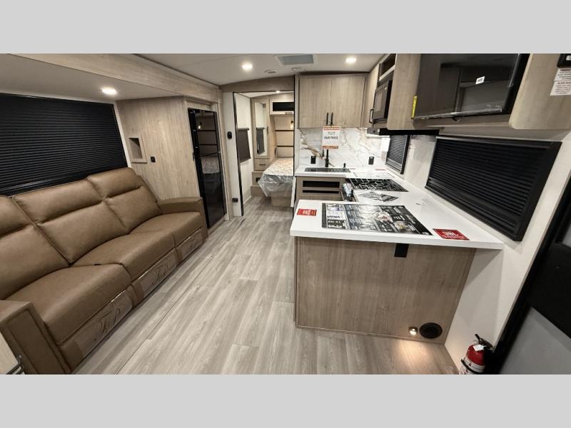 Escape to adventure with this fantastic travel trailer! The private bedroom features a plush 60" x 80" queen bed, spacious wardrobe, and TV prep for entertainment. The kitchen area is fitted with a pull-out pantry, 10 cu. refrigerator, microwave, and three-burner cooktop for gourmet meal prep. Enjoy extra counter space with the flip-up countertop extension, ideal for easy and comfortable cooking. Gather with family and friends at the theater dinette, featuring an LED HDTV for movie nights and game days after that, you can take a relaxing bath in the full rear bathroom, with ample storage. Stay organized on the go with pass-thru storage, 20” x 20” baggage door/trash can storage, and a spacious interior. Enjoy outdoor living under the shade of the 18’ awning, perfect for weekend getaways, or outdoor activities for the adventure-seekers.