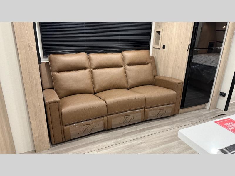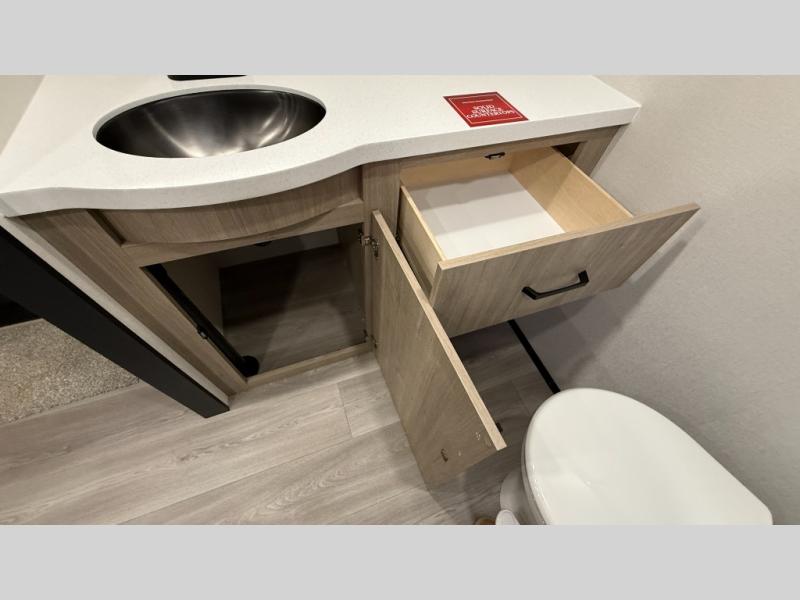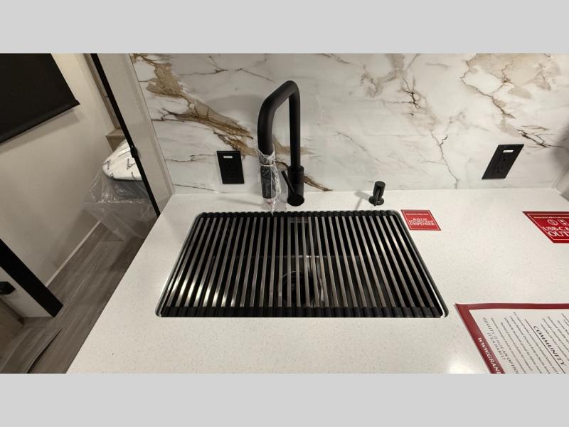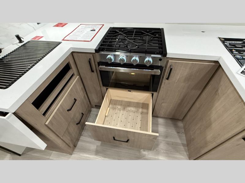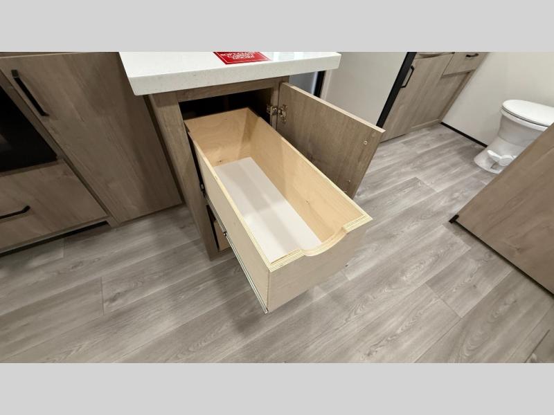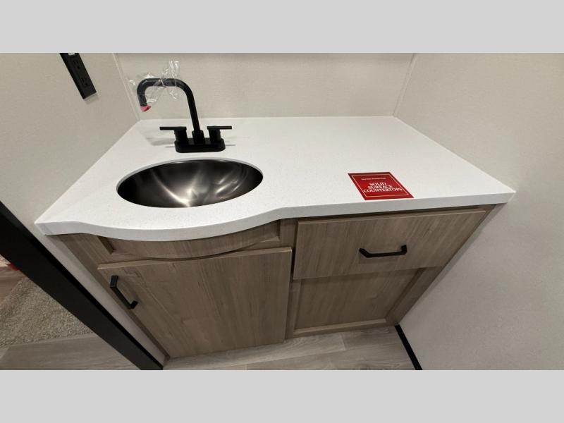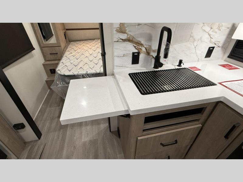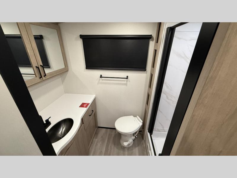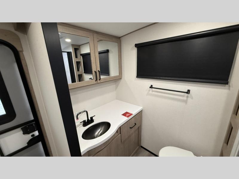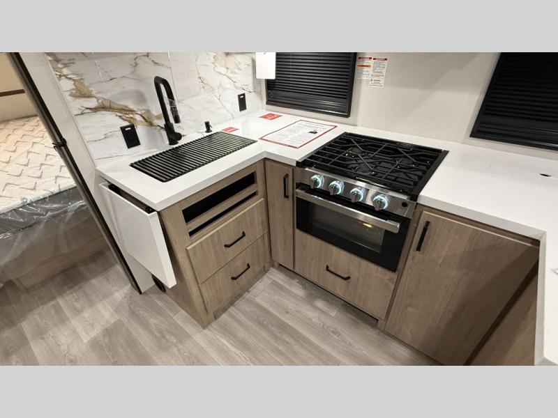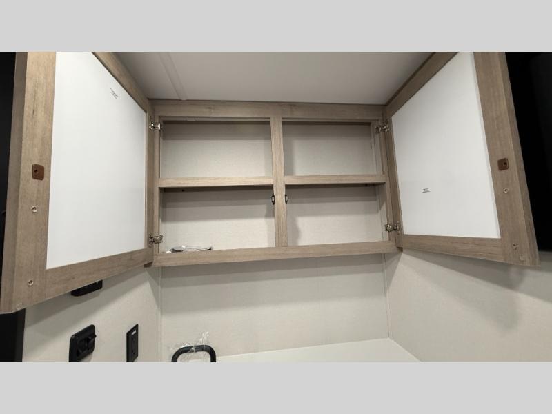 Escape to adventure with this fantastic travel trailer! The private bedroom features a plush 60" x 80" queen bed, spacious wardrobe, and TV prep for entertainment. The kitchen area is fitted with a pull-out pantry, 10 cu. refrigerator, microwave, and three-burner cooktop for gourmet meal prep. Enjoy extra counter space with the flip-up countertop extension, ideal for easy and comfortable cooking. Gather with family and friends at the theater dinette, featuring an LED HDTV for movie nights and game days after that, you can take a relaxing bath in the full rear bathroom, with ample storage. Stay organized on the go with pass-thru storage, 20” x 20” baggage door/trash can storage, and a spacious interior. Enjoy outdoor living under the shade of the 18’ awning, perfect for weekend getaways, or outdoor activities for the adventure-seekers.
