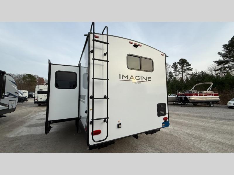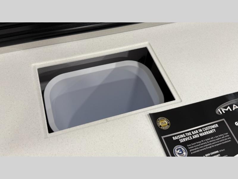 Just imagine leaving the world behind and secluding yourself away with your favorite people in your Grand Design Imagine travel trailer! The Imagine has been designed to enjoy extended season camping and includes a high-capacity furnace, a heated and enclosed underbelly with suspended tanks, a designated heat duct to the subfloor, and a high-density roof insulation with attic vent. You'll have maximum head room on the interior with 81" radius ceilings, and large panoramic windows to let in natural lighting. The exclusive drop-frame pass-through storage compartment is going to allow you to bring along lots of equipment, and the universal docking station is an all-in-one location for utilities and hook-ups. You'll also have oversized tank capacities so that you can fill and empty your tanks less often.