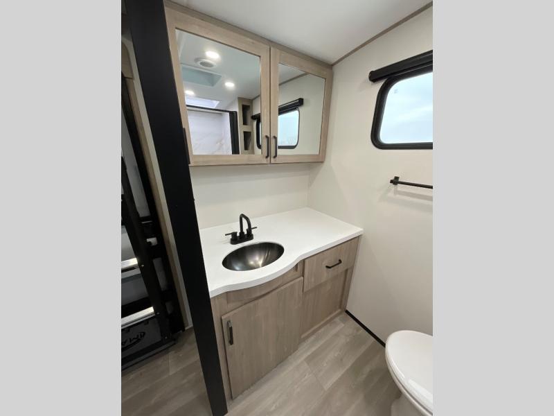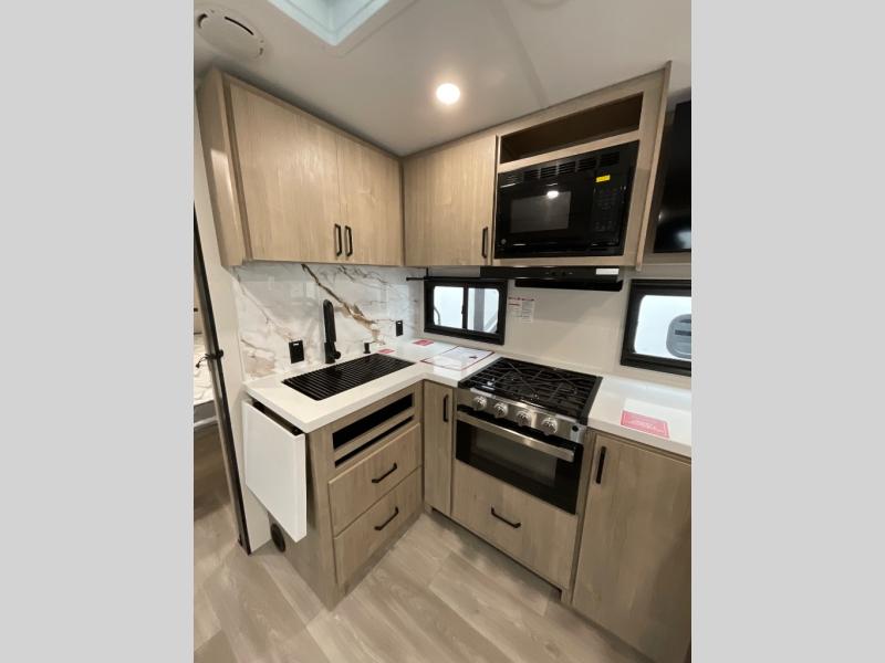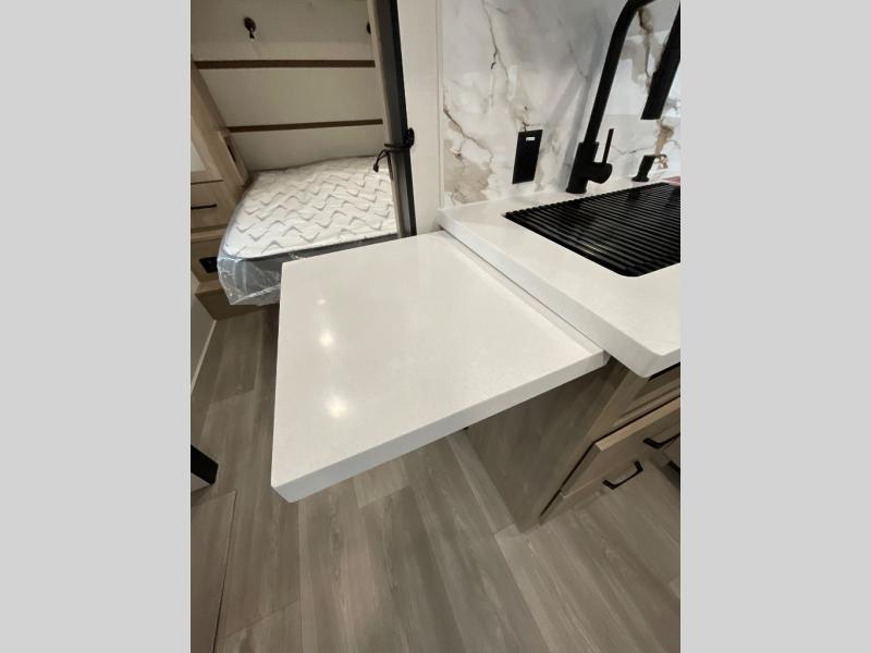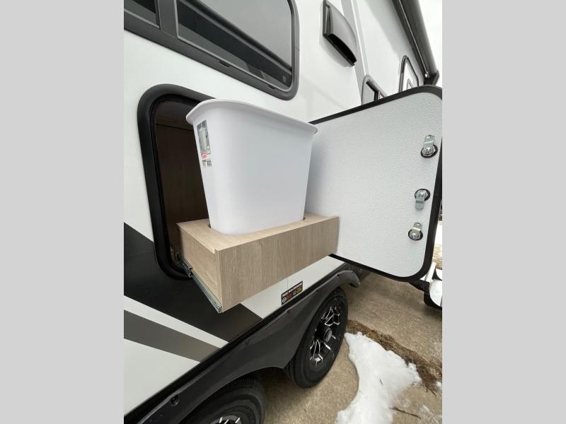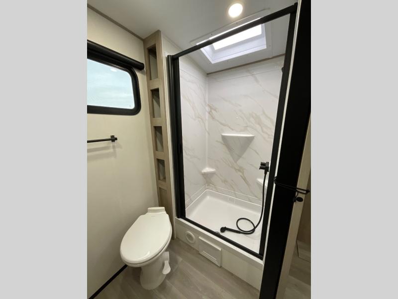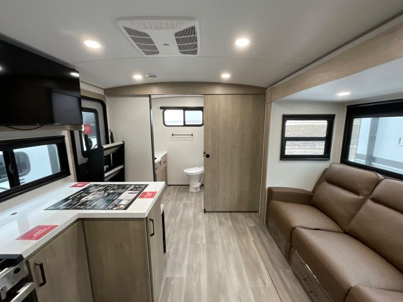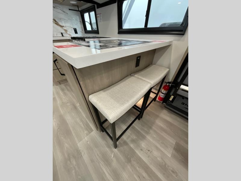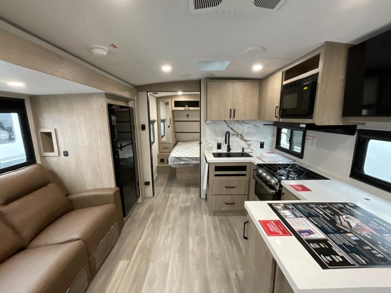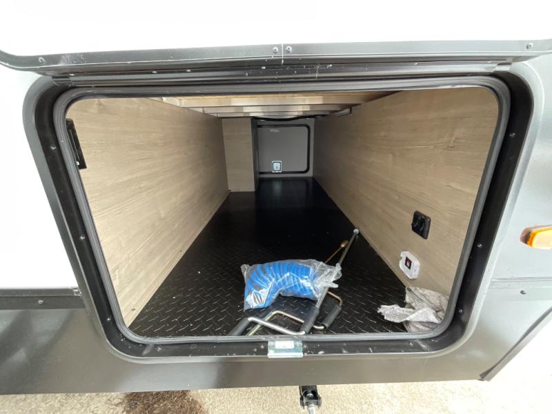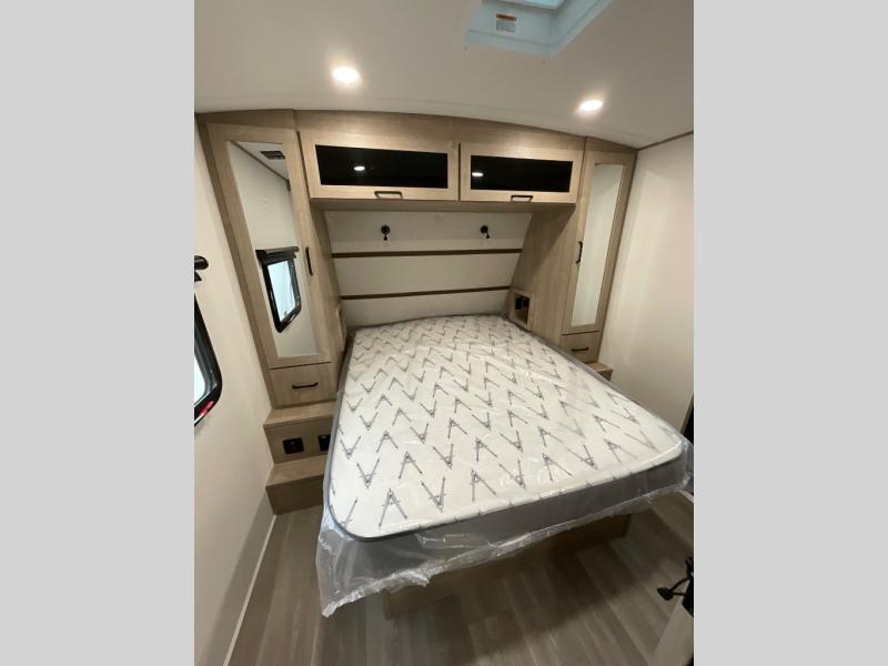 Escape to adventure with this fantastic travel trailer! The private bedroom features a plush 60" x 80" queen bed, spacious wardrobe, and TV prep for entertainment. The kitchen area is fitted with a pull-out pantry, 10 cu. refrigerator, microwave, and three-burner cooktop for gourmet meal prep. Enjoy extra counter space with the flip-up countertop extension, ideal for easy and comfortable cooking. Gather with family and friends at the theater dinette, featuring an LED HDTV for movie nights and game days after that, you can take a relaxing bath in the full rear bathroom, with ample storage. Stay organized on the go with pass-thru storage, 20” x 20” baggage door/trash can storage, and a spacious interior. Enjoy outdoor living under the shade of the 18’ awning, perfect for weekend getaways, or outdoor activities for the adventure-seekers.