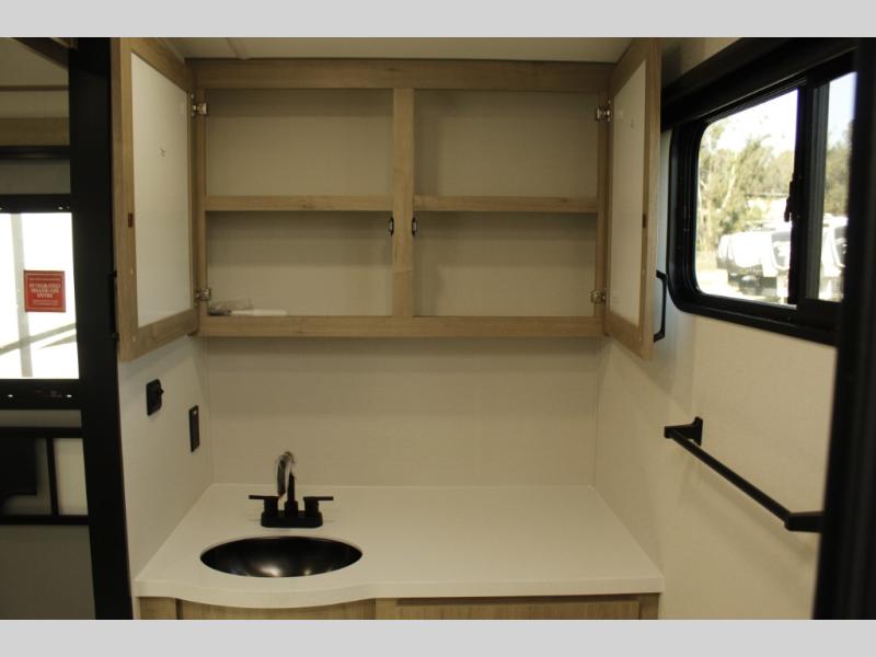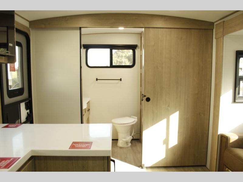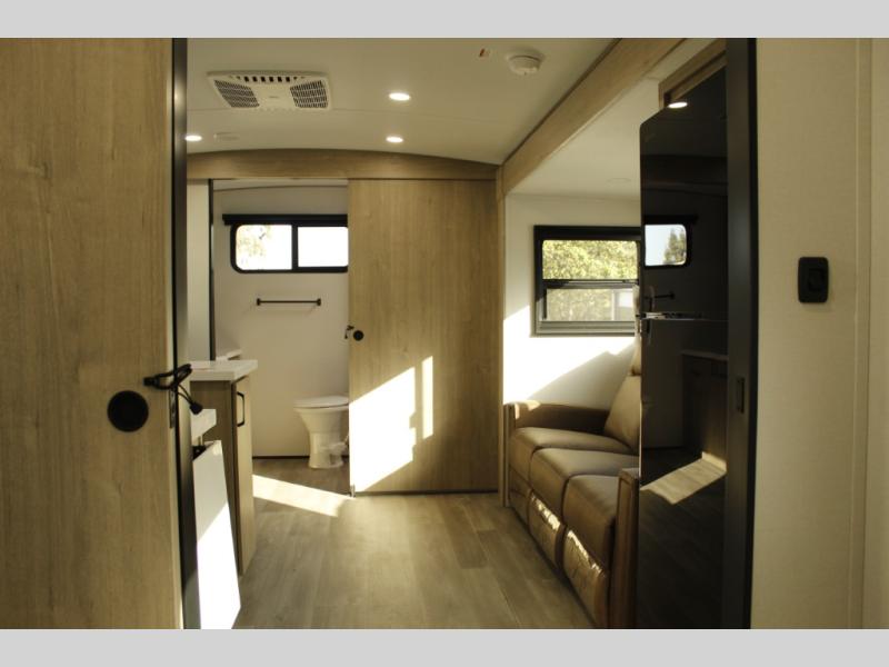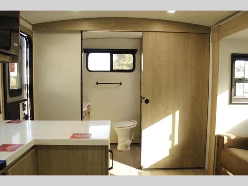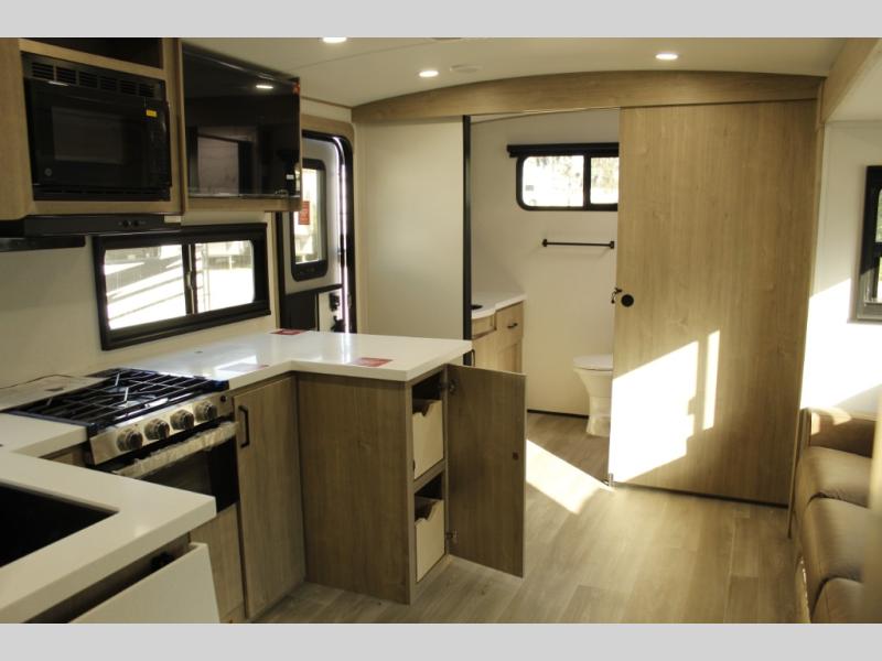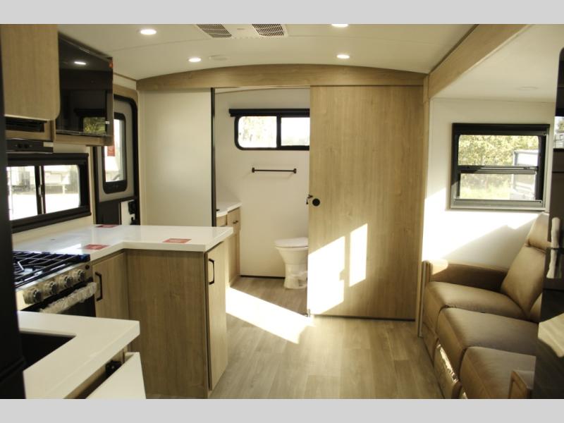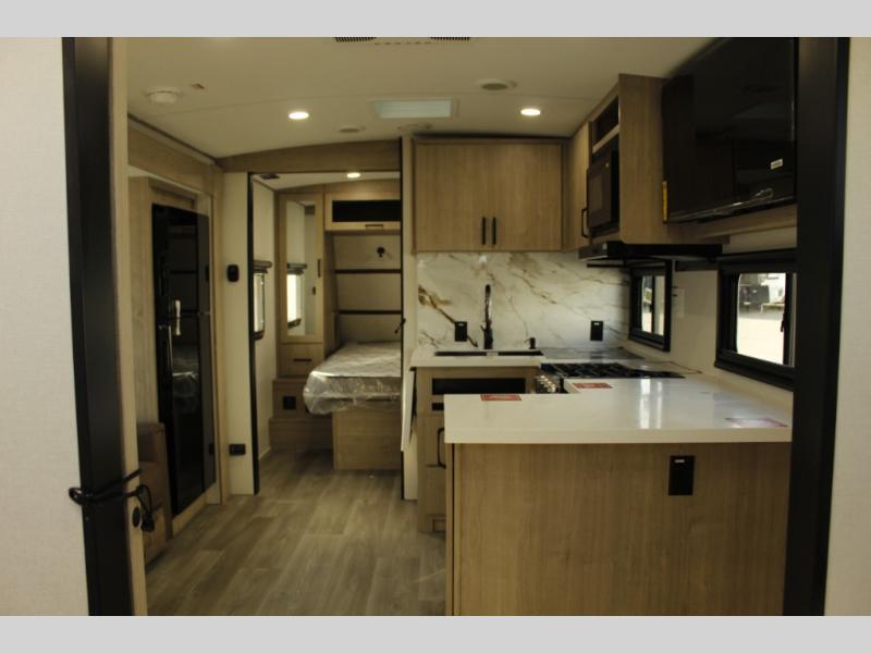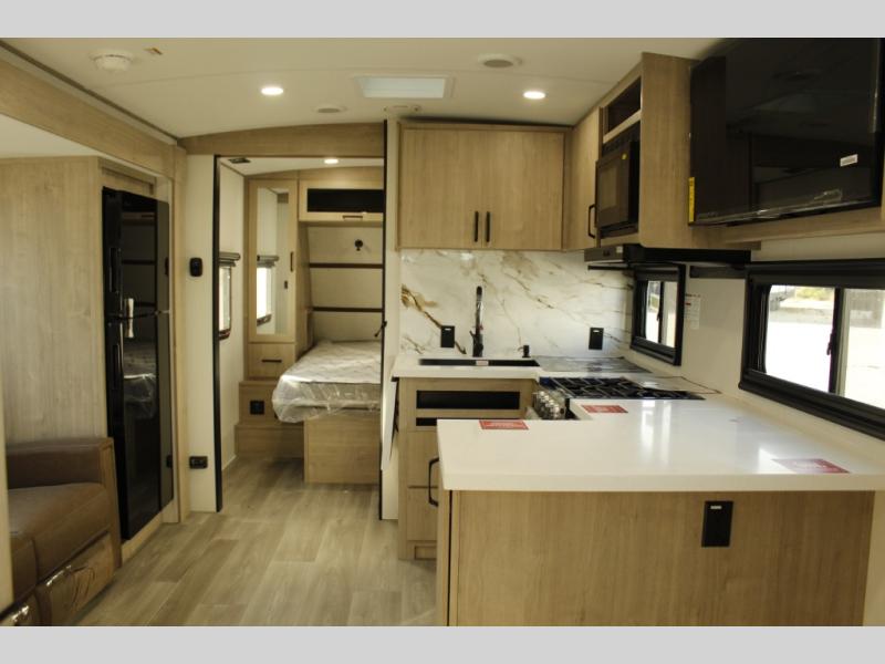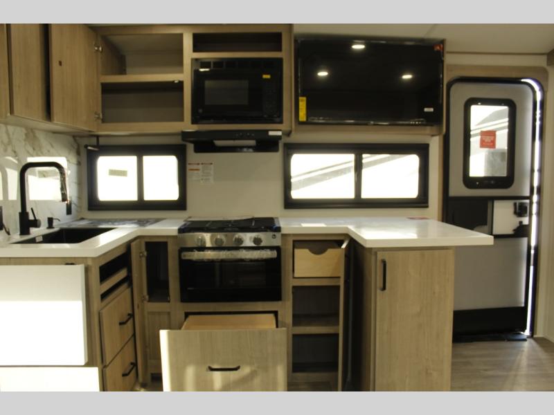 Escape to adventure with this fantastic travel trailer! The private bedroom features a plush 60" x 80" queen bed, spacious wardrobe, and TV prep for entertainment. The kitchen area is fitted with a pull-out pantry, 10 cu. refrigerator, microwave, and three-burner cooktop for gourmet meal prep. Enjoy extra counter space with the flip-up countertop extension, ideal for easy and comfortable cooking. Gather with family and friends at the theater dinette, featuring an LED HDTV for movie nights and game days after that, you can take a relaxing bath in the full rear bathroom, with ample storage. Stay organized on the go with pass-thru storage, 20” x 20” baggage door/trash can storage, and a spacious interior. Enjoy outdoor living under the shade of the 18’ awning, perfect for weekend getaways, or outdoor activities for the adventure-seekers.