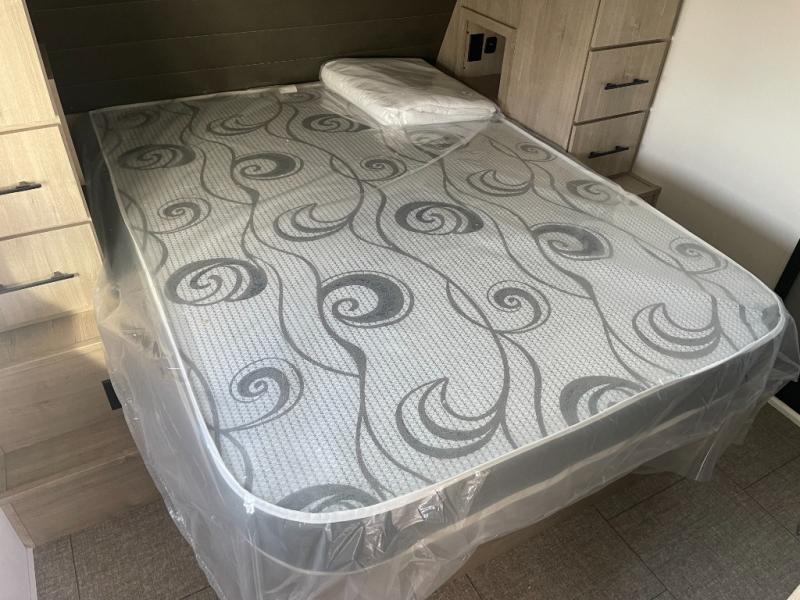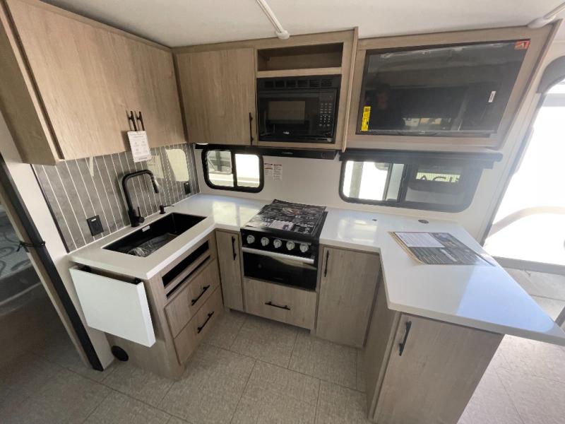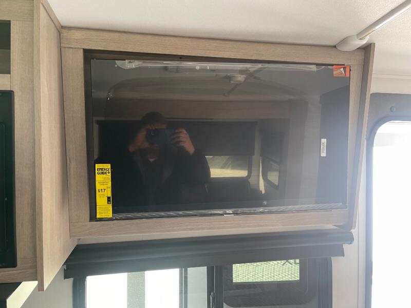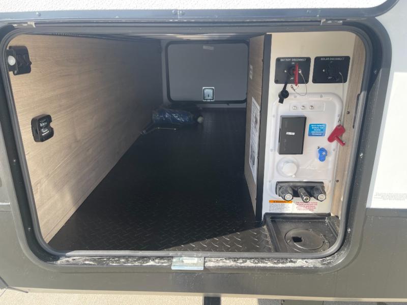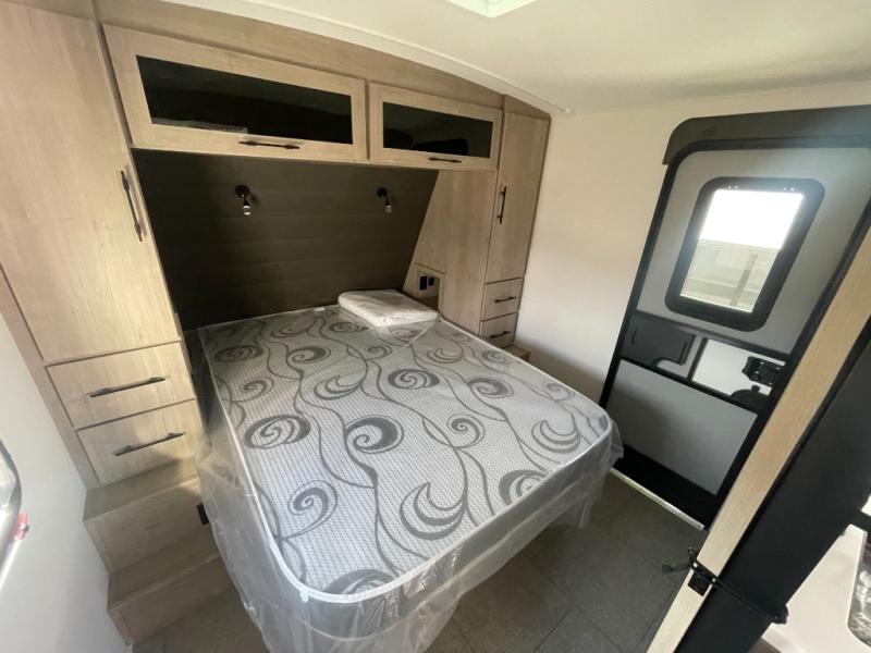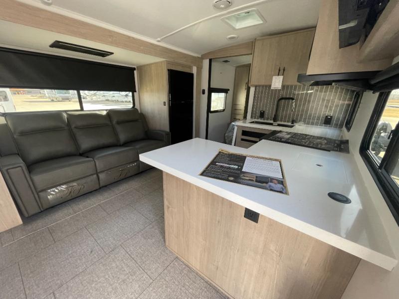 Escape to adventure with this fantastic travel trailer! The private bedroom features a plush 60" x 80" queen bed, spacious wardrobe, and TV prep for entertainment. The kitchen area is fitted with a pull-out pantry, 10 cu. refrigerator, microwave, and three-burner cooktop for gourmet meal prep. Enjoy extra counter space with the flip-up countertop extension, ideal for easy and comfortable cooking. Gather with family and friends at the theater dinette, featuring an LED HDTV for movie nights and game days after that, you can take a relaxing bath in the full rear bathroom, with ample storage. Stay organized on the go with pass-thru storage, 20” x 20” baggage door/trash can storage, and a spacious interior. Enjoy outdoor living under the shade of the 18’ awning, perfect for weekend getaways, or outdoor activities for the adventure-seekers.